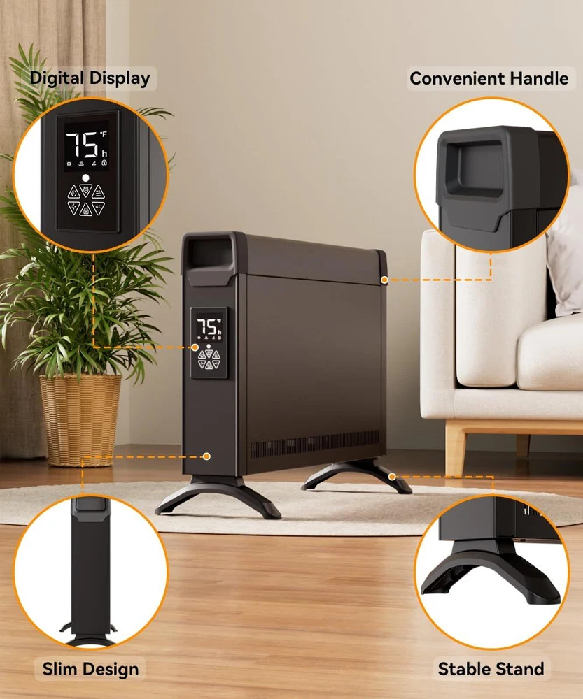 Fast & Efficient Convection Heating – Warmth in Seconds! Transform your space into a cozy haven with this convection heater. It heats medium to large rooms quickly and evenly, delivering floor-to-ceiling warmth in just 10-30 seconds—no cold spots! Perfect for consistent warmth all season long. Why wait for heat when you can feel it instantly? Fanless Heating – Quiet, Fast! Choose from 3 customizable modes to match your comfort needs. The heater provide quiet, fan-less heating—perfect for peaceful nights or you want to relax without noise. Quiet When You Need It, Powerful When You Want It! Space Heater – Comfort at Your Fingertips! Stay cozy all season long with the heater, designed for larger spaces and ultimate ease. Whether you're lounging or sleeping, the user-friendly control panel and included remote let you easily adjust your settings, thermostat, and even set a 24-hour timer—comfort at your command! Lightweight & Portable – Comfort Wherever You Go! With its convenient handle, you can easily move it from room to room—take it from the living room to the bedroom, or even your office, with zero hassle. Whether you’re working, relaxing, or sleeping, just enjoy warmth exactly where you need it, when you need it! Safety First – Peace of Mind with Every Use! Your safety is our priority! features advanced protection with tip-over and overheat protection, along with a flame-retardant power cord and built-in child lock to keep little hands safe. Warmth you can trust, all day, every day Details: Package includes: 1 x panel heater with feet, 1 x instruction. Overall Dimension: 22.6''L x 16.9''H x 3.7''W. Weigh 9.25 LB. Length of Power Cord: 6 ft. Power supply: 110-120 volts AC, 60Hz