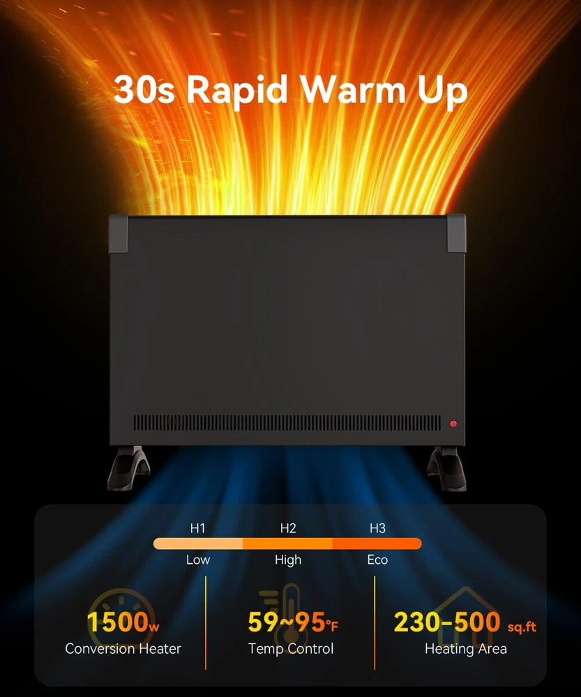 Fast & Efficient Convection Heating – Warmth in Seconds! Transform your space into a cozy haven with this convection heater. It heats medium to large rooms quickly and evenly, delivering floor-to-ceiling warmth in just 10-30 seconds—no cold spots! Perfect for consistent warmth all season long. Why wait for heat when you can feel it instantly? Fanless Heating – Quiet, Fast! Choose from 3 customizable modes to match your comfort needs. The heater provide quiet, fan-less heating—perfect for peaceful nights or you want to relax without noise. Quiet When You Need It, Powerful When You Want It! Space Heater – Comfort at Your Fingertips! Stay cozy all season long with the heater, designed for larger spaces and ultimate ease. Whether you're lounging or sleeping, the user-friendly control panel and included remote let you easily adjust your settings, thermostat, and even set a 24-hour timer—comfort at your command! Lightweight & Portable – Comfort Wherever You Go! With its convenient handle, you can easily move it from room to room—take it from the living room to the bedroom, or even your office, with zero hassle. Whether you’re working, relaxing, or sleeping, just enjoy warmth exactly where you need it, when you need it! Safety First – Peace of Mind with Every Use! Your safety is our priority! features advanced protection with tip-over and overheat protection, along with a flame-retardant power cord and built-in child lock to keep little hands safe. Warmth you can trust, all day, every day Details: Package includes: 1 x panel heater with feet, 1 x instruction. Overall Dimension: 22.6''L x 16.9''H x 3.7''W. Weigh 9.25 LB. Length of Power Cord: 6 ft. Power supply: 110-120 volts AC, 60Hz