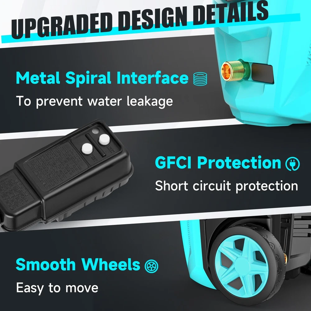 【POWERFUL HIGH PRESSURE WASHER】Generating up to 4300 pounds per square inch (PSI) of pressure with a flow rate of 2.8 gallons per minute (GPM), our electric power washer provide efficient and thorough cleaning a larger area in a shorter time. Efficient removal of multi year grime. 【4 DIFFERENT NOZZLES &FOAM CANNON】electric pressure washer with 4 quick connection nozzles(0°,15°,25°and 40°)0°delivers super pressure for concrete and bric with hard surface. 15° delivers high pressure for cleaning direways & hard surfaces. 25° tip delivers medium pressure for decks & wooden surfaces. 40° tip delivers low pressure for vehicles & windows. Soap tank can achieve foaming effect in an instant. 【UPGRADED HIGH PRESSURE HOSES】We have upgraded the high pressure hoses. New developed material to prevent kink when you wash for extra distance requirement, easy management, and roll-up. TIPS: Please lay flat to full length before using it, then it will be moved and store very easily. 【3 WATER-SUCKING WAYS】The electric high pressure washer can choose bucket self-priming water or pool self-priming. At the same time, you can also connect faucet self-priming. (connect faucet not included) 【UPGRADED DESIGN DETAILS】This pressure washer attaches a 35-foot power cord with inline GFCI for use.It helps you control and check the power using. In addition, this electric pressure washer adopts metal spiral interface design to prevent water leakage and we have also upgraded the handle to make it be more humane. 【PROFESSIONAL AFTER-SALES SERVICE】Our customer support team is available 24/7 to address any questions or concerns you may have within 24 hours.