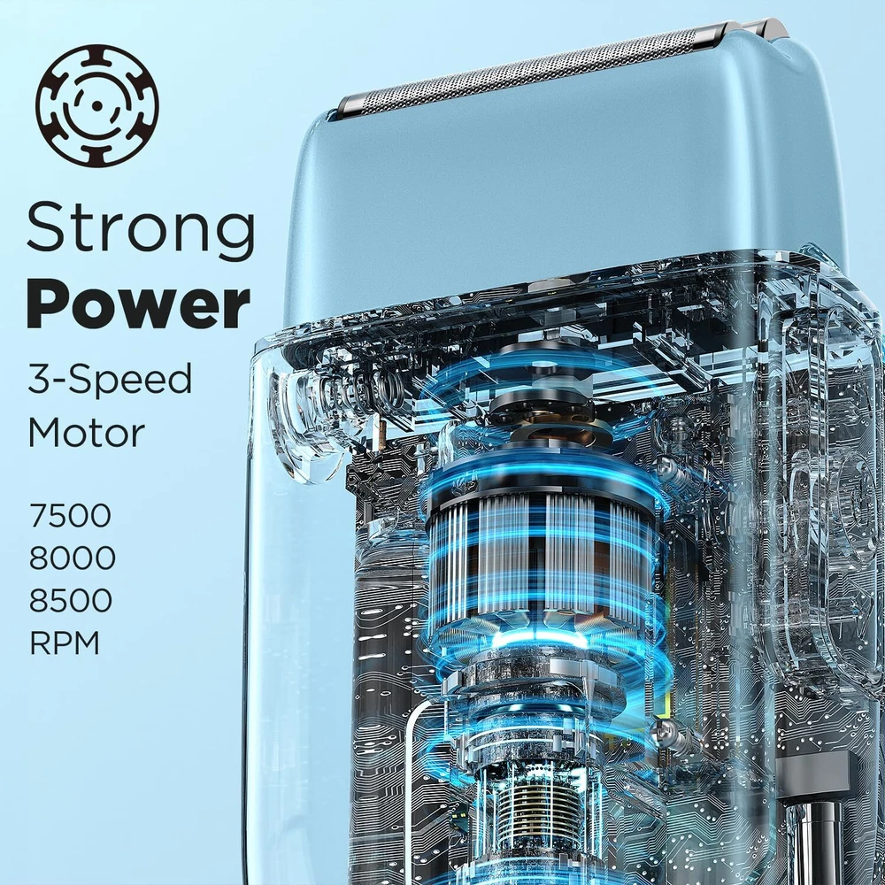 FLEXIBLE FLOATING SHAVER:Our Electric Razor adopting ergonomic design and multi angle adjustment; The shaver adapts to your unique face contours to deliver a close shave while also protecting your skin and achieve perfect shave; ensuring that more hair can be removed every time shaving; Enjoy a smooth; comfortable and snug shaving experience 3 SPEED STRONG MOTOR: Our Electric Shaver for Men is equipped with a powerful high-speed motor with 3 adjustable speeds (7500/8000/8500 RPM); which can perform up to 20000 cutting actions per second. The shaver's powerful motor can shaver different beard hardness and Makes shaving Efficient & Comfortable; providing you with a cleaner shaving effect CURVED SHARP DOUBLE KNIFE:The foil shaver adopts curved precision steel blades; quickly cutting off long and short beards; The curved mesh provides protection for the skin and minimizes irritation to the greatest extent possible; Our shaver adopts intelligent sensing technology to effectively prevent hair pinching, bringing you a comfortable and smooth shaving experience every time IPX7 WATERPROOF & WET/DRY USE:Our electric shaver is fully IPX7 waterproof; We recommended softening the stubble with shaving foam first for a thorough shave; Enjoy a comfortable dry shave or a refreshing wet shave with shaving foam; The washable shaver head allows you to easily clean directly under the tap; which is easy to operate SHAVING EXPERTS AND IDEAL PRESENT:Our Men's shavers are designed with fashion; perfect for giving to husbands; fathers; sons and boyfriends on any day