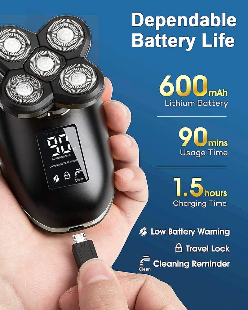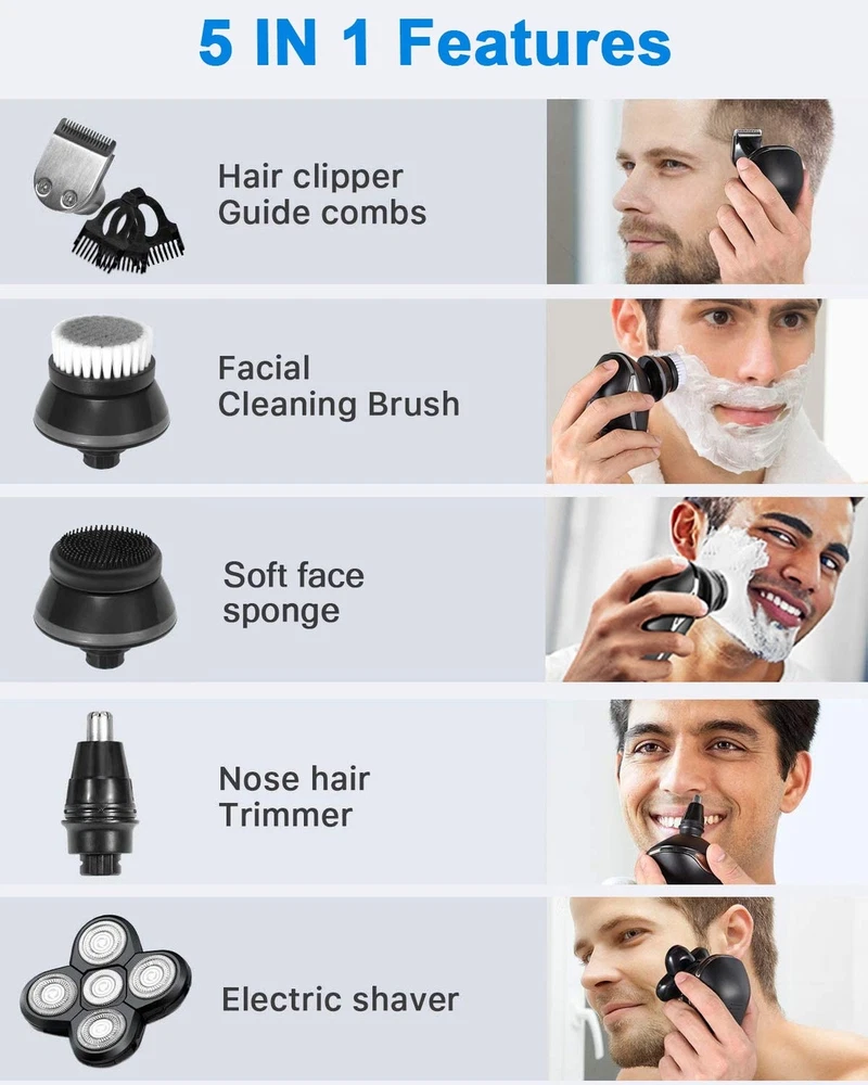 Electric Razors for Women - Head Shavers for Bald Men, Wet/Dry 5D Razor with USB Adapter & Charging Cable,5D Rechargeable Rotary Shaver, Grooming Kit Product Details Color: Black 1 Brand: TAYAYO MPN: TMQ035 UPC: 745431408413 EAN: 0745431408413 Brand: TAYAYO Special Feature: rechargeable, travel_lock, lightweight Power Source: Battery Powered Included Components: Cleaning Brush, Battery, Attachment Battery Life: 90 minutes Package Dimensions : 6.02 x 5.47 x 3.58 inches; 14.89 ounces Batteries : 1 Lithium Ion batteries required. (included) Date First Available : August 23, 2023 Manufacturer : DongGuanShiRunxianShangmaoYouxiangongsi Country of Origin : China 5 in 1 Womens&Men Grooming KitThe electric shaver grooming kit includes 5D women&men rotary shaver, hair clipper (with 3-5-7 mm guide combs), nose hair trimmer, facial cleansing brush, facial silica gel brush, meets any body shaving, grooming and cleansing needs, enjoy hair-free smooth skin without irritation. Smooth and Closer Shaving5D flex heads automatically adapt to the contours of your head, face, neck and jaw, providing you a comfortable and close shave. Rechargeable Shaver for Women&MenThis hair trimmer is rechargeable- you'll never have to worry about running out of batteries. The lithium-ion battery provides up to 90 minutes of shaving time and be quickly recharged with the included USB adapter and cable. Shave Wet or DryWith upgraded IPX7 waterproof technology, the whole shaver could be soaked in water as long as 30 minutes(but we don't suggest do this), you could enjoy shaving in the shower. Perfect GiftSmall and lightweight, unique travel lock design,; Nice package as a gift for your family to use at home or travelling.