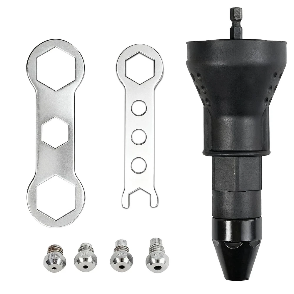 What you get: 1 x Rivet adapter 2 x Wrench Attention: The power tool is NOT included. The rivet does NOT apply to the drill with impact function. 1cm = 0.39in = 10mm, 1in = 2.54cm = 25.4mm. 1%-3% size difference is allowed cause measured by hand. Due to the different monitors, the picture may not reflect the actual color of the item. Usage: (Pick the right size opening for your rivet, there are 4 to choose from. ) ღ Attach the tool to cordless drill. ღ Hold the tool, before it starts to grab the rivet, hit reverse on your drill until you feel click. The rivet can be fitted in once the teeth widen. Put the rivet in the tool and slowly hold the handy part of the tool and pull the drill trigger, when you feel it start to grab the rivet. ღ Put it in the hole that you wish to rivet and keep holding the handy part and hit the drill at full. ღ Once the rivet pops, keep holding the handy part of the tool and hit reverse on your drill. ღ The teeth will widen and the old rivet shaft will drop to the ground. Put your drill back in the forward position and rinse and repeat. Details: ♥ Function: riveting ♥ Material: plastic + metal ♥ Big wrench: 13.5cm/5.35"" ♥ Small wrench: 10cm/3.94"" ♥ Working with power drill: ≥1.5N.m ♥ Riveting tool: 16 x 5.8cm/6.30"" x 2.28"" ♥ Nozzle size: 2.4mm, 3.2mm, 4.0mm, 4.8mm "