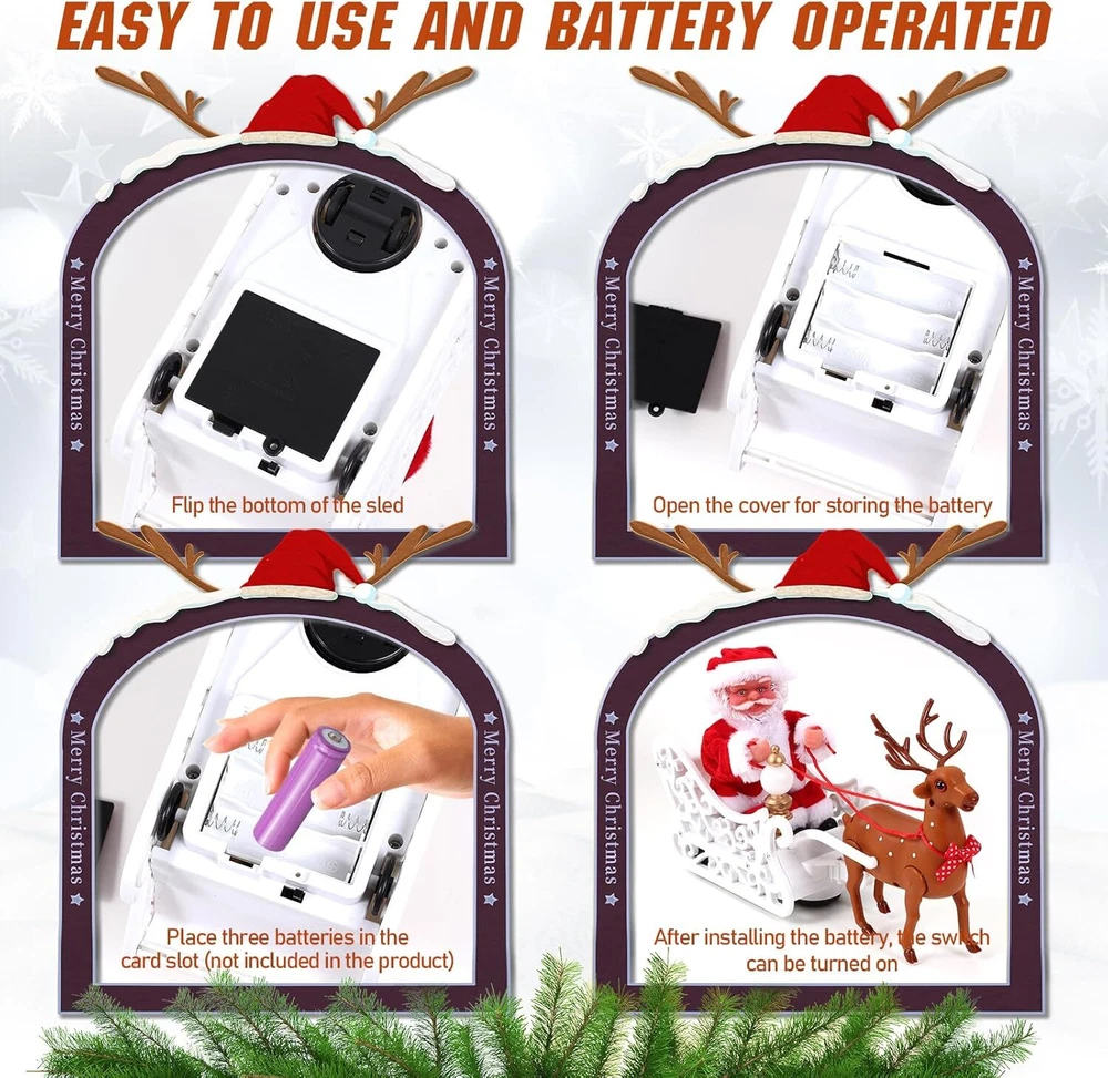 Electric Santa and Reindeer Sleigh Toys,Singing and Dancing with Jingle Bell Rock,Christmas Decor with Music and Lights,Fun Gift Product Details Product Dimensions: 11.8 x 3.9 x 7 inches Item Weight: 13.7 ounces Country of Origin: China Manufacturer recommended age: 3 years and up Batteries: 3 AA batteries required. Manufacturer: Gfilay 【Sleigh Elk Christmas Toy Decor】: This adorable dancing christmas toy decor features a singing and dancing Santa Claus on a sleigh pulled by reindeer. When you press the button, Santa Claus will sing the classic Christmas song “Jingle Bell” and sway his body along with the music. The reindeer will also move their heads and antlers in sync with the song. The sleigh has LED lights that flash in different colors, creating a festive atmosphere.The reindeer take steps to pull Santa Claus to bring you Christmas blessings. 【Christmas Santa Claus Musical Toy 】: This cute santa musical toy is a perfect addition to your Christmas decorations.It can be placed under the Christmas tree,on the fireplace,on the table,or anywhere you want to add some holiday cheer. When you press the button, animated santa claus will drive his sleigh pulled by reindeer and sing “Jingle Bell” as he moves forward, as if he is going to deliver gifts to you. Santa and reindeer will keep driving in circles and will self-correct its route when it hits an obstacle.Santa can attract children's attention and is a loyal playmate for children. 【Christmas Santa Claus Musical Toy】:The battery compartment for the Santa Sleigh toy is located at the bottom of the sleigh.You need to install 3*AA batteries(not included) to power musical Santa Claus.Flip the switch at the end of the sleigh, and the animated reindeer will keep pulling Santa and the sleigh away.Keep walking and singing within your allowed range and shake his body along the way.The antics of the Santa musical toy made everyone laugh. 【Animated Christmas Decorations】:Santa sleigh and reindeer indoor decorations comes with an exquisite gift box,the dressed-up flying reindeer and the cute dancing singing Santa are very popular with everyone.Whether as a children's toy or as a holiday gift for family and friends,musical xmas toys is an excellent Christmas gift.The musical talent and charm of Christmas will definitely impress your guests. 【Talking Christmas Decorations】:The toy Santa sleigh and reindeer can be placed as Christmas decorations under the Christmas tree,on the fireplace or on the desk,anywhere you want to add festive joy,the singing Christmas plush toys bring more surprises and joy to children, and are also great Christmas home decorations for your family or office.