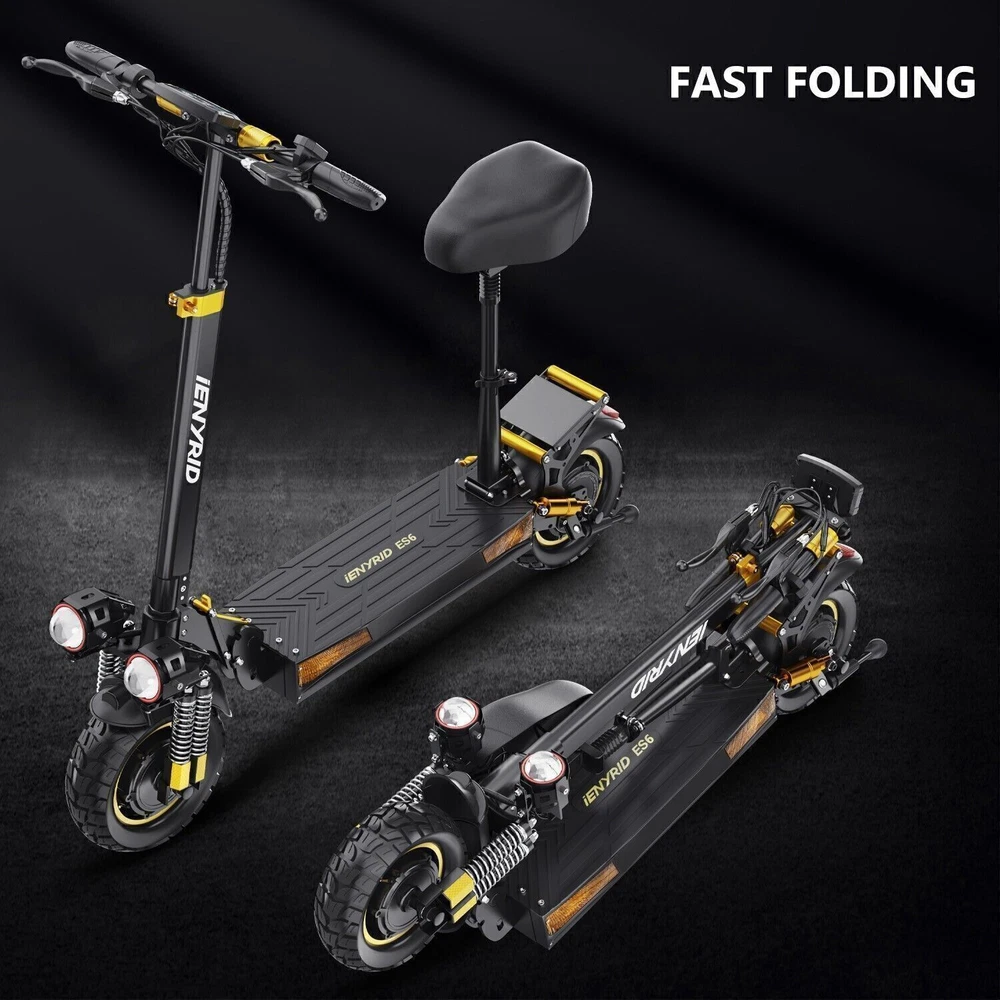 2OOOW Adults Electric Scooters 1OOOW Dual Motors Drive 48V Max Speed 37Mph Long Rang Fast 28-34Miles Commute Off Road E-Scooter 2023 Upgraded iENYRID Electric Scooter ES6 Foldable Electric Scooter comes with a 960Wh (48V 20.8Ah) battery assisting 28-34 miles cruising range. ES6 becomes an excellent choice for high-quality and comfortable riding. It is suitable for commuting to work, shopping in supermarkets, mountain cross-country and traveling. Powerful Motor & Long Lasting Battery ES10 electric scooters f With powerful Dual 1OOOW Motors, detailed parts, detachable seat and foldable design,, brings faster acceleration and climbing ability to this electric scooter, which can reach 35 mph max and max 30°climbing angle. Comfortable Commuting IENYRID ES10 adult off road electric scooter comes with upgraded 10-inch off-road tires and front and rear dual suspension to ensure max comfort even on bumpy roads. Also, the aviation-grade aluminum frame is stronger and lighter, which makes the scooter much more elegant to look at and handle as well. And it has a max load of 280 lbs. Foldable Electric Scooter Easy to fold and carry, carry it on public transportation or store it in your car to get to wherever you want. Dynamic, Easy storage in car trunks and other compact spaces, occupying little space and suitable for travel and transportation commute. IPX5 Super Waterproof & LED Intelligent Lighting System The waterproof frame and deck are tightly sealed against water, accredited with an IPX5 ingress protection rating painting. The head of the e scooter is equipped with three LED lights with different functions to ensure safe and worry-free riding at night. Specification: Model: iE-ES6 Battery: 48V / 20.8Ah(Shenzhen Chuangxingyuan and Dongmag A-grade batteries) Power: 1OOOW x 2 (40*3mm magnet Dual Motors) Display Screen: Color Max Speed: 34Mph Range: 24-34Miles Max Load: 120 KG Tire Size: 10 inch Tire Type: Off-road Air Tires (Front and rear 10-inch pneumatic off-road tires) Charging Time: 7-9 hours Frame Material: Aluminum Alloy Net Weight: 30.34 KG Gross Weight: 35 KG Package Size: 48.2 x 10.2 x 20.7 inch Brake: Front and Rear Disc Brake Light: Front LED Headlights, Cornering Lamp, Sidelights, and Taillights (One-piece headlight, built-in speaker, side red, green and blue colored lights, rear brake lights, front and rear turn signals with running water, with spotlight function (waterproof connector for headlight and tail light)) Adapter: Input: AC 100-240V ~ 50/60Hz 1.5A, Output: 54.6V 2.0A Note: The maximum load capacity is the maximum weight that the scooter can withstand. Instrumentation: ① Yongkang Zhe whale black and white screen instrument (do waterproof connector) ② Function: NFC card brush instrument screen boot (with 2 NFC card), public mileage switching, 5 minutes of automatic resting screen, free to lift the speed limit, cruise control, a single mileage and total mileage clearing, zero-start (power on the display of 0 gears), fault code prompts, the stall stall display Frame: Aluminum frame Finger Pivot: Acceleration finger pivot is uniformly mounted in the right hand direction Pedals: Black one-piece pedals (brand logo printed) Brakes: front and rear power-off disc brakes, left and right e-brake lines with waterproof connectors. Seat Bag + Carrying Handle: Sponge memory seat (seat bag + base packaged as accessories, carrying handle installed in the E-Scooter) Risers: round risers with fixed latches Reflector: white front + yellow side + red rear Speed: factory set speed limit according to European regulations (maximum speed of 15.53Mph before unlocking, speed of 6.21/9.32/15.53Mph in three gears), the instrumentation needs to be equipped with a function that can be unlocked (maximum speed of 34Mph after unlocking, speed of 12.43/21.75/34Mph in three gears) Pure electric range range 27.96Mph~40.39Mph Max speed may vary depending on the rider's weight, riding style, ambient temperature, battery level, and terrain. This list breaks down the key specifications and details of the iE-ES6 scooter. Package Contents: 1 x Charger 1 x User Manual 1 x Electric scooter ''Warning: It is illegal to ride electric scooters on public roads (except under very specific circumstances), pavements or cycle paths. They are intended only for use on private land with the owner’s permission.''