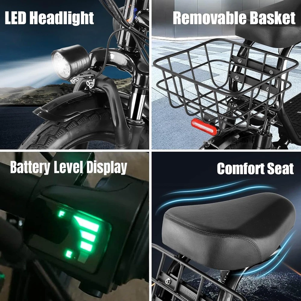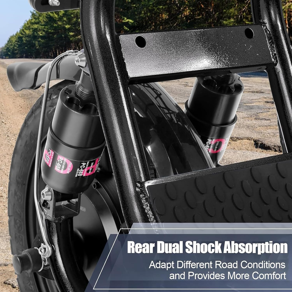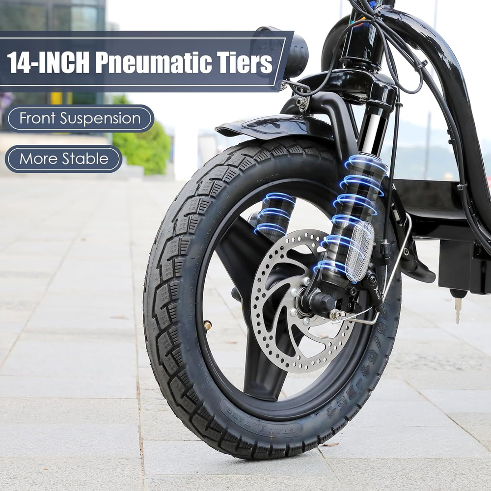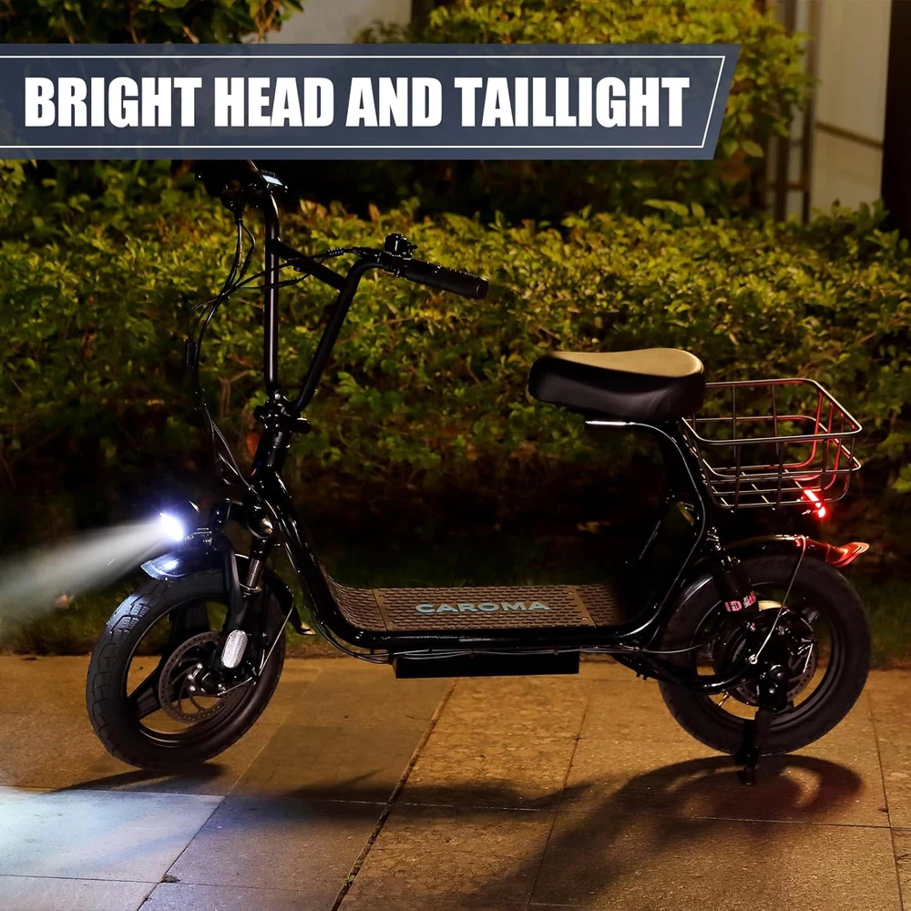 🛴【Peak 1200W Motor & 500Wh Battery】: Caroma P5 electric scooter is powered by a robust 750W(peak 1200W) motor, reaching top speeds of 20 mph and handling 20% hill grades with ease. Its high-capacity 500Wh lithium battery, enhanced by regenerative braking, provides a remarkable range of up to 30 miles. Perfect for commuting or leisure rides, this adult electric scooter offers unparalleled versatility and high performance. 🛴【Dual Shock Absorption & Large 14" Tires】The adult electric scooter features multiple shock absorption , including front and rear shock absorber and soft wide seat, significantly reducing discomfort. Its 14" pneumatic tires provide excellent grip, high elasticity, and wear resistance. The extra-wide deck makes long rides enjoyable and effortless. 🛴【Portable and Durable Travel Partner】: Equipped with foldable handlebar, the e scooter can be easily stored and carried in your trunk, you can ride it anytime you like. The aluminum frame of this electric scooter is strong and durable, which can support a maximum weight of 300 pounds. The large capacity basket is prefect for shopping trips and short errands around the block. 🛴【LCD Display & Safe to Ride】: The LCD monitor shows the battery level of the e scooter, so you can get a clear picture of your riding. The effective front and rear disc brake on the e-scooters provide excellent stability and control. The high-brightness headlight and rear brake light keep your riding safe at night. 🛴【Easy Assembly & After Sales Service】: This electric scooter is UL 2272 certified. Only the seat and the basket attachment needed to be assembled after the 2 wheel electric scooter for adults arrives. We provide a 12-month warranty for the E scooter. If you encounter problems using the product, please refer to the manual. If the problem cannot be solved, feel free to contact our customer service. scooter