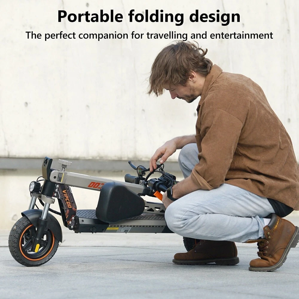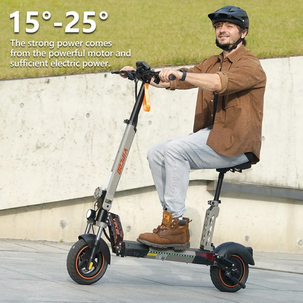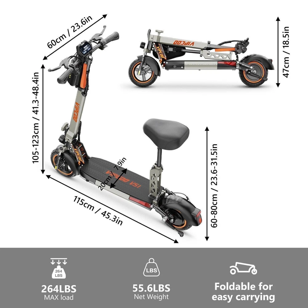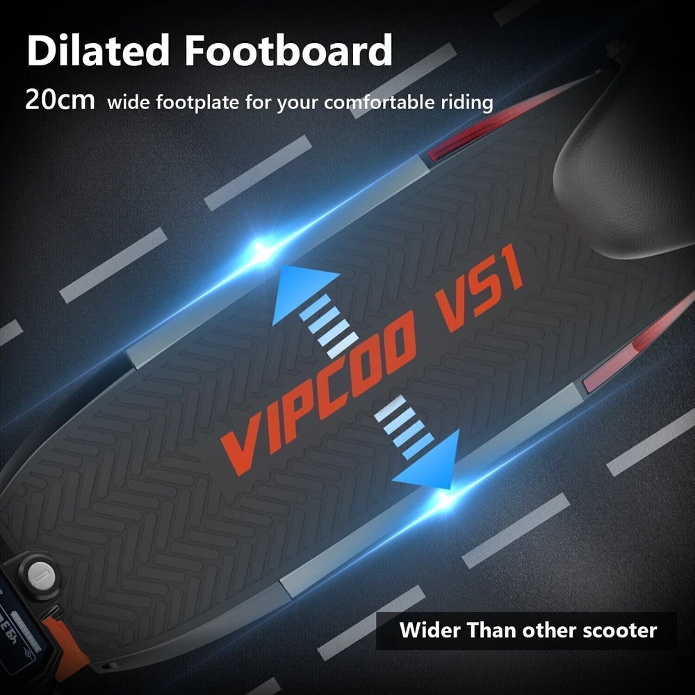 Product Description Model: VIPCOO VS1 Battery: 48V/13Ah Power: 700W Display Screen: Digital display Max Speed: 28 MPH (45 KM/H) Range: 19 Miles (20-30 KM) Max Load: 265 lbs (120 KG) Tire Size: 10 inch Tyre Type: Off-road air tires Charging Time: 6-8 hours Frame Material: Aluminum alloy Net Weight: 25.2 KG Gross Weight: 29.5 KG Package Size: 122.5 × 23.5 × 52 cm Brake: Front and rear disc brakes Light: Front LED headlights, side lights, and taillights Adapter: Input: 100-240V~50/60Hz 3.0A Max, Output: 54.6V 2.0A Additional Notes: The max load capacity is the maximum weight the e-scooter can withstand. Max speed & range may vary depending on the rider's weight, riding style, ambient temperature, battery level, and terrain. Package contents: 1 x Electric scooter. 1 x Instruction 1 x Tool set. 1 x Main charger. 🛴A new option that allows you to freely across the city - Our New VS1 Adult Electric Scooter with Seat which is with powerful battery(48V 13Ah), makes it easier for you to complete daily travel, and one charge is enough for you to ride for 15-45 miles under specific conditions. 🛴Let You Ride As You Want, Easy to Drive - Our New VS1 Escooter has three different riding modes (Eco: 9Mph, D: 18Mph, S: 28Mph), you can choose the most suitable mode for you according to your needs, and the 700w powerful high brushless motor allows you ride speed up to 28Mph, and handle all kinds of road conditions with ease! 🛴Comfortable Riding Experiences, Let You Enjoy Every Trip - Our New VS1 Electric Scooter for Adult adopts front and rear wheel suspension system and 10inch pneumatic tires, which means you can enjoy a smoother and more comfortable riding experience, even on rough roads! 🛴Make Your Safety More Secure - Our New VS1 Escooter for Adult is not only equipped with super bright headlight & taillight, but also has a side ambient light, which improves the safety of night riding and allows you to travel with peace of mind at any time. The perfect front & rear dual brakes and electronic braking system allow you to stop whenever you want. 【Important Note】- The max speed and max range of per full charged vary based on a lot factors, including: rider's weight, riding surface, incline, ambient temperature, battery level, riding style (stop/start vs cruising), wind direction, wind speed etc “Warning: It is illegal to ride electric scooters on public roads, pavements, or cycle paths. They are intended only for use on private land with the owner’s permission. See Guidance for local areas and rental operators of e-scooters.{e253595-1081650x} Our product: (1) Our product approved by UL2272/CE/ROHS certificates (2) Every piece of spare part will be inspected before assembling and very piece of completed product will be tested before shipment. Electric Scooter For Adult 24OOW Motor 37Miles Range,10-Inch Off-Road Tire 37mph 1078.0 USD Free shipping AOKDA-A1 Electric Scooter for Adults Teens Folding E-Scooter Commuter 48V/12.5Ah 250.38 USD 357.69 USD 39.99 USD 30% off 600W Electric Scooter Adults Teens Folding E-Scooter with Seat 48V/10AH 45Km/h 497.17 USD 599.0 USD Free shipping 17% off iENYRID 24OOW Dual Motor Electric Scooter Adult 10" Off-Road Tires + Seat 48V US 1200.0 USD Free shipping powered by