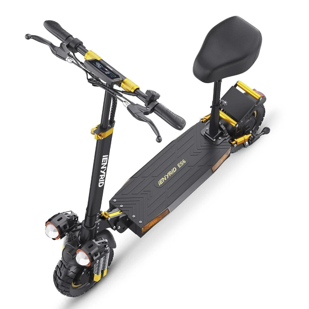 2OOOW Adults Electric Scooters 1OOOW Dual Motors Drive 48V Max Speed 37Mph Long Rang Fast 28-34Miles Commute Off Road E-Scooter 2023 Upgraded iENYRID Electric Scooter ES6 Foldable Electric Scooter comes with a 960Wh (48V 20.8Ah) battery assisting 28-34 miles cruising range. ES6 becomes an excellent choice for high-quality and comfortable riding. It is suitable for commuting to work, shopping in supermarkets, mountain cross-country and traveling. Powerful Motor & Long Lasting Battery ES10 electric scooters f With powerful Dual 1OOOW Motors, detailed parts, detachable seat and foldable design,, brings faster acceleration and climbing ability to this electric scooter, which can reach 35 mph max and max 30°climbing angle. Comfortable Commuting IENYRID ES10 adult off road electric scooter comes with upgraded 10-inch off-road tires and front and rear dual suspension to ensure max comfort even on bumpy roads. Also, the aviation-grade aluminum frame is stronger and lighter, which makes the scooter much more elegant to look at and handle as well. And it has a max load of 280 lbs. Foldable Electric Scooter Easy to fold and carry, carry it on public transportation or store it in your car to get to wherever you want. Dynamic, Easy storage in car trunks and other compact spaces, occupying little space and suitable for travel and transportation commute. IPX5 Super Waterproof & LED Intelligent Lighting System The waterproof frame and deck are tightly sealed against water, accredited with an IPX5 ingress protection rating painting. The head of the e scooter is equipped with three LED lights with different functions to ensure safe and worry-free riding at night. Specification: Model: iE-ES6 Battery: 48V / 20.8Ah(Shenzhen Chuangxingyuan and Dongmag A-grade batteries) Power: 1OOOW x 2 (40*3mm magnet Dual Motors) Display Screen: Color Max Speed: 34Mph Range: 24-34Miles Max Load: 120 KG Tire Size: 10 inch Tire Type: Off-road Air Tires (Front and rear 10-inch pneumatic off-road tires) Charging Time: 7-9 hours Frame Material: Aluminum Alloy Net Weight: 30.34 KG Gross Weight: 35 KG Package Size: 48.2 x 10.2 x 20.7 inch Brake: Front and Rear Disc Brake Light: Front LED Headlights, Cornering Lamp, Sidelights, and Taillights (One-piece headlight, built-in speaker, side red, green and blue colored lights, rear brake lights, front and rear turn signals with running water, with spotlight function (waterproof connector for headlight and tail light)) Adapter: Input: AC 100-240V ~ 50/60Hz 1.5A, Output: 54.6V 2.0A Note: The maximum load capacity is the maximum weight that the scooter can withstand. Instrumentation: ① Yongkang Zhe whale black and white screen instrument (do waterproof connector) ② Function: NFC card brush instrument screen boot (with 2 NFC card), public mileage switching, 5 minutes of automatic resting screen, free to lift the speed limit, cruise control, a single mileage and total mileage clearing, zero-start (power on the display of 0 gears), fault code prompts, the stall stall display Frame: Aluminum frame Finger Pivot: Acceleration finger pivot is uniformly mounted in the right hand direction Pedals: Black one-piece pedals (brand logo printed) Brakes: front and rear power-off disc brakes, left and right e-brake lines with waterproof connectors. Seat Bag + Carrying Handle: Sponge memory seat (seat bag + base packaged as accessories, carrying handle installed in the E-Scooter) Risers: round risers with fixed latches Reflector: white front + yellow side + red rear Speed: factory set speed limit according to European regulations (maximum speed of 15.53Mph before unlocking, speed of 6.21/9.32/15.53Mph in three gears), the instrumentation needs to be equipped with a function that can be unlocked (maximum speed of 34Mph after unlocking, speed of 12.43/21.75/34Mph in three gears) Pure electric range range 27.96Mph~40.39Mph Max speed may vary depending on the rider's weight, riding style, ambient temperature, battery level, and terrain. This list breaks down the key specifications and details of the iE-ES6 scooter. Package Contents: 1 x Charger 1 x User Manual 1 x Electric scooter ''Warning: It is illegal to ride electric scooters on public roads (except under very specific circumstances), pavements or cycle paths. They are intended only for use on private land with the owner’s permission.''