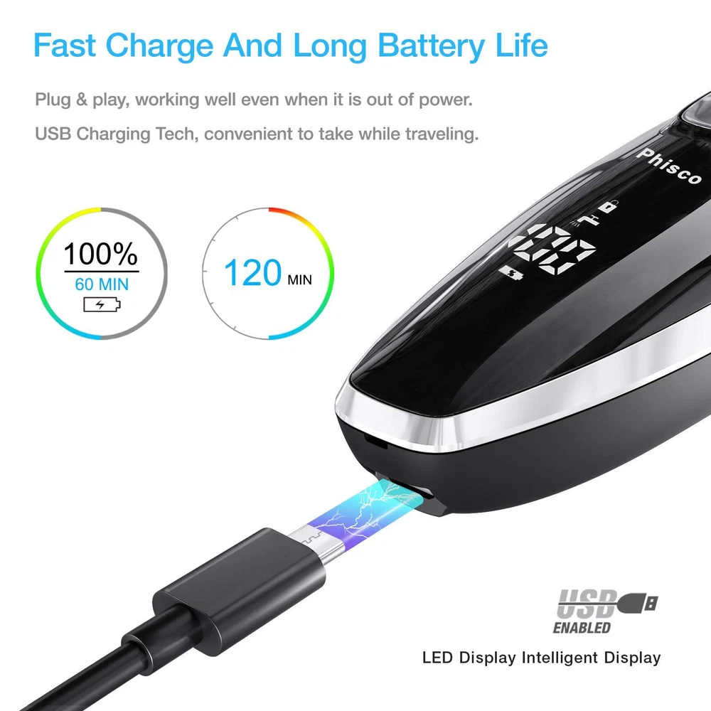 【3D Razor Heads & Pop-up Trimmer】The electric razor head is made by Double-track Ultra Thin Spherical Cutter Net and Self-sharpening Steel Blade, Increases the Wider Contact Surface than Single Track, Delivers a More Smooth, Close and Sharp Shave. It can float in 4 directions and automatically adjust to your face, neck, and even the contour of the jaw. The Pop-up Trimmer Easy one push to open, perfect for sideburns, mustaches. 【Wet and dry, IPX7 Waterproof】The electric shaver has an IPX 7 waterproof rating. Therefore, you can enjoy it with gel or foam in the shower to get a better shaving effect. In addition, it is very convenient to clean under running water. 【USB charging & LED display】It takes 1 hour to fully charge the electric shaver through the USB cable, and it can be used for 120 minutes of shaving. The USB data cable is very portable for charging, allowing you to charge your electric shaver anytime, anywhere. The LED digital display can inform you of the percentage of remaining power for you to check. Convenient and suitable for your daily and travel use. 【Intelligent System】 When the battery is low, the LED display of the electric shaver razor for men will prompt you to charge. When the electric razor for men is in use, the remaining available time will be displayed on the display screen. When the electric razor appears a small "faucet" icon on the body reminds you to clean the electric razor. When you press and hold for 3 seconds which will lock the electric razor to prevent accidental touch. 【Multifunctionality】The Electric Shaver Razor is equipped with a 3D floating shaving head and a pop-up beard trimmer, catering to the diverse needs of users whether for dry shaving or wet shaving. High-Quality Materials: The shaver is fitted with stainless steel blades, ensuring durability and sharpness for a clean and precise shaving experience. Portability and Travel-Friendly: The shaver is designed to be lightweight, making it an ideal choice for users who travel frequently or are often on the go. Long Battery Life: With USB quick charging and a long-lasting battery, the need for frequent recharging is reduced, making it more convenient to use. Men's Electric Shaver with Floating Rotary Razor, IPX7 LED Display, Rechargeable Dry/Wet Men's Shaver, with Pop-Up Beard Trimmer, Ideal for Father's Day Gifts.