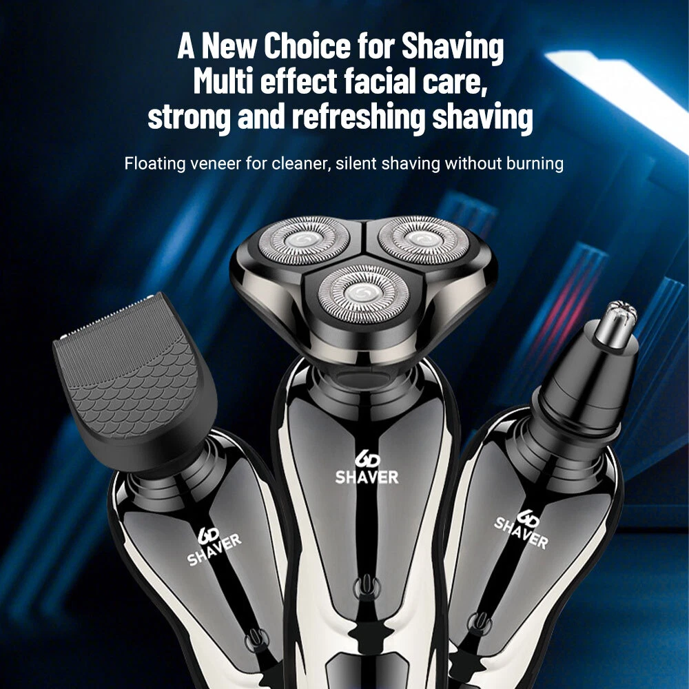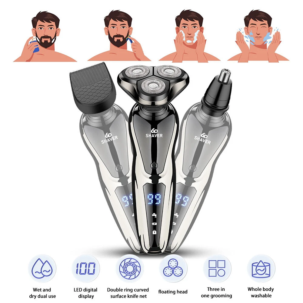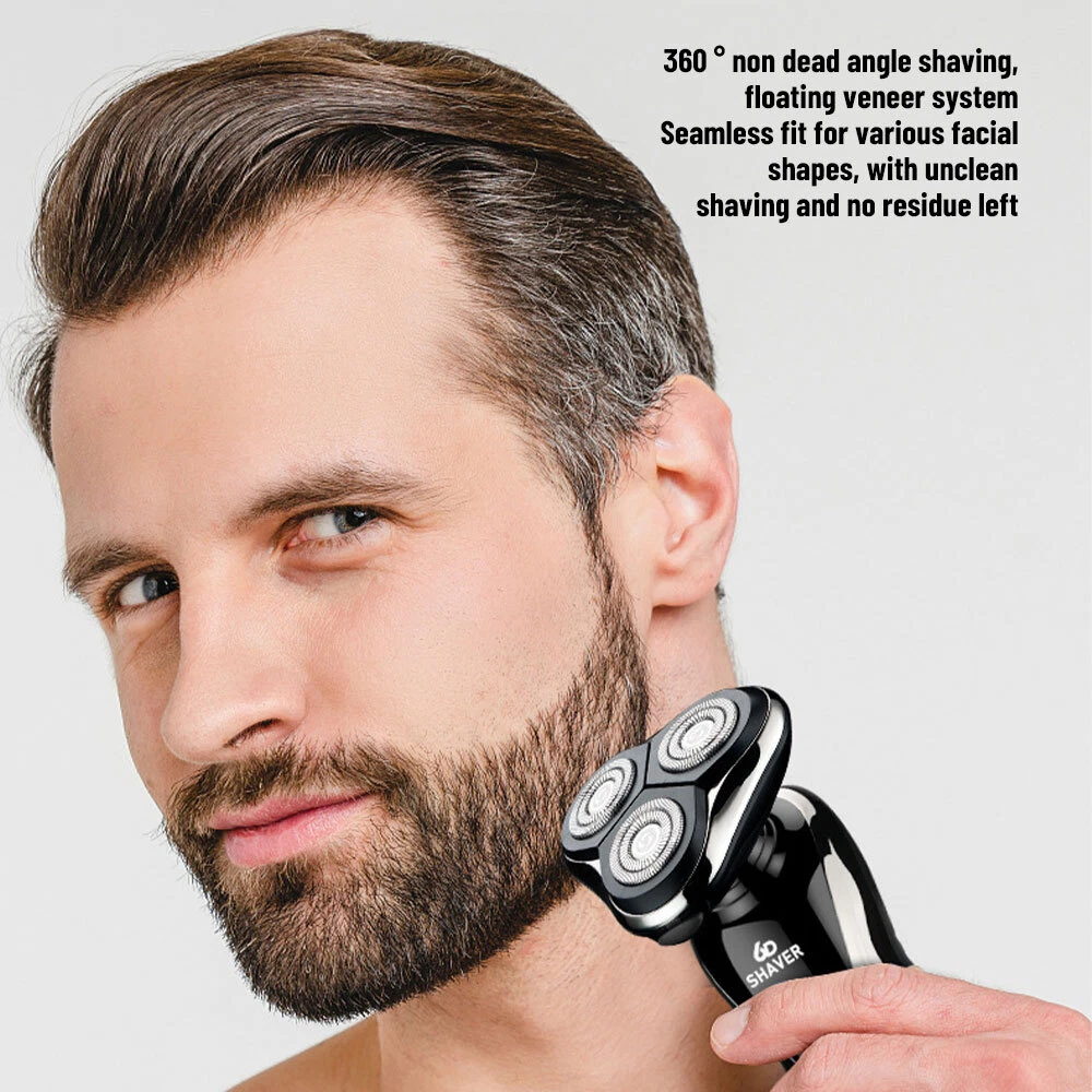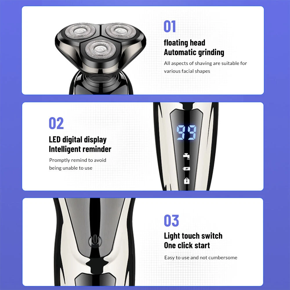 Specification Product features: full body wash, LED display, floating head Shaving head: rotary 3-heads Cleaning method: removable heads for washing Charging mode: USB charging Motor type: brushless motor Duration: about 90 minutes Built-in battery capacity: 1200mAh-2000mAh (including) Whether built-in: battery built-in battery Product noise: 36-45db Features: 1.Smart induction shaver with large LCD display and 3 replaced head. Easily adjust the mode you need. 2.The shaver with automatic reminder cleaning function, which can better protect the product.It also has an intelligent travel lock function to make it more secure. 3.The IPX6 body is waterproof and allows you to use the electric shaver whether wet or dry including even in the shower. It easily adapts to either shaving foam or gel for a better and closer shaving experience 4.Rotary electric shaver,perfectly adapts to the contours of the Face, Neck and even the Jaw for a more comfortable and close shave,minimizing pressure and irritation, provides you a more comfortable, smooth and close shaving experience. 5.Dual-track cutter gently conform to facial contours, for enhanced shaving comfort. 6.With automatic grinding technology and blades self-sharpening, which will not pull the beard or damage skin. Package Include: Groomer *1 Nose Hair Trimmer *1 Cheek trimmer *1 USB cable *1 Cutter head cover *1 Cleaning brush *1 English manual *1