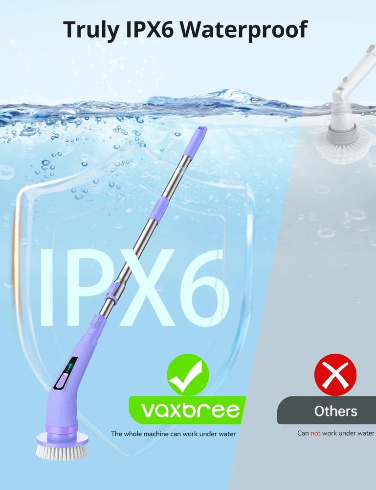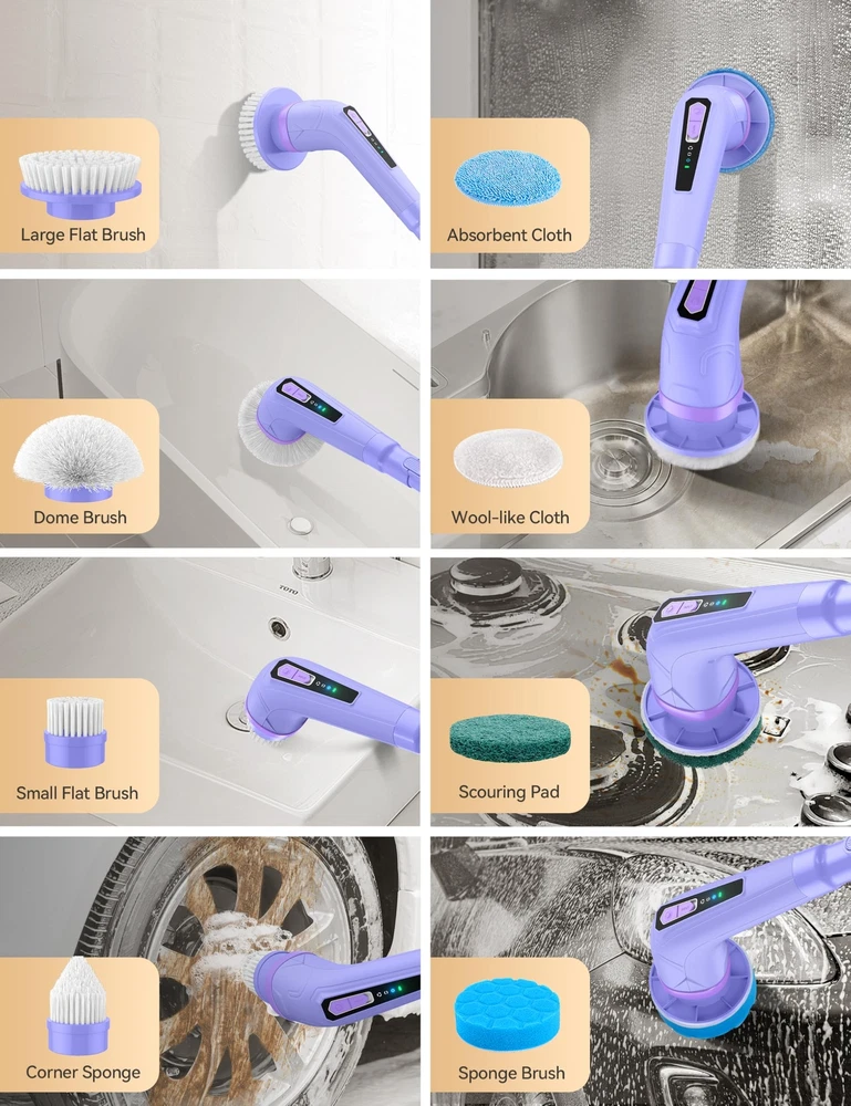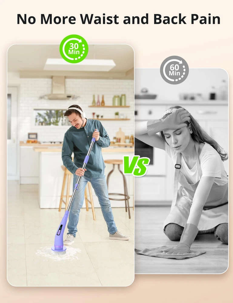 Multi-Functional Cleaning Tool: Spin Scrubber is a versatile and powerful cleaning brush that excels at tackling various cleaning tasks. Whether you need to remove limescale in the bathroom, clean tiles and floors, or even clean your car's interior and exterior, Shower Scrubber's 8 interchangeable accessory brush heads are designed for specific surfaces or types of dirt, making it adaptable to any cleaning task. Powerful and Adjustable Design: With its cordless and powerful motor, Electric Spin Scrubber offers superior cleaning ability to effectively remove stubborn stains and dirt. It features three adjustable speed settings (320RPM, 370RPM, 420RPM), allowing you to customize the cleaning intensity based on your needs. From gently cleaning delicate surfaces with the low speed setting to tackling the most stubborn dirt with the high speed setting, Bathroom Scrubber provides maximum cleaning performance. Plus, with a 150-minute battery life(2500mAh) and 4H fast charging(Type-C), you can clean without interruption. Ergonomic and Adjustable Length: Designed with user comfort in mind, bathtub scrubber has an adjustable handle length ranging from 40 to 50 inches. This feature allows you to reach higher areas like walls or clean underneath low furniture without excessive bending or stretching. It is especially beneficial for the elderly or those with physical limitations, as it significantly reduces physical exertion during the cleaning process. The detachable design (12 inches) further enhances convenience. High-quality Waterproof Design: Our electric cleaning brush is equipped with an IPX6 waterproof design, ensuring safe usage in wet environments such as bathrooms or kitchens. You can even place it directly underwater for rinsing without worrying about rust or short-circuit problems. This high-quality waterproof design not only guarantees safety during use but also ensures long-term reliability and easy maintenance. User-friendly and thoughtful design: Our cordless spin cleaning brushis designed with ease of use in mind. We provide detailed instructions to guide you through using the product effectively. Additionally, it is accompanied by a storage hook and brush head storage bag, saving space and keeping everything organized. Furthermore, we have a professional after-sales team ready to provide you with excellent customer service, ensuring a comfortable and worry-free experience with our Spin Scrubber.