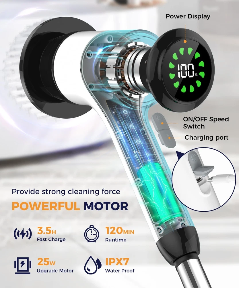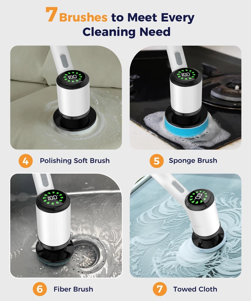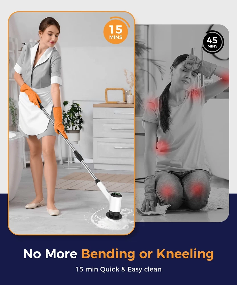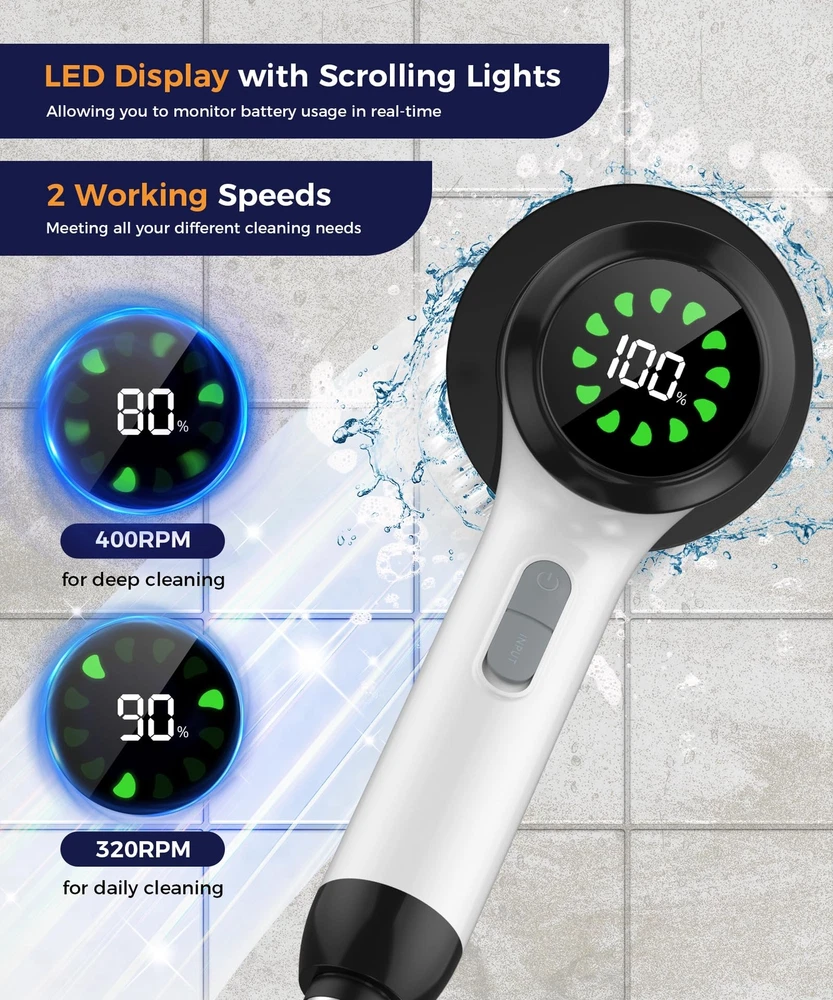 Electric Spin Scrubber: Boasting a robust motor, this upgraded spin scrubber maintains firm rotation even under high-pressure conditions. With two operating speeds – 320RPM for everyday cleaning and 400RPM for thorough, deep cleaning, this bathroom cleaner meets all your different cleaning needs. Say goodbye to arduous scrubbing and hello to more leisure time with this highly efficient electric scrubber. Shower Scrubber, 7 Versatile Brush Heads: The electric cleaning brush comes with eight detachable brushes, each specifically designed for diverse cleaning tasks. The flat brush is perfect for curved surfaces like bathtubs and toilets; the small flat brush tackles tile floors and grout; the corner brush fits into tight spaces; and the sponge brush is ideal for windows... Sturdy Bristles & IPX7 Waterproof Design: Made of durable ABS material, this shower spin scrubber’s bristle is sturdy enough to remove stubborn stains easily without scratching surfaces. The floor scrubber is highly sealed to protect damage from water, allowing you to wash the brush head directly under water (Please do not immerse the entire machine body in water while using). Adjustable & Ultra-Lightweight: Equipped with an extendable stainless-steel handle, this shower cleaner brush makes it easy to clean hard-to-reach areas without kneeling or bending. This electric scrubber is incredibly lightweight and user-friendly, even for children. Cordless Cleaning Brush, Ultra long-lasting: This cordless shower scrubber features a large battery The cordless design allows you do cleaning with the most relaxed posture. Perfect present, Professional Services: This bathroom scrubber is an thoughtful present for loved ones, parents, friends, and colleagues on special festivals like Christmas, New Year, birthdays, Mother's Day, and Father's Day. We are dedicated to delivering excellent customer service and are always ready to assist with any requests you may have!
