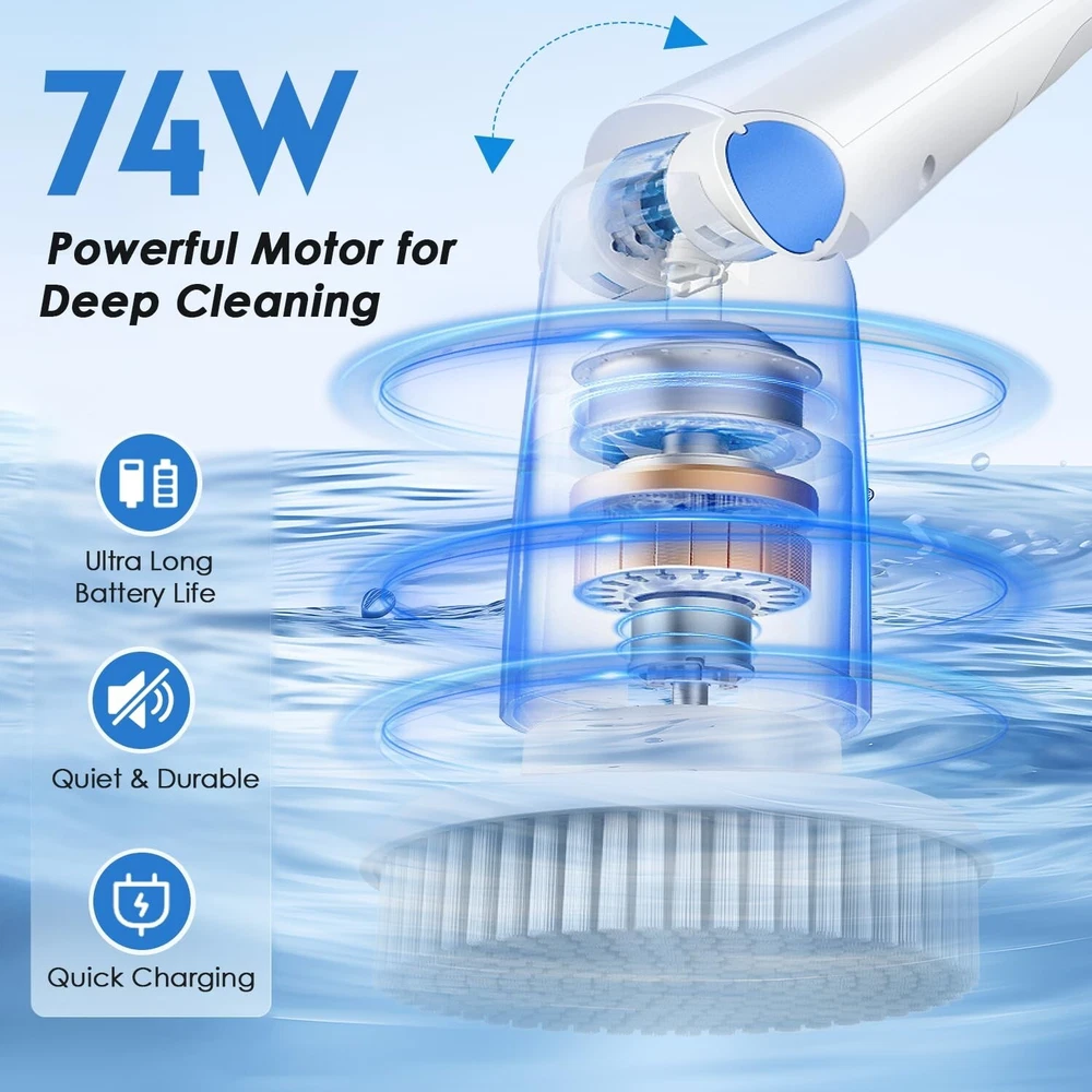Electric Spin Scrubber Shower Scrubber,IPX7 Waterproof Electric Scrubber for Cleaning,Cordless Cleaning Brush with 8 Replaceable Brush Heads Adjustable Extension Long Handle,for Bathroom Kitchen Product Details Brand: Cakila Color: White Blue Handle Material: Plastic Specific Uses For Product: Window, Floor, Table, Grill, Tile, Refrigerator, Drain, Kitchen, Patio, Vent, Comb, Wall, Bathroom, Ceiling, Furniture, Dryer Vent, Vehicle, Counter, Sink, Air Conditioner, Computer, Pool, Dish, Golf Club, Metal Cleaner See more Product Dimensions: 7.08"L x 6.3"W x 17.56"H Brand: Cakila Color: White Blue Handle Material: Plastic Specific Uses For Product: Window, Floor, Table, Grill, Tile, Refrigerator, Drain, Kitchen, Patio, Vent, Comb, Wall, Bathroom, Ceiling, Furniture, Dryer Vent, Vehicle, Counter, Sink, Air Conditioner, Computer, Pool, Dish, Golf Club, Metal Cleaner Product Dimensions: 7.08"L x 6.3"W x 17.56"H Material: Aluminum Special Feature: Portable Shape: Round Included Components: Attachment Surface Recommendation: Floor, Porcelain, Vinyl, Wood, Glass, Tile, Plastic, Metal, Windows, Stone Number of Items: 1 Theme: Cleaning Item Firmness Description: Medium Manufacturer: Cakila Unit Count: 1.0 Count Item Weight: 4.27 pounds Country of Origin: China Item model number: DDQJS13 Date First Available: December 19, 2024 Time-Saving and Efficient Cleaning: This electric spin scrubber makes cleaning easier and faster through its efficient design. Compared with traditional bathroom cleaner, shower scrubber can save up to two-thirds of cleaning time - from 1 hour to 45 minutes. Its lightweight design makes it easy for the whole family to use, especially suitable for the elderly, pregnant women, arthritis patients, and people with limited mobility. There is no need to bend down or kneel when using it, which avoids pressure on the back and knees. This electric scrubber for cleaning not only improves cleaning efficiency, but also greatly reduces the burden on the body, making it an ideal choice for daily cleaning Two-Speed Powerful Motor: Shower scrubber equipped with two working speeds, the first gear speed is 230 rpm/min and the second gear speed is 255rpm/min, which can be switched with just one button operation. Our electric scrubber for cleaning is equipped with a 4V/74W advanced noise reduction motor, coupled with a 2000mAh large-capacity battery, which enables 2.5 hours of fast charging through the Type-C interface, providing up to 90 minutes of continuous cleaning Flexible Adjustable Handle: Shower scrubber with long handle is equipped with a retractable stainless steel handle, the length can be adjusted from 26 inches to 51 inches, and the angle adjustment range is from 90 to 180. This allows you to easily clean every corner of your home without having to kneel or bend down. This new bathroom cleaning supplies will change your cleaning experience and let you say goodbye to the inconvenience of traditional cleaning tools IPX7 Waterproof Multi-Function: Bathroom cleaner with long handle except for the top handle, ourspin brush for cleaning bathroom is designed with an IPX7 waterproof rating as a whole, which can be washed directly under the faucet without worrying about damage. Electric scrubber suitable for bathtubs, swimming pools, ceilings, glass, countertops, floors, tiles, kitchens, walls, windows, cars and many other scenes, it is a multi-functional tool that meets all your cleaning needs 8 Types of Replace Brush Heads: Our electric spin scrubber comes with 8 types of replaceable brush heads, including 4 cleaning heads, 1 cleaning sponge, 1 scouring pad, 1 coral mop and 1 Nylon cleaning head. Whether you're cleaning bathroom tubs and toilets, large hard surfaces, nooks and crannies, detail work, or smooth surfaces like glass or cars, our brush heads can meet your needs. All brush heads are designed to be firm and not easy to fall off
