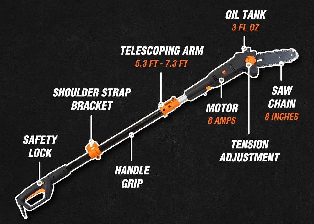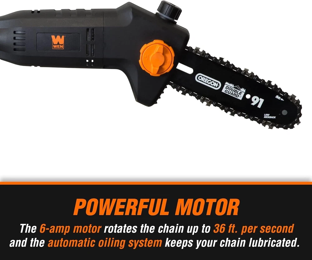Telescoping pole adjusts anywhere from 5.3 feet to 7.3 feet for up to 12 feet of overhead reach 6-Amp motor rotates the chain up to 36 ft per second Weighs in at a mere 6.7 pounds to limit user fatigue during operation Design allows for tool-free chain adjustments and emission-free operation Includes an 8-inch saw chain, a blade cover, a shoulder strap, and a two-year warranty Remember when you could trim trees without using a single drop of gasoline? Free yourself of ecological guilt with the WEN 6-Amp 8-Inch Electric Pole Saw. Telescope the pole anywhere from 5.3 feet all the way up to 7.3 feet. Our powerful 6-amp motor runs the blade at a whopping 36 feet per second. Automatic oiling system keeps your chain properly lubricated while the tool-free blade changes make for easy and quick tensioning between cuts. Lightweight 6.7-pound design combined with the included shoulder strap alleviate stress and limit fatigue during operation. The saw also includes an ambidextrous built-in safety switch to minimize accidents and a scabbard to protect the chain and bar between jobs. And, because its a WEN product, your pole saw comes backed by a two-year warranty, a nationwide network of skilled service technicians, and a friendly customer help line all to make sure you remember WEN.