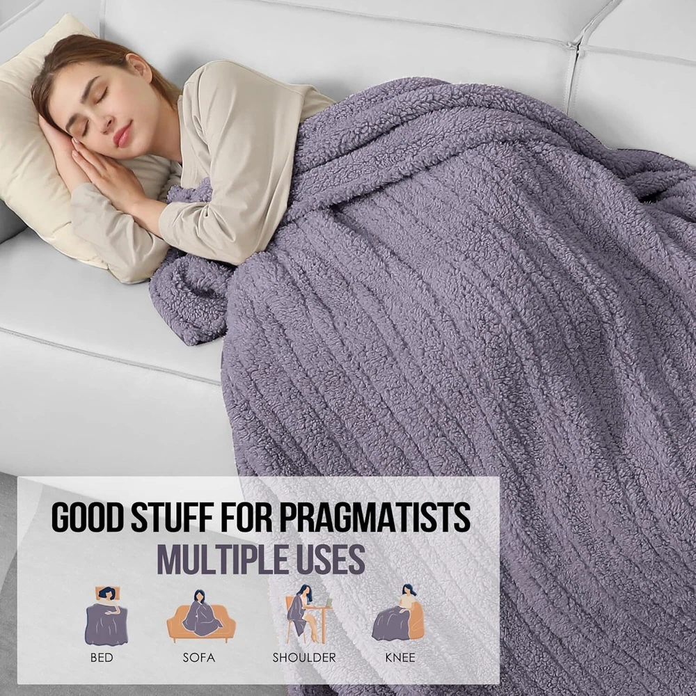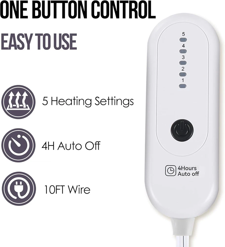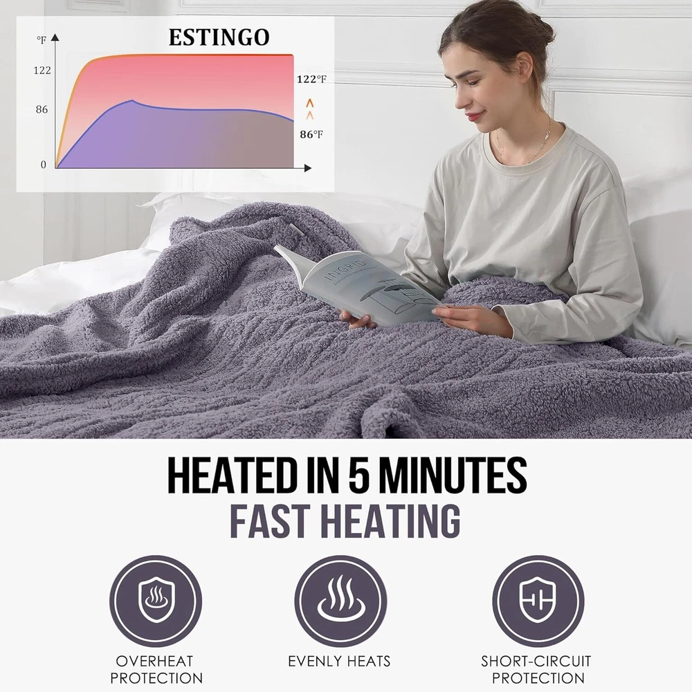 Electric Throw Blanket, Heated Blanket Sherpa with THROW-50x60, A-gray Violet Product Details Material: Sherpa Color: A-gray Violet Brand: ESTINGO Special Feature: Skin Friendly, Fade Resistant, Durable, Stain Resistant, Breathable Style: Modern WARMER FABRIC: This heated throw blanket is made from double layers of thicker sherpa, creating a soft and fluffy feel and further warmth. Whether you use it on an office chair, on a sofa in the living room or on a bed in the bedroom, the electric blanket throw at just 3.3lb provides you with warmth and ultimate comfort in a lightweight way. EASIER USAGE: This electric heated blanket is very easy to operate as it only has one button. The electric blanket has 5 heating setting functions to provide you with the most comfortable heating level at any time, and heating blanket will automatically shut off after 4 hours in case you forget. FASTER HEATING: This heated blanket throw uses thermal fabric and better quality heating wire, which can heat up quickly within 5 minutes, making you feel warm quickly (86-122°F). The U-shaped coil structure makes the heat more even, giving you the most comfortable care. BETTER PROTECTION: This electric throw blanket has passed strict ETL and FCC safety certifications, and has overheating protection and short-circuit protection. Once an abnormality occurs to the electric blanket, it will automatically shut down. MORE ELEGANT GIFT: This electric heated blanket is available in multiple sizes and colors, and is delivered in an elegant gift box. Electric blankets are perfect gifts for women, men, mothers, or anyone else's birthday, Thanksgiving, Christmas and so on. NOTE: Since we have set an overheating protection function on the controller, if you feel it is not warm enough when using the electric blanket for the first time, please turn it off for 12 hours and then start it again, the temperature will increase significantly!