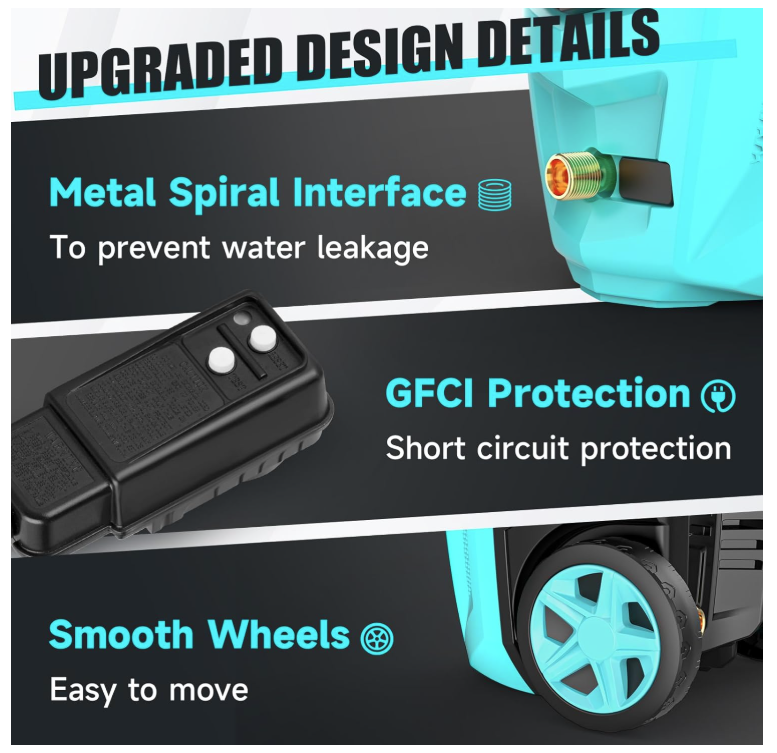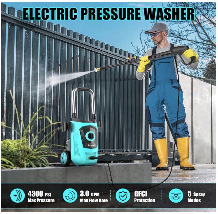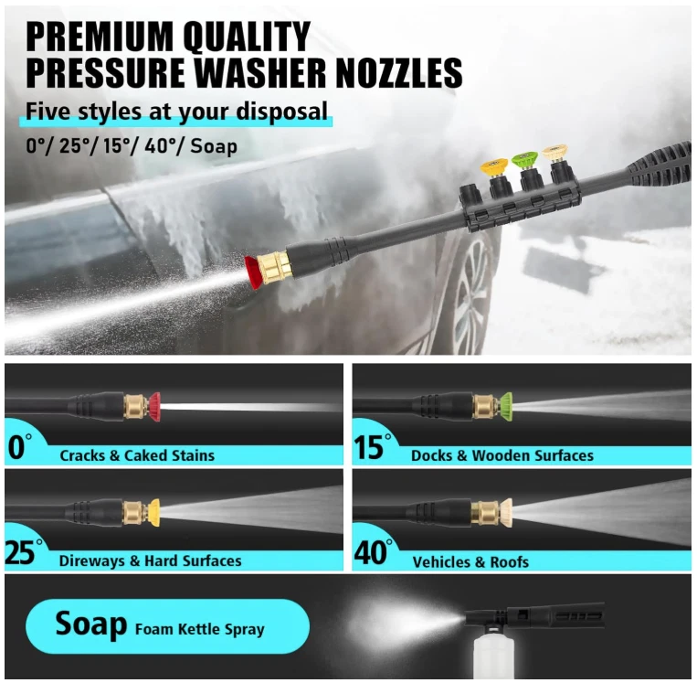 English: 【POWERFUL CLEANING】Generating up to 4300 pounds per square inch (PSI) of pressure with a flow rate of 3.0 gallons per minute (GPM). While saving water, electric pressure washer can easily remove stubborn stains, which makes it ideal for cleaning various surfaces in the home, such as cars, bicycles, fences, sidewalks, walls, courtyards, etc 【4 DIFFERENT NOZZLES】Our electric power washer with 4 quick connection nozzles (0°,15°,25° and 40°). 0 ° provides super high pressure - suitable for stubborn stains on concrete and hard surfaces of bricks. 15 ° provides high pressure - used for cleaning direways and hard surfaces. 25 ° provides medium pressure - suitable for decks and wooden surfaces. 40 ° provides low pressure - suitable for vehicles and windows 【EASY TO USE】Equipped with a 20 FT hose and 35 FT power cord, ensuring that the pressure washer has a sufficient range of use, and rollers make it easy to move around. Soap tank can achieve foaming effect in an instant. Evenly spray a large area of foam. Thicker and dense foam is perfect for car washing & general use 【3 WATER-SUCKING WAYS】The electric high pressure washer can choose bucket self-priming water or pool self-priming. At the same time, you can also connect faucet self-priming. (connect faucet not included) 【UPGRADED DESIGN DETAILS】This pressure washer attaches a 35-foot power cord with inline GFCI for use. It helps you control and check the power using. In addition, this pressure washer adopts metal spiral interface design to prevent water leakage and we have also upgraded the handle to make it be more humane 【PROFESSIONAL AFTER-SALES SERVICE】If you have any problems using power washer, please feel free to contact us and we will provide service and assistance within 24 hours Spanish: 【LIMPIEZA POTENTE】Genera hasta 4300 libras por pulgada cuadrada (PSI) de presión con un caudal de 3.0 galones por minuto (GPM). Ahorrando agua, esta hidrolavadora eléctrica elimina fácilmente las manchas difíciles, ideal para limpiar diversas superficies del hogar, como autos, bicicletas, cercas, aceras, paredes, patios, etc. 【4 BOQUILLAS DIFERENTES】Nuestra hidrolavadora eléctrica cuenta con 4 boquillas de conexión rápida (0°, 15°, 25° y 40°). La boquilla de 0° proporciona una presión extremadamente alta, ideal para manchas difíciles en concreto y superficies duras de ladrillo. La boquilla de 15° proporciona alta presión, ideal para limpiar pasillos y superficies duras. La boquilla de 25° proporciona una presión media, ideal para terrazas y superficies de madera. 40° proporciona baja presión, ideal para vehículos y ventanas. 【FÁCIL DE USAR】Equipada con una manguera de 6 metros y un cable de alimentación de 10,6 metros, garantiza un amplio rango de uso. Los rodillos facilitan su desplazamiento. El tanque de jabón crea espuma al instante. Rocía una amplia área de espuma de manera uniforme. Su espuma densa y espesa es perfecta para el lavado de autos y uso general. 【3 MODOS DE ASPIRACIÓN DE AGUA】La hidrolimpiadora eléctrica de alta presión puede elegir entre autocebante de cubo o de piscina. También puede conectar el grifo para autocebante (no incluye el grifo). 【DETALLES DE DISEÑO MEJORADOS】Esta hidrolimpiadora incluye un cable de alimentación de 10,6 metros con interruptor diferencial integrado. Esto le ayuda a controlar y verificar el consumo de energía. Además, esta hidrolavadora incorpora un diseño de interfaz en espiral de metal para evitar fugas de agua y hemos mejorado el mango para un manejo más humano. 【SERVICIO POSVENTA PROFESIONAL】Si tiene algún problema con la hidrolavadora, no dude en contactarnos y le brindaremos servicio y asistencia en 24 horas.