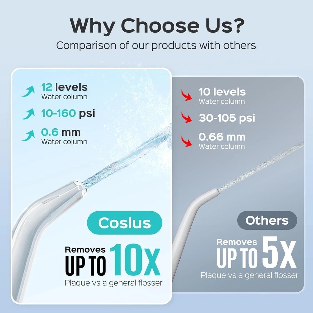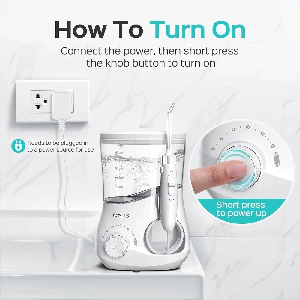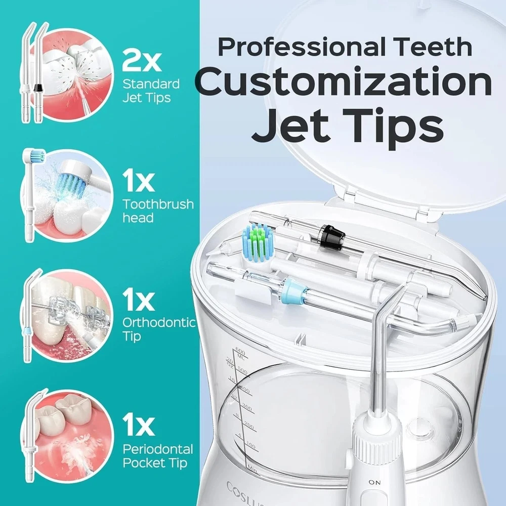 SHOPGLOBALVIBE Professional High-Precision Water Flosser 12 Pressure Settings • 600ML Tank • Family Oral Care 600ML Capacity Large Detachable Tank 12 Levels 10–160 PSI Precision Fast Handling 1-3 Business Days The Ultimate Family Oral Care System Developed in partnership with dental specialists, this professional-grade water flosser delivers high-precision oral care for the whole family. Whether it's teens with braces, adults maintaining hygiene, or seniors with sensitive gums, the 12 adjustable pressure settings ensure effective plaque removal and gum health maintenance. ✨ Precision & Power 12 Adjustable Levels (10-160 PSI) 5 Multifunctional Jet Tips 3-Minute Auto Shut-off Deep Plaque Removal 📦 Family Design 600ML Large Detachable Tank Organized Tip Storage Case Compact & Modern Finish Non-slip base for Stability ⚠️ Important Product Notes: Power Source: Needs to be plugged in to a power source for use. Packaging: Design may vary (new or old), but contents are exactly the same. Reliable USA Shipping Fast and secure service for your oral health needs. Handling Time: 1-3 Business Days. Ships from USA. Quality Guaranteed by ShopGlobalVibe Authentic Products • Fast Dispatch • Superior Support