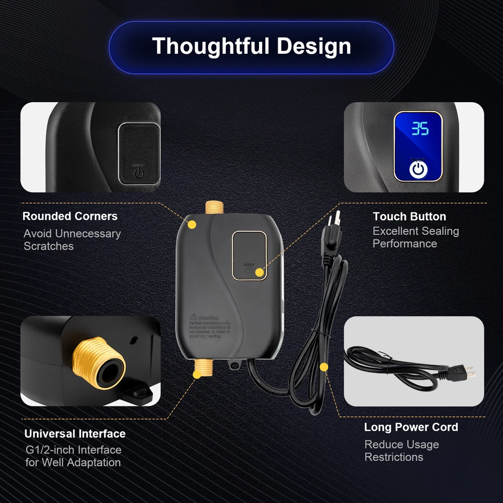 Mini Instant Electric Tankless Kitchen Hot Water Heater Shower 110v 3000w Us Description Our Water Heater Uses a Stainless Steel Heating Core with 3000w Large Power, Providing You with Instant and Constant Hot Water and Allowing for a Comfortable Washing Experience. in Addition, It Adopts Multiple Protection Designs Such As Leakage Protection, Dry-heating Protection, and Grounding Protection, Ensuring High Safety of Water Use. the Mini Body and Modern Appearance Make It a Great Companion for a Sink and Faucet. Key Features Premium Material: the Instant Water Heater Uses Stainless Steel and High-quality Abs Materials with Injection Molding, Making It Sturdy, Wear-resistant, Corrosion-resistant, and Long-lasting. A Safe Heater: the Various Protections Such As Leakage Protection Corded Electric Mini Water Heater Under Kitchen Sink Water Heater On Demand USA Mini Instant Electric Tankless Kitchen Hot Water Heater Shower 110v 3000w Us Description Our Water Heater Uses a Stainless Steel Heating Core with 3000w Large Power , Providing You with Instant and Constant Hot Water and Allowing for a Comfortable Washing Experience. in Addition, It Adopts Multiple Protection Designs Such As Leakage Protection, Dry-heating Protection, and Grounding Protection, Ensuring High Safety of Water Use. the Mini Body and Modern Appearance Make It a Great Companion for a Sink and Faucet. Key Features Premium Material: the Instant Water Heater Uses Stainless Steel and High-quality Abs Materials with Injection Molding, Making It Sturdy, Wear-resistant , Corrosion-resistant , and Long-lasting. A Safe Heater: the Various Protections Such As Leakage Protection, Dry-heating Protection, Anti-electric Wall Technology, Water-electricity Isolation, Sensor Fault Protection, and Grounding Protection and Ipx4 Waterproof Rate Make It Safe to Use Without Any Worries. Instant Heating: Using a Stainless Steel Heating Core with 3000w Large Power, This Water Heater Can Deliver Constant Hot Water, Allowing You to Experience the Warmth Without Storing Water for Preheating, Which Saves Time/Energy and Prevents Sediment/Scale Accumulation. Temperature Controllable: You Can Control the Water Temperature(20-50℃) by Adjusting the Water Flow(Large Water Flow, Low Temperature; Small Water Flow, High Temperature), Providing You with Hot Water That Fits Four Seasons in a Year. You can adjust the temperature by controlling the water flow (68-122°F). Led Display: the Digital Screen Displays the Water Temperature(℃/℉ Conversion: Press the on/off Key, and Then Press and Hold It for More than 6s to Switch ℉. Vice Versa.), Allowing You to Keep Track of the Water Temperature. Anti-scaling Design: It Can Filter the Sediment, Rust, and Other Large Particles in the Tap Water, Restore the Tap Water to the Factory State, Reduce Energy Consumption, and Avoid Damage to the Human Body and Skin. Advanced Technology: Advanced Water Flow Sensing Technology Is Adopted to Overcome the Difficulty of Using Water Heaters Due to Low Water Pressure, Making It Applicable to High-rise Residential Buildings with Low Water Pressure. Cost-effective: Only When It Is Used the Water Can Be Heated to the Required Place, Eliminating the Waste of Unused Water in the Long Water Pipeline Between the Central Water Heater and Each Faucet, Delivering Hot Water Faster and Reducing Energy Costs. Mini Appearance: This Mini Wall-mounted Black Instant Water Heater of 4.6*2.8*6.3 Inches Size Plays a Decorative Role and Does Not Occupy Much Space. Easy to Install: with the Equipped Accessories, Premade Fixing Screw Holes, English Manual, and 1/2 Inch Standard Interface, You Can Install This Heater Easily. Easy to Clean: the Smooth Surface Allows You to Wipe the Dirt Away with a Wet Cloth. Protective Package: to Prevent the Product from Being Damaged and Bumped During Transportation, We Packed It with Pearl Cotton to Protect Your Products to the Maximum Extent Possible. Details Power Cable: the 3.28ft Power Cable Allows for Easy Installation in a Wider Range. Brass Interfaces: the Water Inlet and Outlet Adopts Brass Material, Making Them Corrosion-resistant , Stable, Anti-rust , and High-temperature-resistant . Touch Button: the New-generation Touch Button with Electronic Control Has a Longer Lifespan and Good Sealing. It Resists Wet and Watery Environments and Avoids Mechanical Failure of Buttons. Application It Is Suitable for Kitchen Water, Daily Washing, Rvs, Bars, Schools, Hospitals, Communities, Hair Salons, and so on to Wash Hands, Dishes, and Face. Specifications Model: Xy-fc Color: Black Material: Stainless Steel, Abs, Brass Process: Abs Particle Injection Molding Shape: Rectangular Style: Mini, Instant Mounting Type: wall-mounted, Vertical Usage: Indoor Use Features: with Leakage Protection Water Inlet Mode: Lower Water Inlet Heating Method: Instant, Stainless Steel Heating Core Power Source: Corded Electric Plug: Us Standard Voltage:110v Frequency: 50-60hz Power: 3000w Water Pressure: 0.04-1.2mpa Anti-electric Shock Type: I Waterproof Grade: Ipx4 Wire Requirements: >2.5m² Circuit Breaker Switch: >32a Heating Time: About 5s Interface: 1/2"Npt Interface Outer Diameter: 20mm/0.78inch Heating Temperature: 20-50℃/68-122℉ Power Cord Length: 1m/3.28ft Total Height(Interfaces Included): 19.5cm/7.7inch Water Heater Size: 11.6*7*16cm/4.6*2.8*6.3inch Package Size: 11.6*7*19.5cm/4.57*2.8*7.68in Net Weight: 1kg/2.2lbs Gross Weight: 1.1kg/2.4lbs Package Included 1* Instant Water Heater 1* English Manual Other Accessories for Assembly. Notes The Unit Is Mainly for Sinks, Not for Shower Purposes. Please Verify This Unit Is the Right Size for You Before Buying. the Wire Is Required to Be More than 2.5m² and the Circuit Breaker Switch Is Greater than 32 a. You Need to Prepare a Water Pipe, Valve, and Other Excluded Accessories Yourself. It Must Be Installed Vertically Upward Instead of Horizontally, Sideways, or Flatly. Please Properly Ground the Ground Wire During Installation, and 