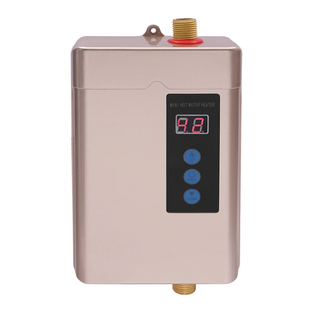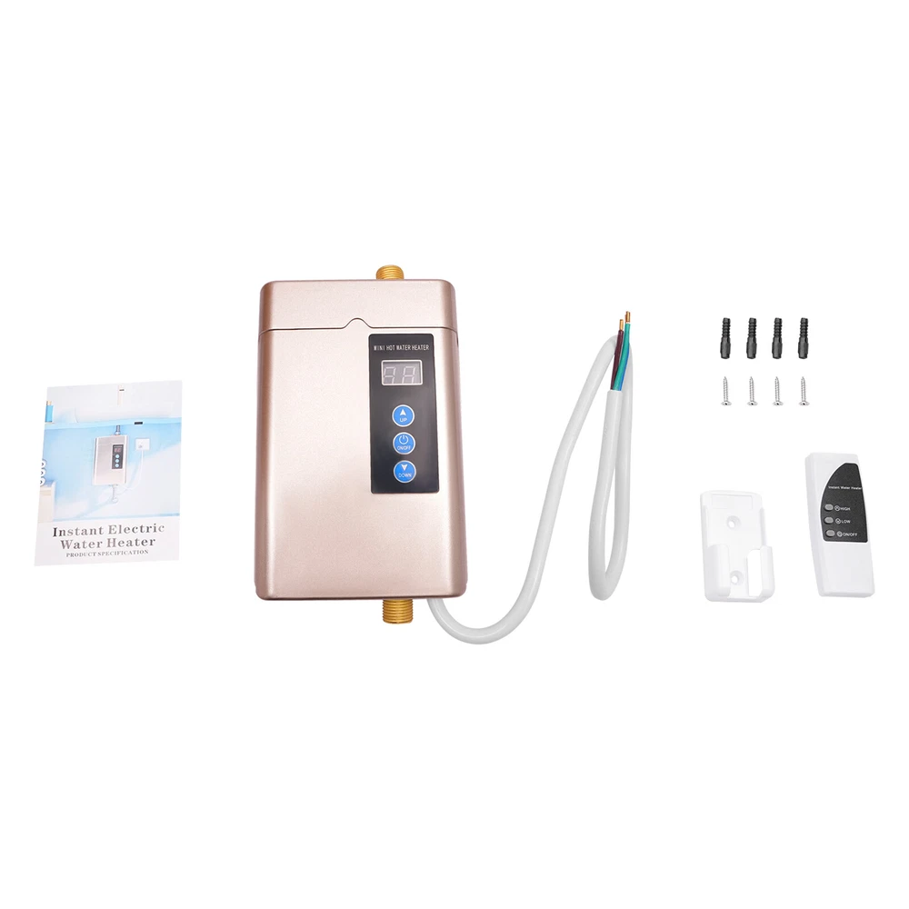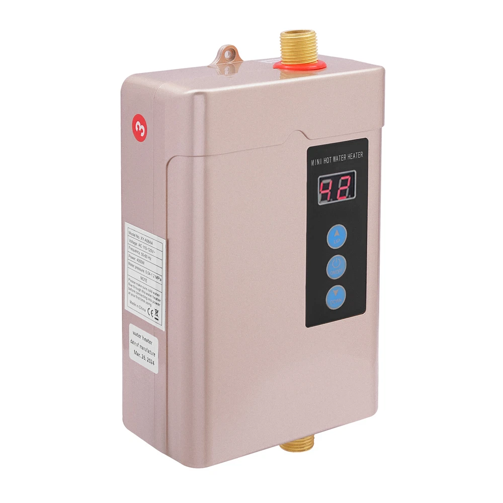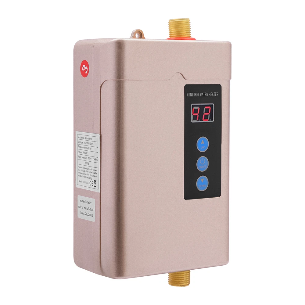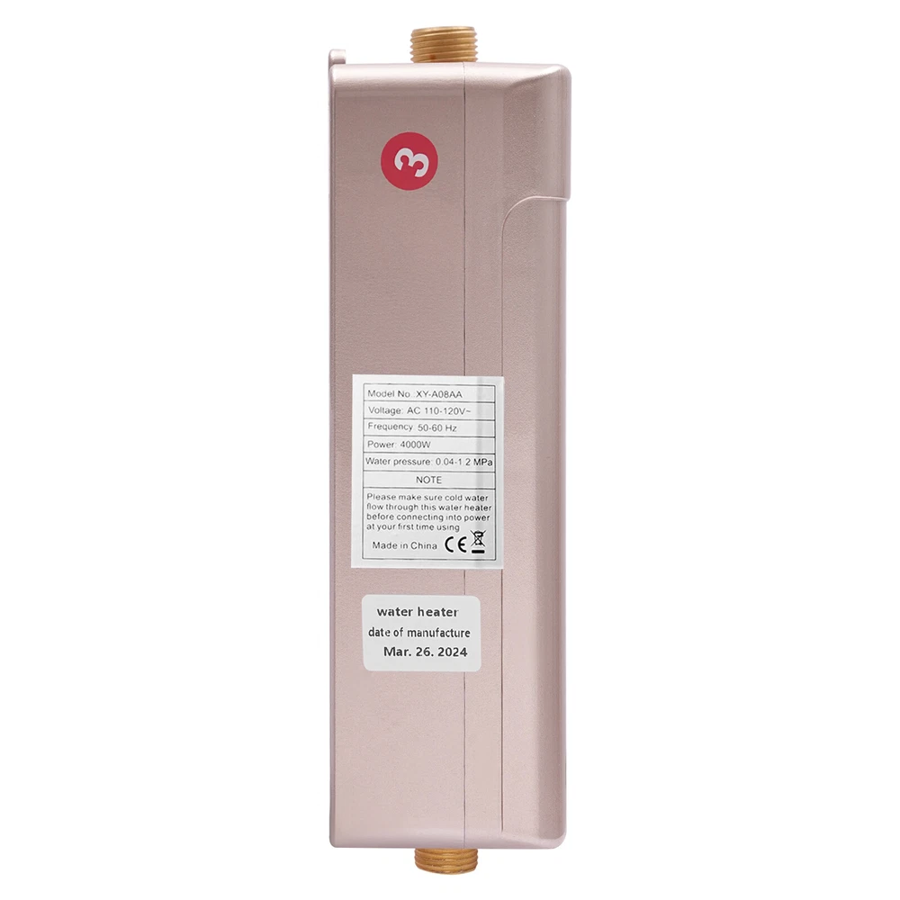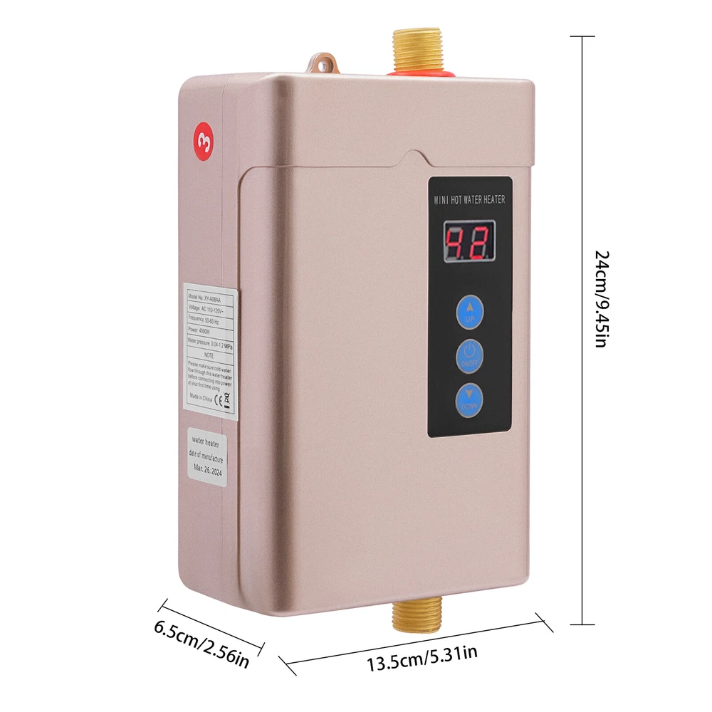 Description The exquisite electric water heater can bring you luxurious and comfortable water enjoyment, elevating your daily water use to a realm of elegance and convenience. Its streamlined design is ergonomic and blends seamlessly with the aesthetics of the kitchen, reflecting the ideal harmony between form and function. Its advanced heating technology ensures a steady supply of water at your desired temperature. Key Features Build to Last: It is mainly made of high-quality ABS and aluminum with a painting process, making it insulating, strong, solid, wear-resistant, and not easy to deform, ensuring a long service life. High Efficiency: The 4000W of power and the fast heat-conducting aluminum heating tubes provide you with hot water in short time without storing water and preheating, Electric Water Heater, Under Sink Instant Hot Water Heater+LCD Touch Screen 4KW Description The exquisite electric water heater can bring you luxurious and comfortable water enjoyment, elevating your daily water use to a realm of elegance and convenience. Its streamlined design is ergonomic and blends seamlessly with the aesthetics of the kitchen, reflecting the ideal harmony between form and function. Its advanced heating technology ensures a steady supply of water at your desired temperature. Key Features Build to Last: It is mainly made of high-quality ABS and aluminum with a painting process, making it insulating, strong, solid, wear-resistant, and not easy to deform, ensuring a long service life. High Efficiency: The 4000W of power and the fast heat-conducting aluminum heating tubes provide you with hot water in short time without storing water and preheating, avoiding long waits. The AI intelligent thermostat chip will quickly match the heating power required for washing according to the inlet temperature, outlet temperature, and water storage volume without having to endure hot and cold fluctuations. Safety First: It has IPX4 waterproof rating, anti-electricity wall protection, water and electricity separation technology, high-temperature dry burning, fault alarm, anti-high voltage protection, leakage detection, which ensures the safety of use. Thoughtful Design: The included remote control allows you to switch on and off and set the temperature(82.4-131°F) within 3.28-6.56ft , and the temperature can also be adjusted by touch screen on the body, plus it has a temperature memory function to meet your usage habits. Energy-saving: It uses an electric water heater with an inverter design that automatically adjusts the power input based on flow rate and temperature settings. When the water flow is reduced, the system consumes less electricity for energy-saving. Compact and Space-saving: With its compact size (5.31*2.56*9.45 inches) and simple structure, you can mount it vertically on the wall or under the sink/cabinet without taking up too much space. Ideal Gift: Thanks to its excellent performance, you can give it as a holiday, birthday, or housewarming gift to your family and friends. Protective Package: We have used a sponge to wrap this product, designed to minimize damage to the product during shipping. Details LCD Screen: It shows the temperature clearly and makes it easy for you to see. Cold and Hot Water Inlets: They make it easy for you to link water pipes, faucets or shower heads. Pre-drilled Holes: They make it easy for you to install the product. Application It can be used in homes, schools, hospitals, offices, bars, kitchens, bathrooms, public restrooms and laundries, etc. Specifications Color: Champagne Gold Process: Painting Style: Modern Shape: Rectangular Assembly Required: Yes Mount Type: Vertical Power Source: Corded Electric Material: ABS and Aluminum Model: XY-A08AA Voltage: AC 110-120V Frequency: 50-60Hz Power: 4000W Pressure: 0.04-1.2MPa Waterproof Level: IPX4 Screen Type: LCD Pipefittings: About 2cm/0.787in Temperature Adjustment Range: 28-55°C/82.4-131°F Operating Temperature: 30-50°C/86-122°F Remote Control Range: 1-2m/3.28-6.56ft Remote Control Battery Type: 2*AAA Batteries(Not Included) Product Size: 13.5*6.5*24 cm/5.31*2.56*9.45 in Package Size: 31*22.5*10.5cm/12.2*8.86*4.13in Gross Weight: 1.8kg/3.97lbs Net Weight: 1.6kg/3.53lbs Package Included 1* Electric Water Heater 1* Remote Control 1* English Manual All Accessories for Assembly Notes Please note this product is suitable for sinks but not for showers. Please note that this product must first run water before electricity. It is advisable to install this element vertically to ensure a long service life. The heating temperature depends on the flow rate and incoming water temperature. Please read the English manual and the label on the body of the product carefully before use and pay particular attention to the safety instructions contained therein. Please allow the slight color difference caused by the shooting light and 1-3cm error due to manual measurement, and make sure you do not mind before ordering. Payment Delivery details Terms of sales About us Contact us Payment We accept ebay payment 。 Fees such as import duties, taxes are not included in the item price or shipping costs. These charges are the buyer's responsibility. Delivery details Shipping: 2-9 working days to: USA Terms of sales We maintain high standards of excellence and strive for hundred percent customer satisfaction. Feedback is very important to us. We hope that you contact us immediately before you give neutral or negative feedback, so that we can address your concerns. It is impossible to address issues if we do not know about them! About us Your satis faction is our ultimate goal. We work hard to earn your trust and future business. Our certified technicians have tested each item before shipping. The unit comes with 1 year limited warranty on all manufacturing defects. a) If you receive a defective item, you may return it or ask for a discount. Please contact us within 14 days after you receive the package. b) What you returned must be inta