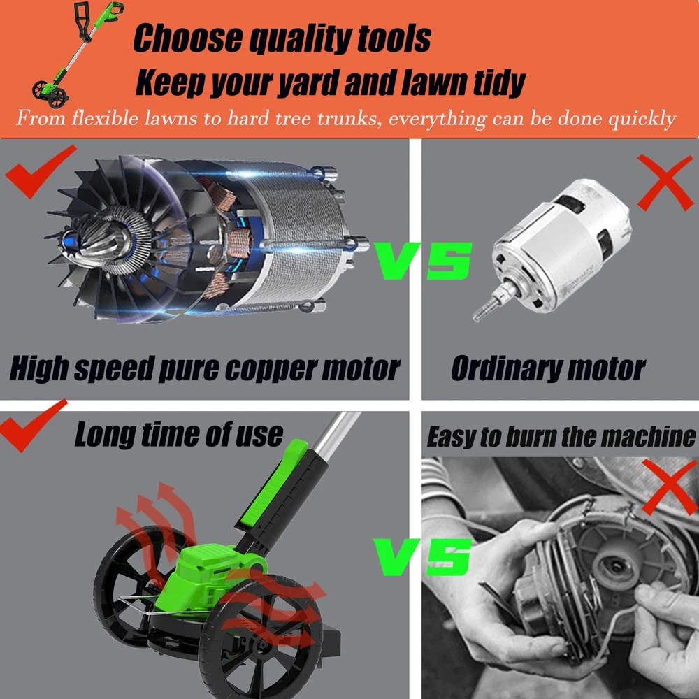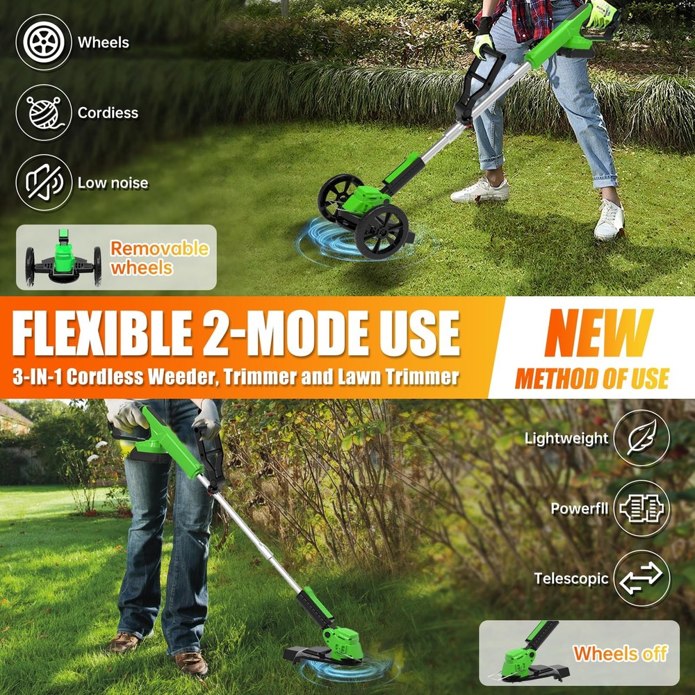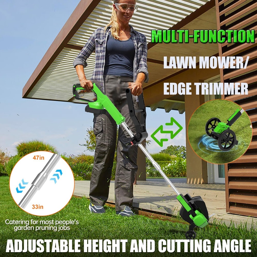The multifunctional cordless electric weed wacker is versatile and can be used as grass trimmer, edger, lawn mower, easy for different cutting jobs. Upgrade 650W electric weed wacker battery powered is built to handle heavier workloads, allows the electric lawn mower cordless to achieve a maximum 20000 RPM speed. With LED power display, detachable wheels, Rich auxiliary accessories to improve work efficiency 👍👍👍【The Latest Cordless Weed Wacker for 2025】👍👍👍The newly upgraded Cordless string trimmer has stronger power, simpler operation, more comprehensive functions, and longer usage time! 【Powerful Efficient Weed Wacker】The multifunctional cordless electric weed wacker is versatile and can be used as grass trimmer, edger, lawn mower, easy for different cutting jobs. Upgrade 650W electric weed wacker battery powered is built to handle heavier workloads, allows the electric lawn mower cordless to achieve a maximum 20000 RPM speed. With LED power display, detachable wheels, Rich auxiliary accessories to improve work efficiency 【5 Kinds of Replaceable Blades】:This battery operated weed wacker is equipped with 5 kinds of blades. Nylon Blade blade for mowing young grass. Stainless steel blade for fast cutting lawns,weeds and small shrubs. Stainless steel S-blades are well for older weeds, reeds, etc pruning. weeding rope is suitable for trimming weeds on the roadside. A weed trimmer circular saw blade made of manganese steel with high cutting power for trimming thick bush branches 【New shaped Handle & Lightweight & Safe Design】 Our stringless electric weed whacker weighs only 3.5 pounds, lightweight, even the elderly or women can easily control and use it. With double safety button design, you need to press the safety lock and trigger at the same time to start the brush cutter, ensures your safety. New shaped ergonomically designed handle for long hours of work without feeling tired, can be hung anywhere. Easily keep your garden and yard clean and tidy 【Height and Cutting Angle Adjustable 】 The no string trimmer is equipped with adjustable telescopic shaft, which can be adjusted freely from 33" to 47" to meet the needs of most people's garden pruning work. The pivoting head of this electric weed trimmer can be adjusted (0 - 90°) to help you enter the hard-to-reach corners without cord limitation. Retractable design, which can further reduce the occupied space and make it more convenient to move and store 【2Pcs 21V/2000mAh lithium battery (high power, high efficiency)】2000mAh electric brush cutter mower with higher efficiency and longer run time (70-90mins no loading/40-60mins working time), charging time (2-3hours), The two batteries can work alternately, easily weeding the entire yard.compared with a gas weed wacker, it has lower noise, no emissions, does not need to start several times, and very little maintenance 【Top quality customer service】We provide 3 years guarantee of product service. If you have any questions about our grass cutter machine, please contact us, we will always provide you with the best service until you are satisfied