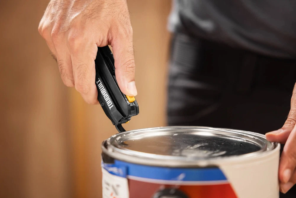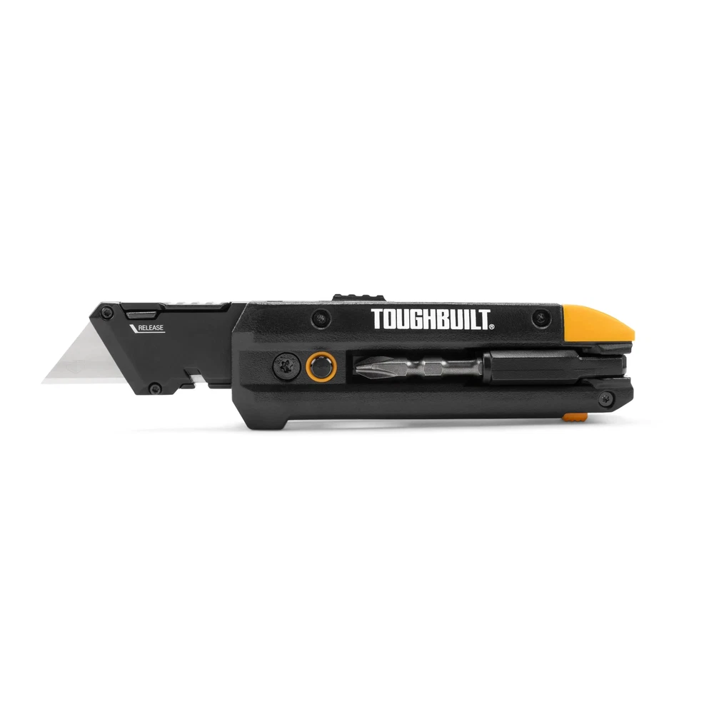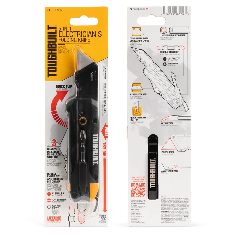 TB-H4-12-IM Electrician's Folding Utility Knife with Bit Driver + Pry Bar Electrician's Folding Utility Knife is designed for convenience and durability, with 5 built-in tools. Equipped with a wire and string cutter, as well as a prying tool, double-ended screwdriver bit (PH2/SL1-4-in), and a 1/4-in bit holder/nut driver, this knife empowers you to tackle a variety of tasks, from cutting through tough materials to prying open containers to tightening or loosening screws and bolts. The button lock ensures that the knife stays firmly in place when open, providing a reliable cutting experience. Plus, the blade-release button allows for quick, tool-free blade changes, so you can replace a dull blade or adapt to different tasks on the fly. Blade storage in the handle holds up to 3 blades. A sturdy belt clip keeps this utility knife at your side when you need it most. Elevate your cutting experience with 5-in-1 Electrician's Folding Utility Knife - a tool that's versatile, convenient, and built to last.