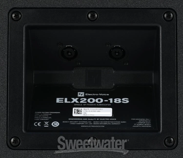 A New Champion Among Portable Passive Subs The Electro-Voice ELX200 series speakers are engineered to deliver greater functionality than their predecessors, in lighter-weight, ultra-portable form factors with superb build quality and elegant design. Sweetwater live performers, DJs, and production companies will be amazed by the value packed into each ELX200 unit. This ELX200 18-inch passive subwoofer consists of a strong, lightweight plywood enclosure, integrated pole mounts, and a convenient 2-handle design. With the help of your amplifier, its 18" woofer pumps out solid low end that will keep the crowd engaged until the last song plays.Heavy-duty performance in a portable form ELX200 series subwoofers deliver heavyweight sonics, but don't worry; load-in and -out will be a cinch, thanks to a light but strong plywood cabinet that is built tour-tough without straining your back. These cabinets also feature a two-handle design that provides comfortable carry positioning to lessen the load to Sweetwater is an Authorized Electro-Voice Dealer Genuine New Item Sweetwater's 2-year warranty Electro-Voice ELX200-18S 18 inch Passive Subwoofer 18" Passive Subwoofer with Plywood Enclosure, and 2 Built-in Carry Handles A New Champion Among Portable Passive Subs The Electro-Voice ELX200 series speakers are engineered to deliver greater functionality than their predecessors, in lighter-weight, ultra-portable form factors with superb build quality and elegant design. Sweetwater live performers, DJs, and production companies will be amazed by the value packed into each ELX200 unit. This ELX200 18-inch passive subwoofer consists of a strong, lightweight plywood enclosure, integrated pole mounts, and a convenient 2-handle design. With the help of your amplifier, its 18" woofer pumps out solid low end that will keep the crowd engaged until the last song plays. Heavy-duty performance in a portable form ELX200 series subwoofers deliver heavyweight sonics, but don't worry; load-in and -out will be a cinch, thanks to a light but strong plywood cabinet that is built tour-tough without straining your back. These cabinets also feature a two-handle design that provides comfortable carry positioning to lessen the load to an even greater degree. Electro-Voice ELX200 18-inch Passive Subwoofer Features: 18-inch woofer for excellent low-end punch Lightweight, easy-to-carry sub engineered for optimal performance 2-handle design makes load-in and -out easier and helps prevent injuries Specification Detail Powered No LF Driver Size 1 x 18" EVS-18L woofer Impedance 8 ohms Power Rating 400W Continuous Total Power 1600W Inputs 2 x SpeakON (NL4) Frequency Range 28Hz-300hz (-10 dB) Frequency Response 45Hz-200Hz (-3 dB) Maximum Peak SPL 133 dB SPL @ 1m Mounting Options M20 Pole Mount Plate Enclosure Material 15mm Plywood with durable polyurea top-coat finish Height 23.7" Width 20" Depth 22.6" Weight 58.7 lbs. RETURN INFORMATION We want you to be completely happy with your purchase from Sweetwater. If you are not satisfied with your product, you may return it for a refund of the purchase price within 30 days. If your purchase was eligible for Free Shipping, the shipping cost will be deducted from your credit or refund. Returns must be in the complete and original packaging with all accessories and complete documentation (Owner's Manual, warranty card, quick start guides, etc.), show no signs of wear or use, and include a Return Authorization number or be subject to a restocking fee.