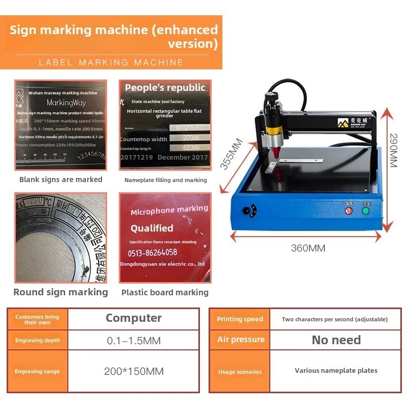Electric marking machine metal electric marking machine aluminum nameplate stainless steel printer lettering and coding machine Lifting height: 20mm Marking speed 50mm/s Marking depth 0.05-2(mm) Needle hardness 96HRA Needle distance 0.5-3(mm) Voltage power 220V 400W