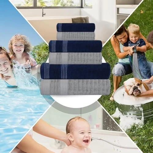 Return Policy Fast Delivery Trusted seller Elegance Collection Towels 550 GSM 2 Bath Towel 2 Hand Towel 2 Washcloths, Super Soft Egyptian Cotton 6 Towels Set for Bathroom, Kitchen & Shower - Navy Blue + Grey Product Description INGREDIENT: Set contains 2 Large Bath Towels of 27x54 Inches, 2 Large Hand Towels of 16x28 Inches, 2 Washcloths of 12x12 Inches. MATERIAL: Made of 100% cotton fabric and terry in nature provides excellent absorbency quality. TEXTURE: Our Towels are 550 GSM, made from natural materials which is safe for you and your family. Available in Six beautiful colours combinations to go with the décor of your home, spa, or gym. FUNCTION: Highly absorbent, yet light-weighted. Gives the body a soft, plush and fluffy feel while absorbing the moisture. CARE TIPS: The Towels are machine washable. Wash the towels in cold water before use. This will cause the cotton fibres to open up and give the towels better absorbency. Always wash towels separately from all other items of clothing to decrease transfer of towel lint to other clothing. Hang them up afterward in an area with good air or in direct sunlight. Shipping Returns Payment Shipping Shipping is FREE to all addresses other than APO/PO boxes in the lower 48 states. All our stock ships from US-based warehouses. Shipped via USPS or UPS (depending on location and package weight) Unless stated otherwise, all orders will ship within 24-72 hours of your payment being processed. Check our feedback to see the great reviews of FAST shipping we offer. Returns Seller does not accept returns Payment We currently accept payment via eBay managed payments only. Once payment is cleared, we will dispatch your shipment within 1-3 business days. Please refer to the "Shipping" tab for more information regarding shipping speed to your destination.