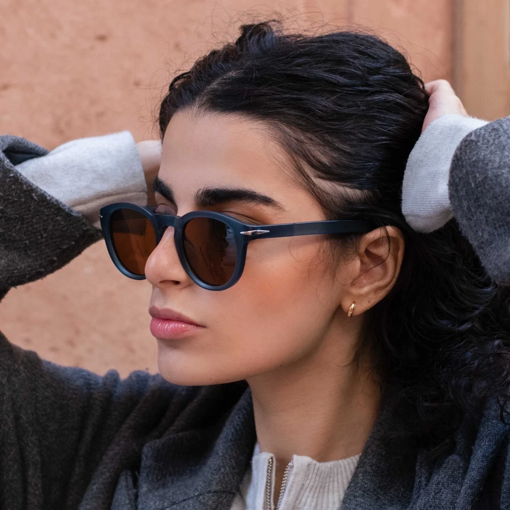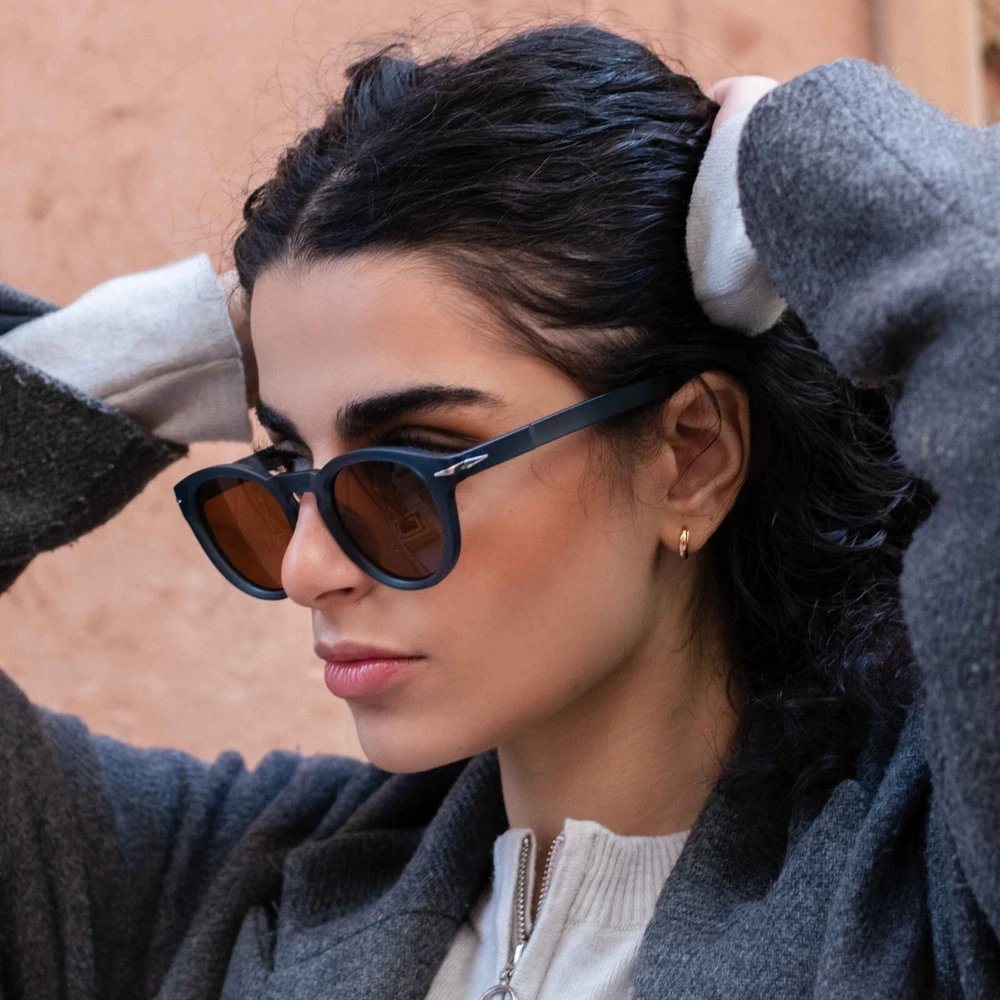 Introducing the Elegance Hub Round Polarized Sunglasses, a vintage designer piece perfect for women who want to add a touch of sophistication to their look. The frame color is a stunning blue, while the lens color is a warm brown, creating a classic and timeless aesthetic. These sunglasses are made by Elegance Hub, a brand known for their high-quality and stylish eyewear. They are perfect for any occasion, whether you're running errands or enjoying a day at the beach. With their round shape and polarized lenses, they offer both fashion and function. Length: 142 mm Width: 141 mm height: 33mm wight: 40 G