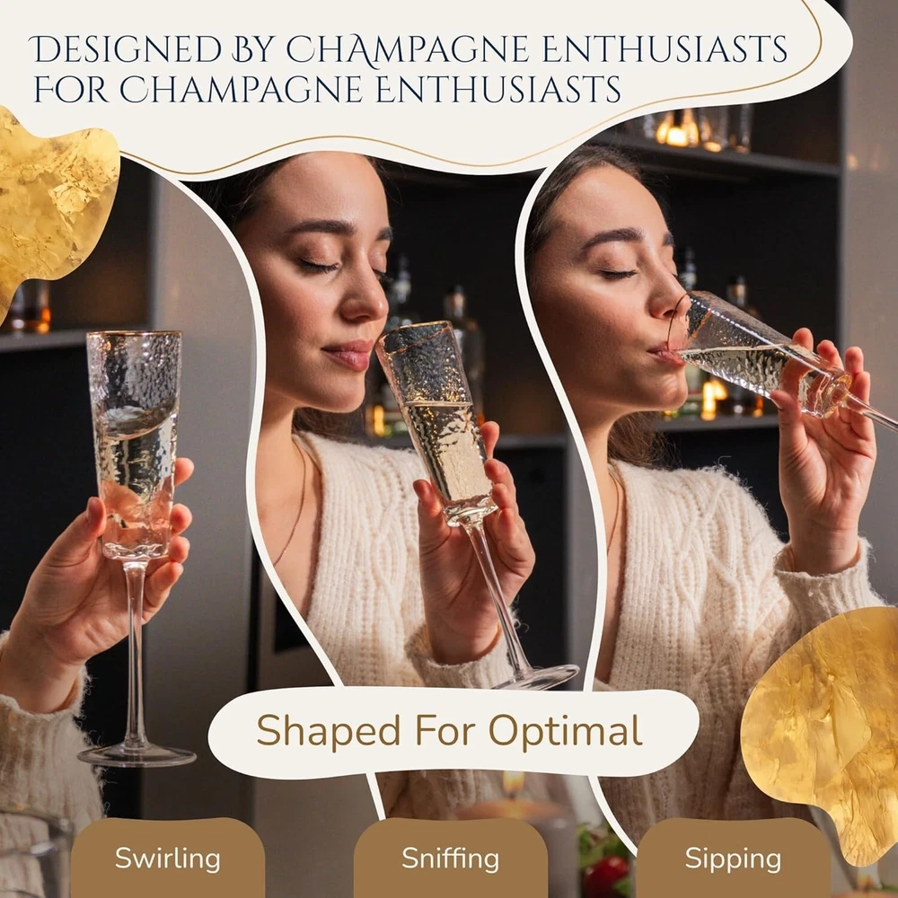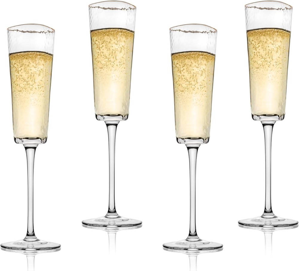 Champagne Glasses Champagne Flute Glasses Set of 4- Triangular shape with Gold Rim Champagne Flutes Glass Flutes Champagne Flutes For Mimosas Glasses- Elegant Champagne Glass Flutes for Celebrations Elegant Presentation: 6 oz Clear mimosa glasses glass flutes showcase the effervescence and color of the champagne, providing an elegant and visually appealing presentation. Prosecco glasses Enhanced Aroma: The narrow and elongated shape of champagne flutes helps concentrate the aromas of the wine. Mimosa flutes allow you to fully appreciate the complex bouquet of the champagne. Preservation of Bubbles: The tall and narrow design of fluted champagne glasses helps preserve the carbonation and effervescence of the wine. This ensures that the bubbles stay longer in the glass. Prevents Heat Transfer: Wine & Champagne glasses are designed to minimize the transfer of heat from your hand to the champagne allowing you to savor the crispness and freshness of the sparkling wine. Special Occasions: A set of 4 champagne flutes is perfect for celebrating special occasions with friends or loved ones. It provides a cohesive and stylish way to serve champagne during toasts and celebrations, making the moment even more memorable