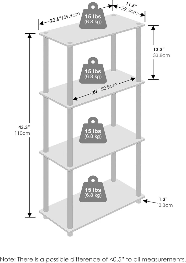 Number of Items in Set: 1 Required Tools: No Tools Required Product Care Instructions: Wipe With Dry Cloth, Avoid Using Harsh Chemicals gtin13: Does not apply Item Height: Bookshelf Shape: Rectangle Item Length: Bookshelf Door Mechanism: Open Face Item Width: Bookshelf Weight Limit: 60 Pounds Packaging: Flat Pack Back Style: Backless Maximum Weight Capacity: 60 lb Type: Shelf Unit Weight Capacity: Maximum Weight: 60 Pounds Material: Wood Composite, Engineered Wood, Polyvinyl Chloride Age Range (description): Adult Finish Type: Laminated Style: 4-Tier Round Tube Suitable For: Books Unit Count: 1.0 Count Personalized: No Item Weight: 14.5 lb UPC: Does not apply Features: Portable, Space Saving, Lightweight, Durable, Easy Assembly Size: 4-tier Round Tube Maximum Weight per Shelf: 15 lb Number of Shelves: 4 Number Of Items: 1 Furniture Finish: Finished Department: Adults Finish: Laminated Color: Espresso/Black Wood Tone: Not Specified Room: Home Office/Study, Office, Laundry Room, Living Room, Bedroom, Study Room Min. Required Door Width: 23.6 Inches Mounting: Free Standing Theme: Space Brand: Unbranded Product Dimensions: 11.6"d X 23.6"w X 43.25"h Installation Type: Freestanding Included Components: Shelf Panels, Assembly Insturction, Hardware Pack Additional Parts Required: No Set Includes: Shelving Unit, Shelf Panels, Assembly Instruction, Hardware Pack