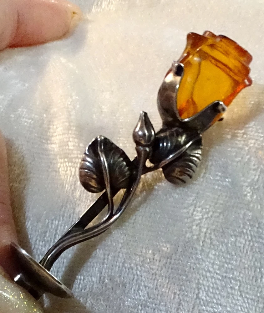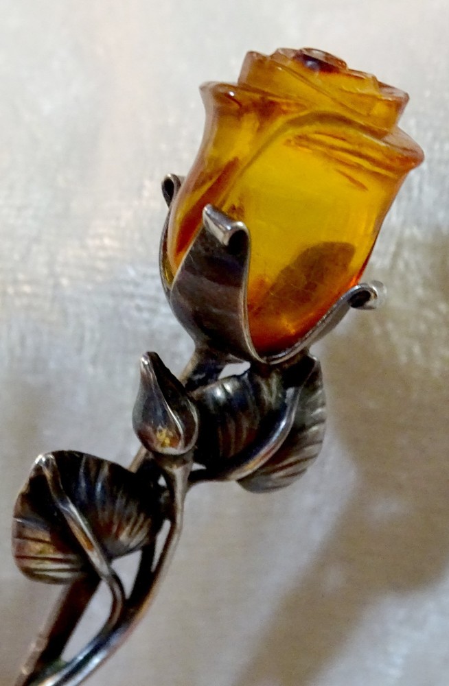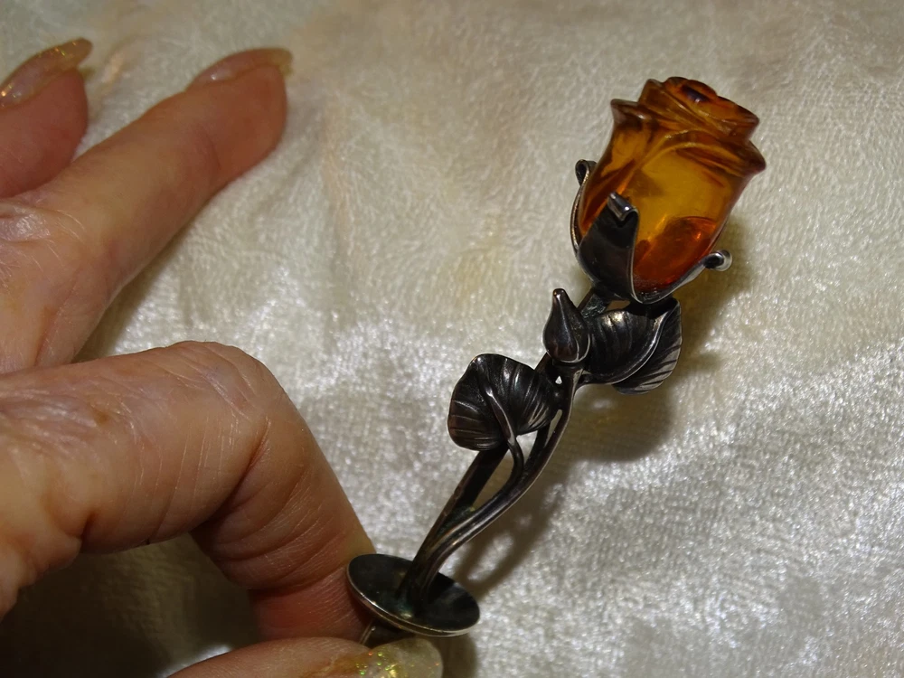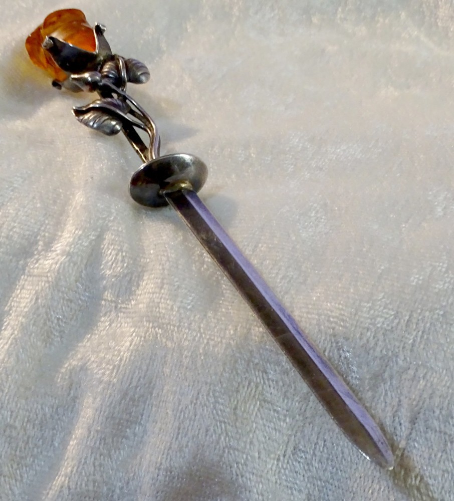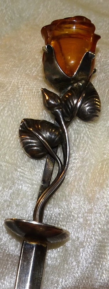 The Lovely Amber Rose 6" Very Strong Letter Opener is a vintage collectible made of a strong material and not signed. I have used it for several years with no problems opening just about anything, crafted in the United States. This elegant and sturdy letter opener features a unique design, making it a stylish and functional addition to any desk or office space. The hand carved amber rose is 1" long and with the stem and leaves almost 3". Its vintage appeal adds a touch of nostalgia to everyday tasks, while its strong material ensures durability for long-lasting use.