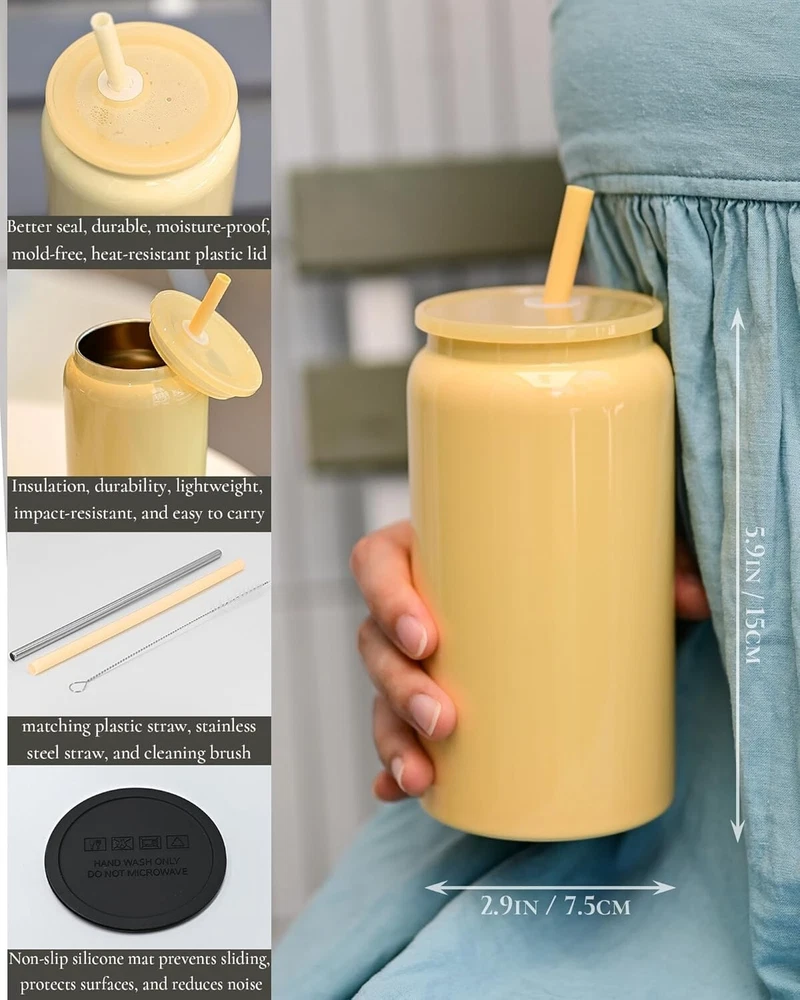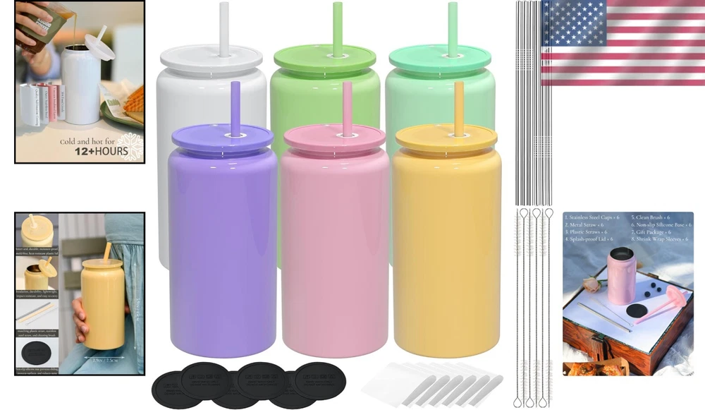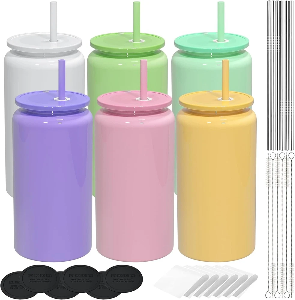 Reusability: Reusable Design: Cylindrical Item Weight: 10.4 ounces Color: Multicolor Unit Count: 6.0 Count Personalize: Yes Size: No Finish Type: Glossy Care Instructions: Dishwasher Safe Style: Smooth Number Of Items: 6 Occasion: All Occasions Material Feature: Unbreakable, Insulated Age Range (description): Adult Included Components: Lid, Coaster, Brush, Straw Material: Stainless Steel, 304 Stainless Steel, Polymer Coating Shape: Straight Material Type: Smooth Polished (sublimatable) Theme: No gtin13: Does not apply Features: With Lid, With Straw, Impact Resistant, Odor Resistant, Stain Resistant, Easy to Clean, Insulated, Lightweight Package Type: Standard Packaging With Adequate Cushioning Special Feature: Non-slip Recommended Uses For Product: Home Product Care Instructions: Dishwasher Safe UPC: Does not apply Department: Adults Brand: Unbranded Number of Items in Set: Six-Piece Capacity: 16 oz Pattern: Solid Set Includes: Cup Lid, Plastic Straw, Stainless Steel Straw, Cleaning Brush, Silicone Pad, Shrink Wrap, Box Package Material Type Free: Stainless Steel Product Dimensions: 3.14"w X 5.9"h Type: Cup Service For: 6 Glassware Type: Drinking Glass