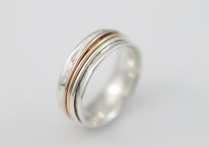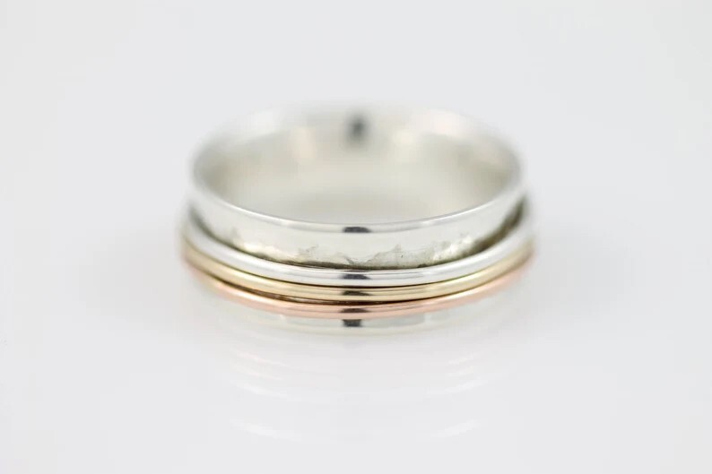 Find your center and experience a sense of calm with this beautifully crafted Tri-Color Spinner Meditation Ring. Designed with a narrow band of sterling silver, this ring features three complementary colors – silver, gold, and copper – creating a sleek and timeless design that’s both elegant and functional. Key Features: Material: High-quality sterling silver ensures durability and a beautiful shine. Tri-Color Design: A stunning combination of sterling silver, gold, and copper for a unique and eye-catching look. Spinner Band: The outer band spins smoothly, providing a soothing, tactile experience that can help reduce stress and promote focus during meditation or moments of anxiety. Perfect for Meditation & Mindfulness: Use this spinner ring to help focus your mind, calm your thoughts, or simply as a stylish accessory for everyday wear. Comfort Fit: The narrow band design offers a comfortable fit, making it suitable for daily wear. Whether you're seeking a tool to aid your meditation practice or just love the elegance of a beautifully crafted ring, this Tri-Color Spinner Meditation Ring is the perfect choice. Wear it as a reminder to stay grounded, mindful, and present.