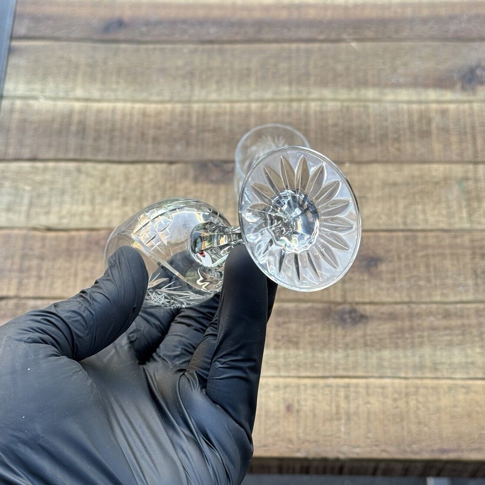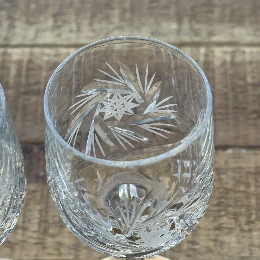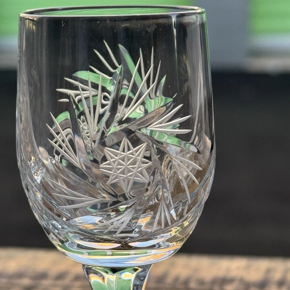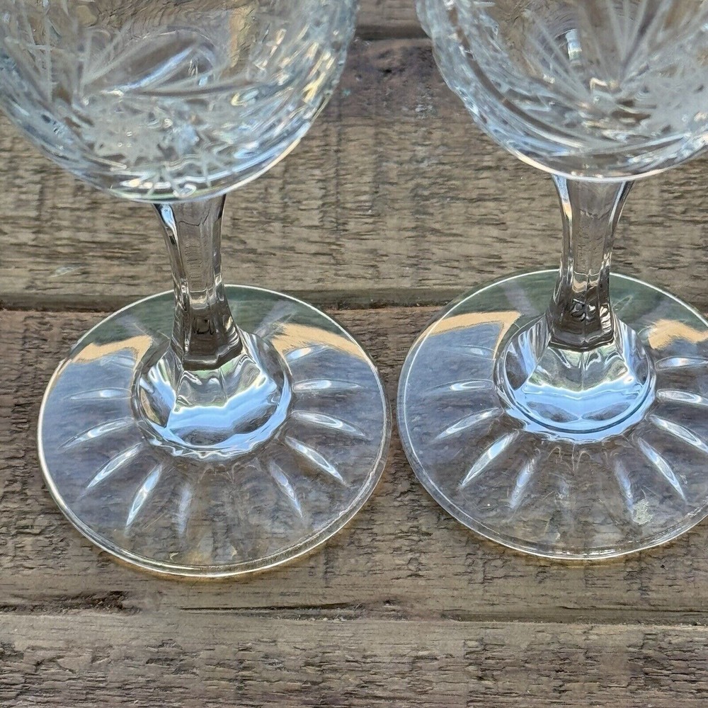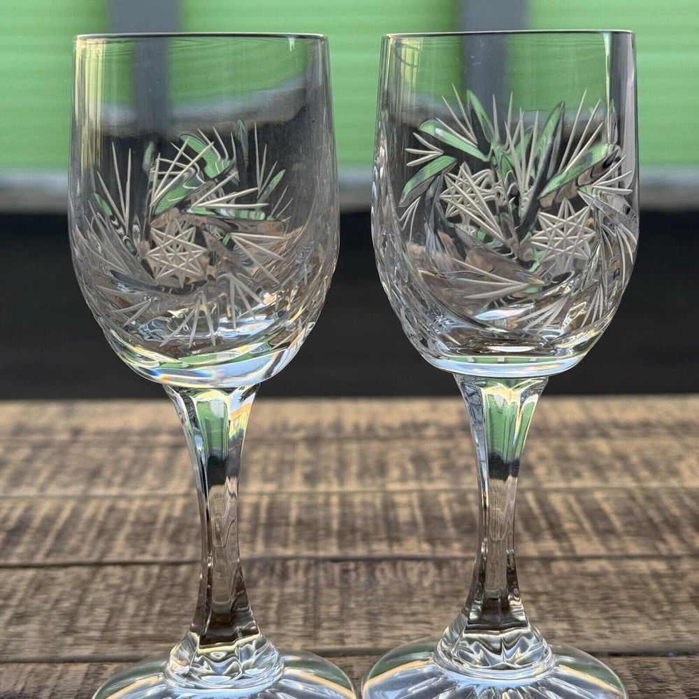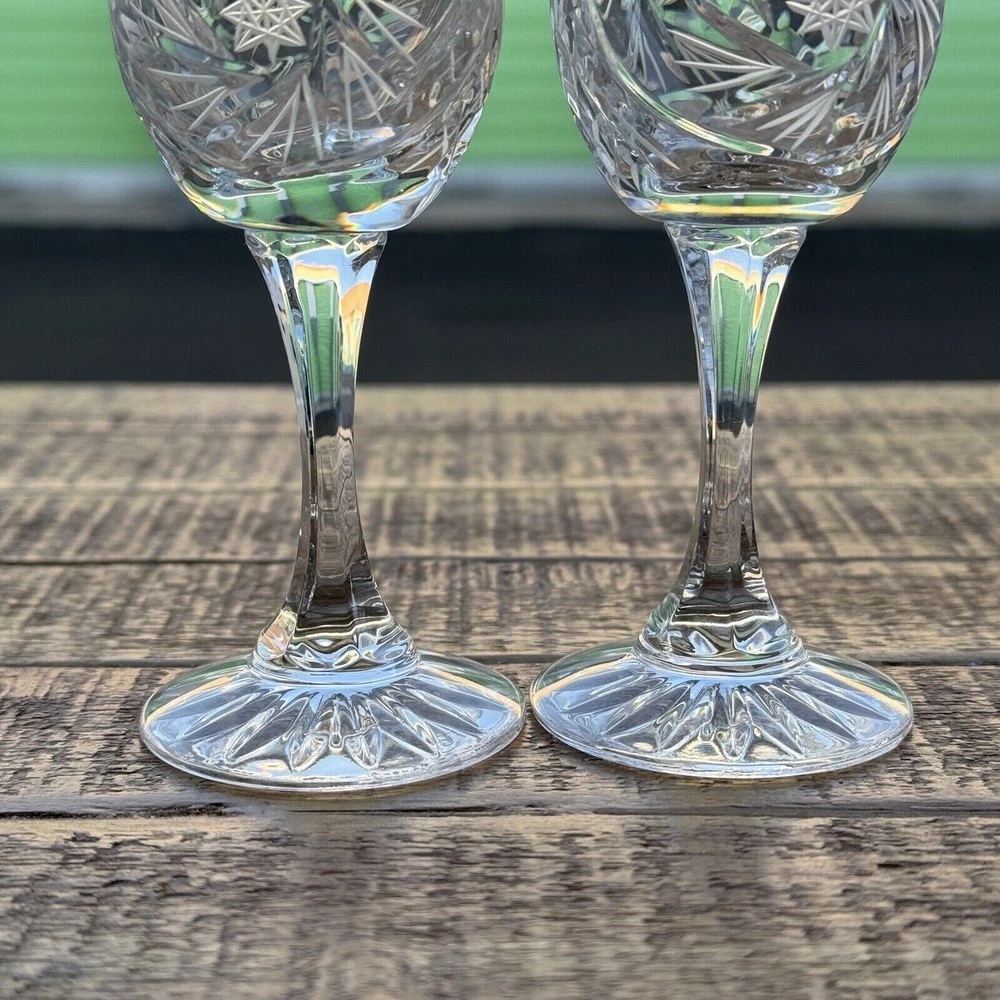The product is a set of 2 wine glasses made of clear crystal with a cut glass production style. These elegant wine glasses are perfect for serving wine in a luxurious and sophisticated manner.