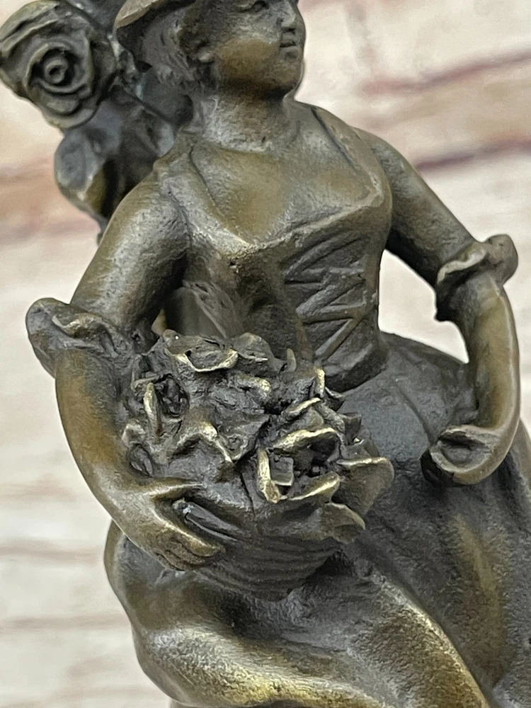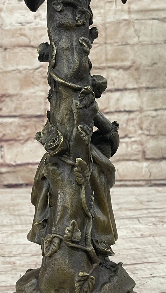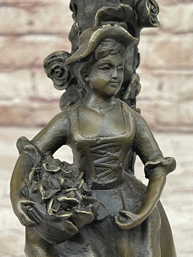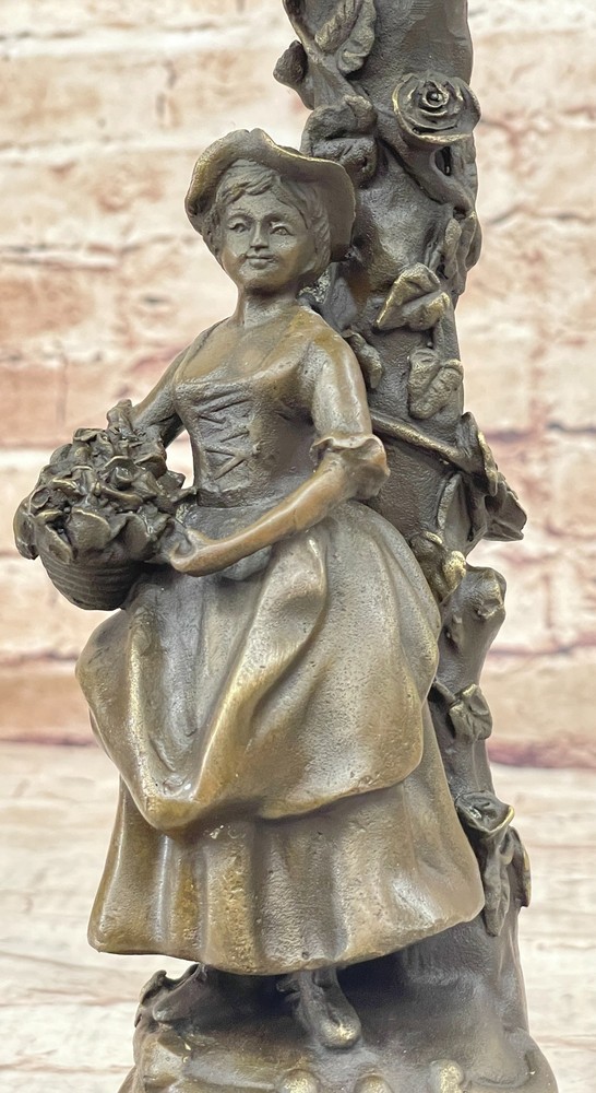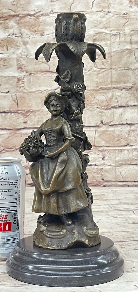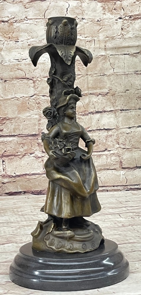 Elegant Maiden Woman Bronze Sculpture Candle Holder Art Deco Style Artwork Decor Elegant Maiden Woman Bronze Sculpture Candle Holder Art Deco Style Artwork Decor Condition : This sculpture is in perfect condition. Bronze Dimensions with Marble Base: Height 12" X Width 5" Marble Dimensions: Diameter 5" Height without base:11" Weight 8 LBS Inventory:84YCN0584648 Experience the captivating beauty of this Hand-Crafted Maiden Holding Flower Basket Candle Holder Bronze Sculpture, brought to life through the intricate artistry of the Lost Wax Method. Created by the skilled hands of artist Evan Stone, this stunning piece exudes elegance and charm. The maiden stands gracefully, her delicate features and flowing dress meticulously sculpted to perfection. Adding to the allure of this masterpiece is the inclusion of a candle holder, combining art and function. This dual-purpose sculpture not only captures the essence of the maiden's beauty but also provides an elegant way to illuminate your space. The dark bronze patina enriches the sculpture's details, adding depth and dimension to every curve and contour. Resting upon a sleek black marble base, this sculpture is a testament to the artist's talent and dedication. Each detail, from the flower basket to the intricate candle holder, reflects the commitment to craftsmanship. Signed by the artist Evan Stone, this bronze sculpture is a timeless addition to any collection, adding sophistication and artistry to your home or office. Hand Made Maiden Holden a Flower Basket Candle Holder Bronze Sculpture Video will open in a new window Using the eBay App? Paste link into a browser window: [isdntekvideo] Shipping Terms : Most of our items are shipped via USPS (United States Postal Service) mail or UPS. Most orders are shipped within 24-48 hours of purchase. Please be aware that not all items are available for USPS shipping due to size and weight. We do ship to Hawaii, Alaska, Canada, Puerto Rico, APO/AE, and U.S. Virgin Islands, however, an additional charge may be required. Please contact us before making any purchases in these areas. For Non-USA customers, you may be responsible for all duty, tax, brokerage fees that may be due upon delivery (shipping costs cover freight charges only). We also ship internationally. Please refer to the "Shipping and Handling" chart for the rates for each area. Payment : We accept just about any form of payment. PayPal, Master Card, Visa or American Express credit cards. Money orders, cashiers checks, and even personal or business checks. For governmental institutions, we will also accept a purchase order. Please understand that for personal or business checks we have to wait for the check to clear (usually 7 days) before shipping. Condition : New Detailed Hand Crafted Hot Cast Bronze Satisfaction Guaranteed. This is Stock Photo, Slight Color Variation!! Listing and template services provided by inkFrog