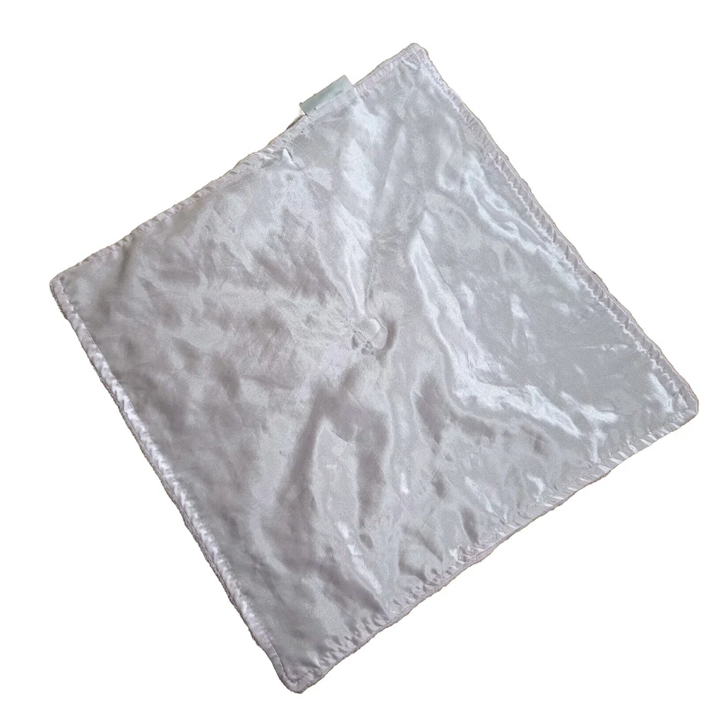 Elegant Baby Flower Lovey Pre-owned condition. Free of stains. Satin side has several hairline runs/pulls. No rips or tears. Material tag missing Plush textured side with flower, bottom has satin, no crinkle sounds Square, 12.5 x 12.5 inches