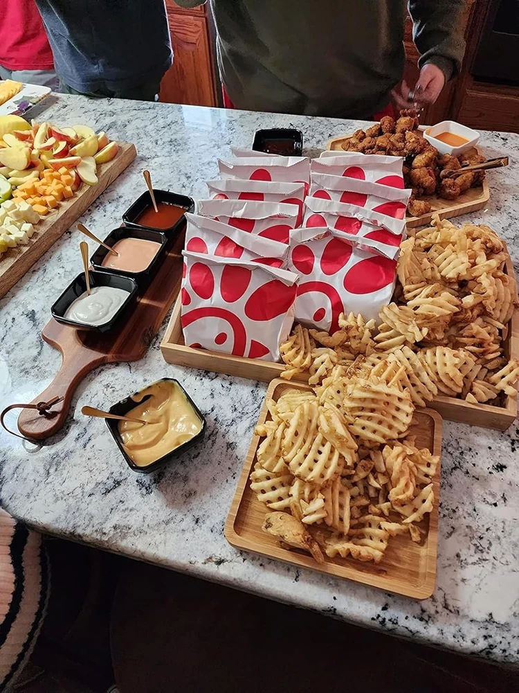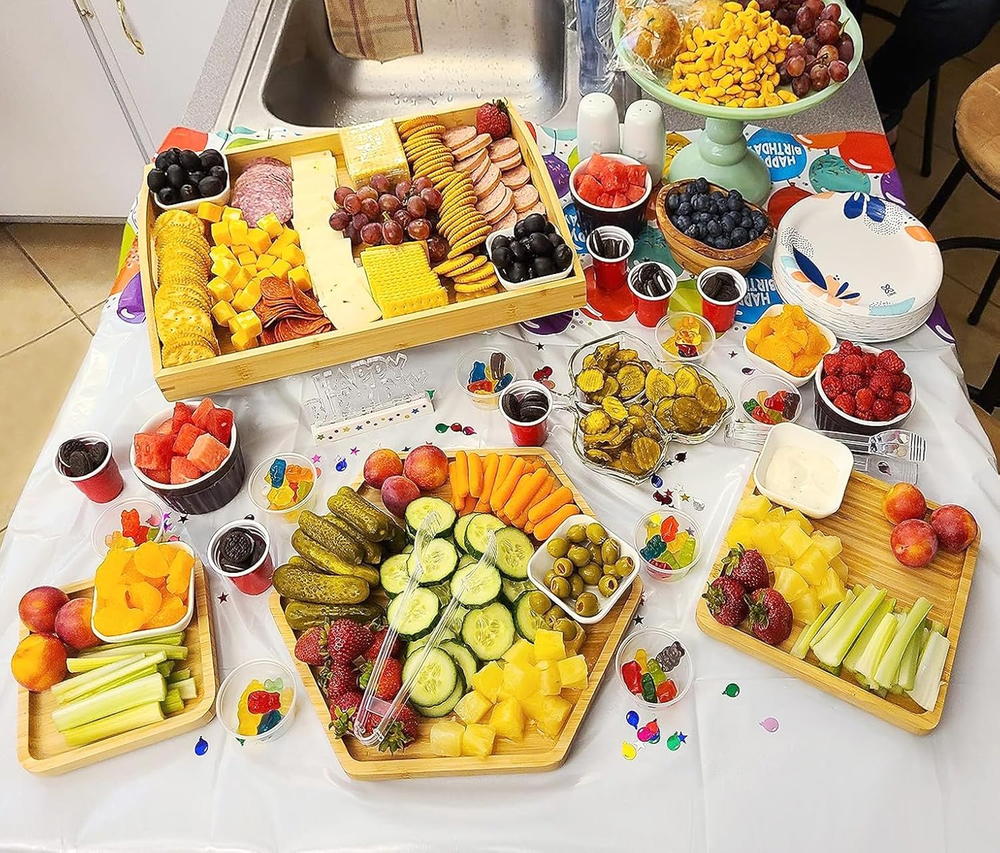 WE UPDATE THE Craft Process Method TO SOLVE THE BROKEN PROBLEM. Natural bamboo material with high temperature steam good for healthy Big size 16.5"x11.8"(42x30cm) with handle rectangle dinner plate food wouldn't fall out. 1hexagon+2square small plates: 1xHexagon 12.5"(32cm)+1xSquare 7.8"(20cm)+1xSquare 5.9"(15cm) Just hand wash the plates but do remeber not to put it in dishwasher or expose in the sunlight. Renewable bamboo livespan less than wooden for better protect environment we recommend use bamboo. Product Description Enjoy your life, Enjoy your family time with PAFREWOG Dinner Plates Set -PAFREWOG bamboo round design -Gorgeous work of art for everyday use & decoration -Sweet gift for any occasions There are 3 specification for small plate 1hexagon+2square small plates: 1xHexagon 12.5"(32cm)+1xSquare 7.8"(20cm)+1xSquare 5.9"(15cm) 2hexagon+1square small plates: 1xHexagon 12.5"(32cm)+1xHexagon 9.8"(25cm)+1xSquare 5.9"(15cm) 4square small plates: 2xSquare 7.8"(20cm)+2xSquare 5.9"(15cm) 1hexagon+1rectangle+1square small plates: 1xHexagon 12.5"(32cm)+1xRectangle 9.8"(25cm)*5.9"(15cm)+1xSquare 5.9"(15cm) 1hexagon+1square+1circle small plates: 1xHexagon 12.5"(32cm)+1xSquare 7.8"(20cm)+1xCircle 7.8"(20cm) Cleaning Notification: 1. Dishwasher is not allowed. Hand wash the dinner plates set with soapy water and dry it . Wipe with oil after use if it is possible to ensure the lifetime. 2. DO NOT use steel wool, harsh detergents or abrasive cleansers which may scratch the surface of the bamboo plates. 3. DO NOT soak in the water for a long time. 4. DO NOT put in microwave, dishwasher, oven, freezer.