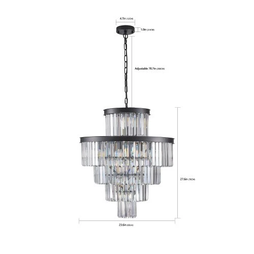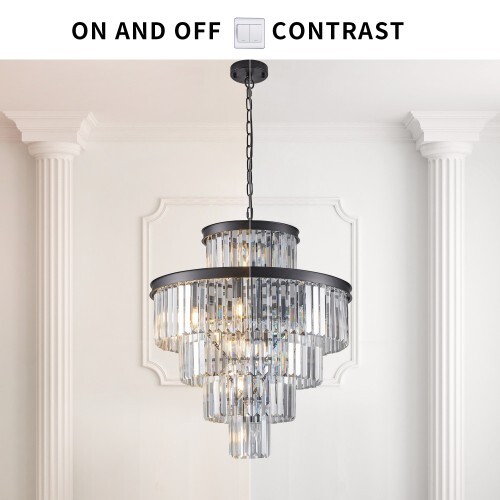 Description 23.6 Inches Black Luxury Crystal Chandelier:Composed of premium K9 crystals and black finish metal base, clear crystal prisms on large round iron chrome finished frames. Total of 5-tier sparkling crystals. Luxurious and contemporary design, perfect for home decor which will make your house look stunning. Size : Width 23.6" x Height 27.6" .Please ensure dimensions of this crystal chandelier light fixture is fit for your prepared space or not. Bulb Requirement:This crystal pendant light need 15 x E12 bulbs (Max 60-watt, This product does not contain a light source) .Ideal Indoor Decoration: This Modern luxury style chandelier is perfect for wide application, kitchen island, living room, dining room, enterway, hallway, foyer, corridor, stairway, bars, cafes, hotels, and restaurants, etc. Features Shine Bright Like a Diamond:selected the TOP K9 crystal and the highest standards in the industry have been adopted from the manufacturing stage. Modern Crystal Chandelier with finished is a beautiful piece. With its sophisticated beauty and stunning details will fits your every space. E12 Bulb*15 Required Chandeliers: compatible with E12 LED bulb, Incandescent, energy-saving, halogen, etc. The brightness depends on the bulb you put in, if you want brighter light, please use high-watt E12 bulb(60w max),The chandelier it’s compatible with dimmable bulbs and wall switch. Chandelier Light Fixture Size: Crystal chandeliers with 23.6 inches wide and 27.6 inches high. Please check the size of the chandelier lighting fixture before purchasing. Simple Assemble: Crystals come in 1 sizes, each crystal strand needs to be hanged one by one. When the chandelier lights up for a moment, everything is worthwhile all the effort will be transformed into your smile. Suggested Space Fit: Securely wrapped crystal high ceiling light fixture. light up your Living Room, Dining Room, Porch, Staircase, Foyer, Hallway, add some elegance to your home with this crystal chandelier ceiling light.
