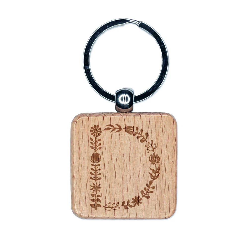 Elegant Botanical Floral Letter D Engraved Wood Square Keychain Tag Charm