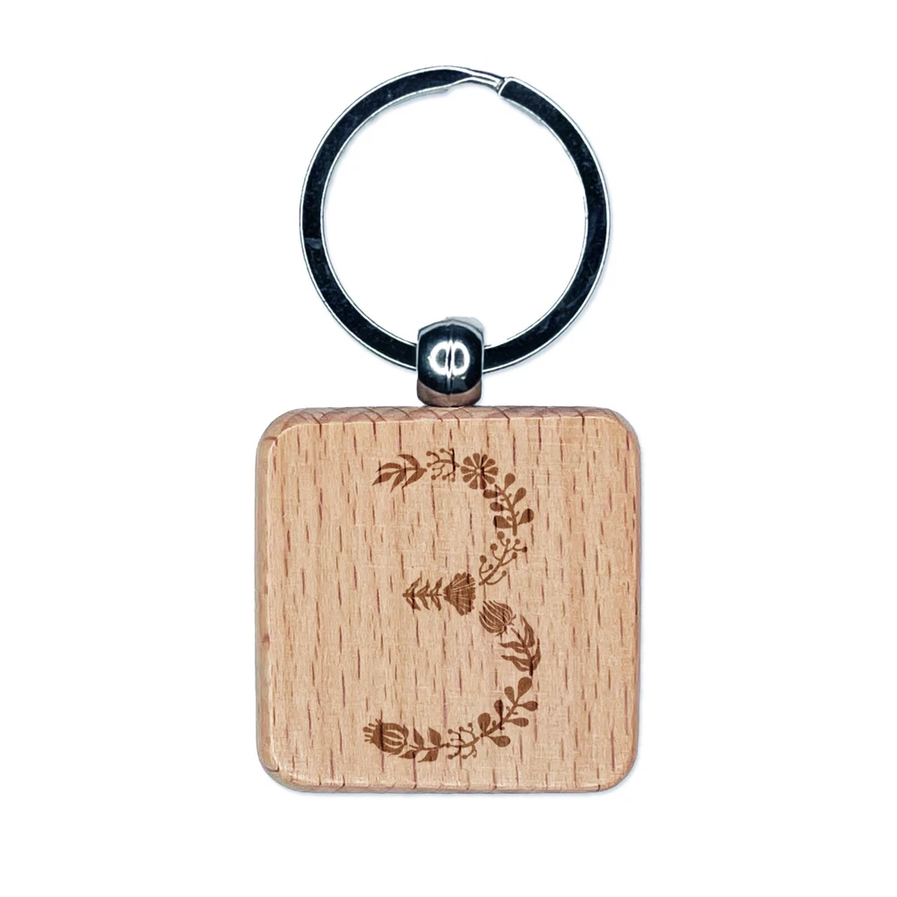 Elegant Botanical Floral Number 3 Engraved Wood Square Keychain Tag Charm