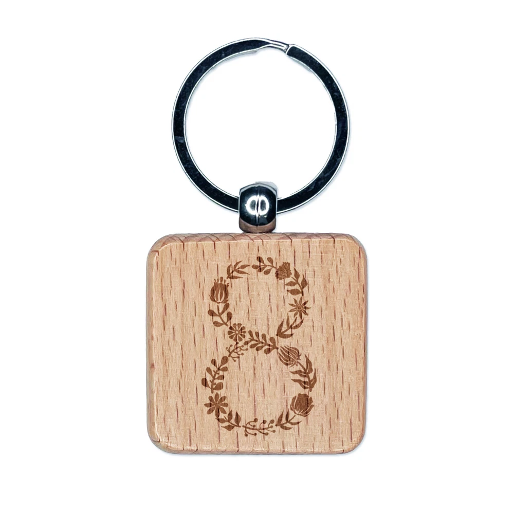 Elegant Botanical Floral Number 8 Engraved Wood Square Keychain Tag Charm