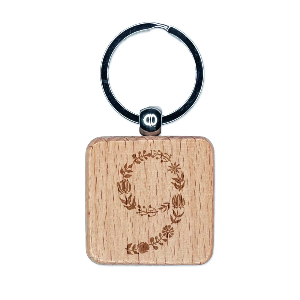 Elegant Botanical Floral Number 9 Engraved Wood Square Keychain Tag Charm