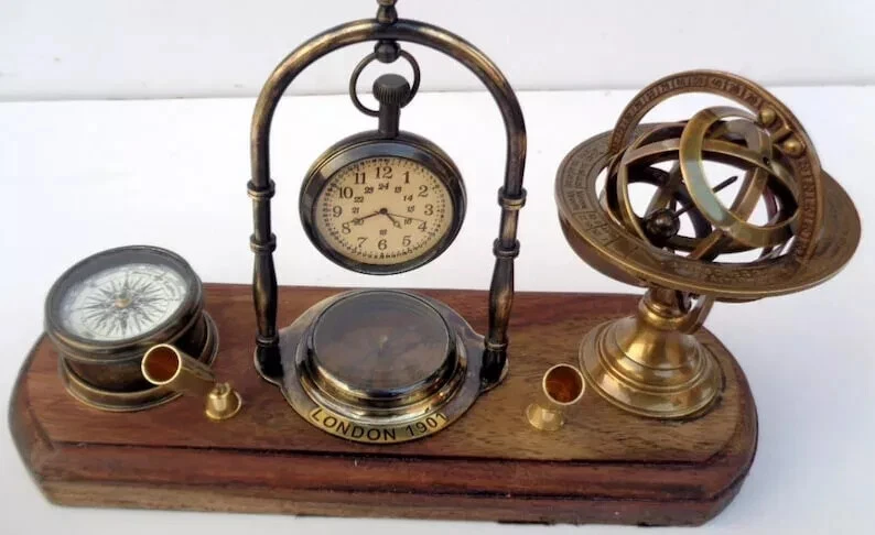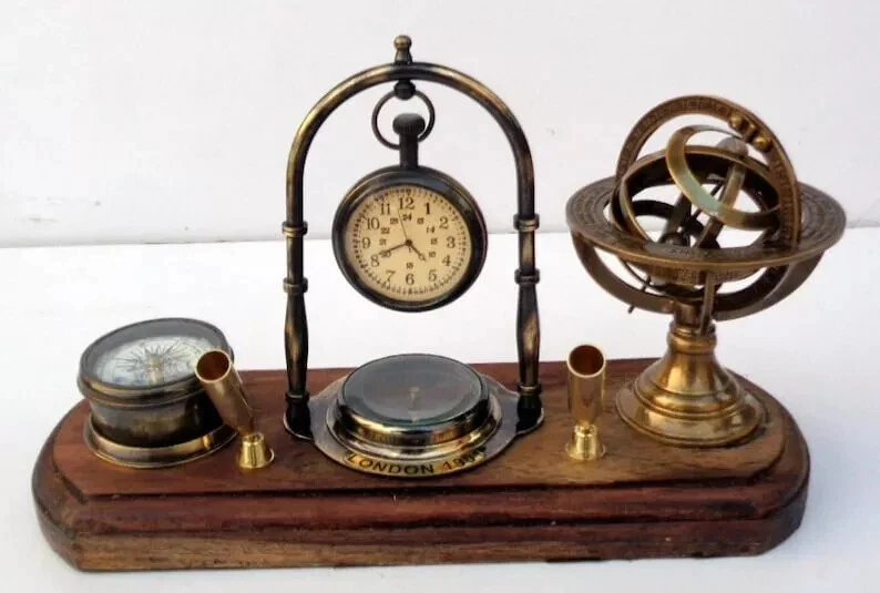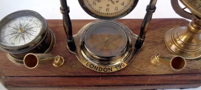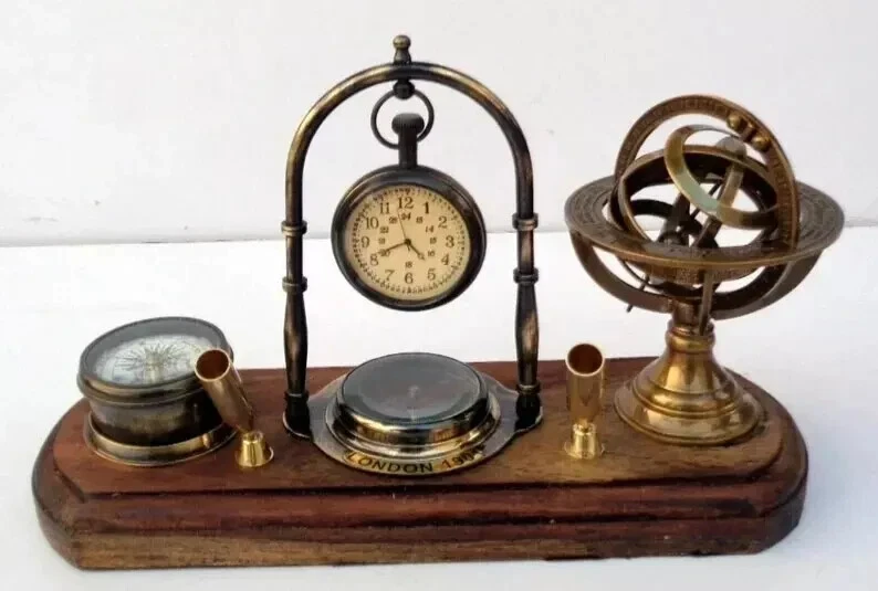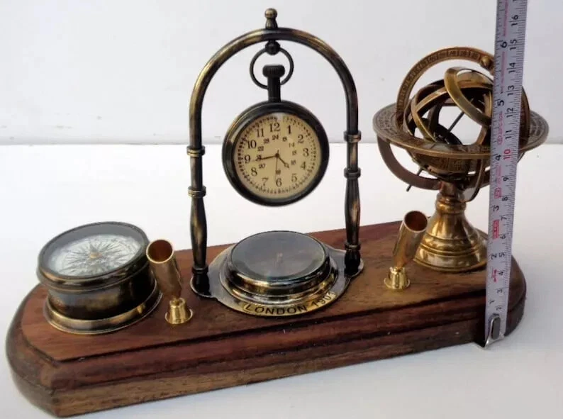 Brass Tabletop Clock with Pen Holder, Compass & Armillary Sphere – Vintage Desk Décor Elegant & Functional Antique Reproduction Enhance your workspace or home décor with this exquisite handcrafted brass tabletop clock featuring a pen holder, compass, and armillary sphere . This vintage-inspired piece is a perfect blend of utility and sophistication, making it a timeless gift for professionals, collectors, and antique enthusiasts. Product Specifications: ✅ Material: Premium Brass & Wood ✅ Finish: Brass Polish Finish for a classic vintage look ✅ Size: ✔ Length: Approx. 11 inches ✔ Width: Approx. 4 inches Why Choose This Unique Antique Desk Clock? ✔ Vintage Elegance – A perfect blend of heritage design and functional appeal ✔ Premium Quality Craftsmanship – 100% handcrafted in India by skilled artisans ✔ Perfect Gift Idea – Ideal for antique lovers, executives, and history enthusiasts ✔ Multi-Functional Design – Combines a clock, pen holder, compass, and armillary sphere ✔ Collector’s Item – A must-have for vintage collectors and interior decorators Ideal for Various Settings: ✨ Home & Office Décor – Adds a touch of vintage sophistication to your desk ✨ Gifting – Perfect for birthdays, anniversaries, corporate gifting, and holiday presents ✨ Nautical & Antique Collectors – A remarkable piece for those who appreciate historical artifacts Shipping & Delivery: 📦 Fast & Secure Shipping – We dispatch within the given working days after payment confirmation via trusted couriers (FedEx, DHL, TNT, or EMS). 🚚 Tracking Provided – A tracking number will be shared after dispatch. ⏳ Estimated Delivery Time: Delivery typically takes a few working days, but may vary due to customs clearance, address changes, or transit conditions . Customs & Import Duties: 📌 Important Note: Buyers are responsible for import duties, VAT, and other customs fees in their respective countries. 📌 Check with Customs: Please confirm these additional costs with your local customs office before purchasing. Customer Support & Satisfaction Guarantee: 💬 Have Questions? Contact us via the eBay Message system or click "Ask a Seller" below. We respond within 24 hours . ⭐ 100% Customer Satisfaction Guaranteed – If you have any issues, reach out to us, and we’ll ensure a fast and effective resolution . Special Offers: 💰 Exclusive Discounts for Bulk & Wholesale Orders! Contact us for special pricing. 🎁 Add this timeless antique brass tabletop clock to your collection today!