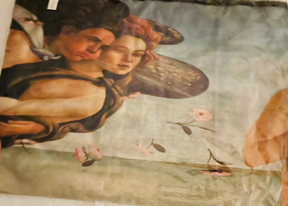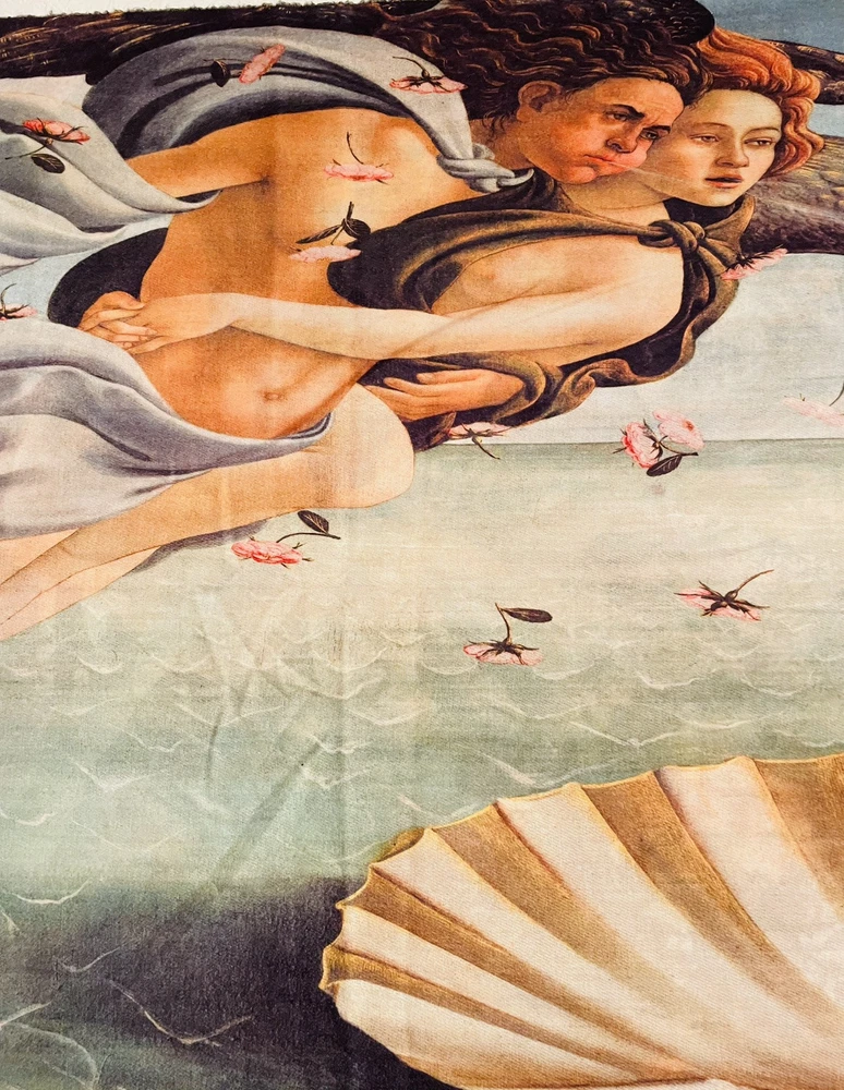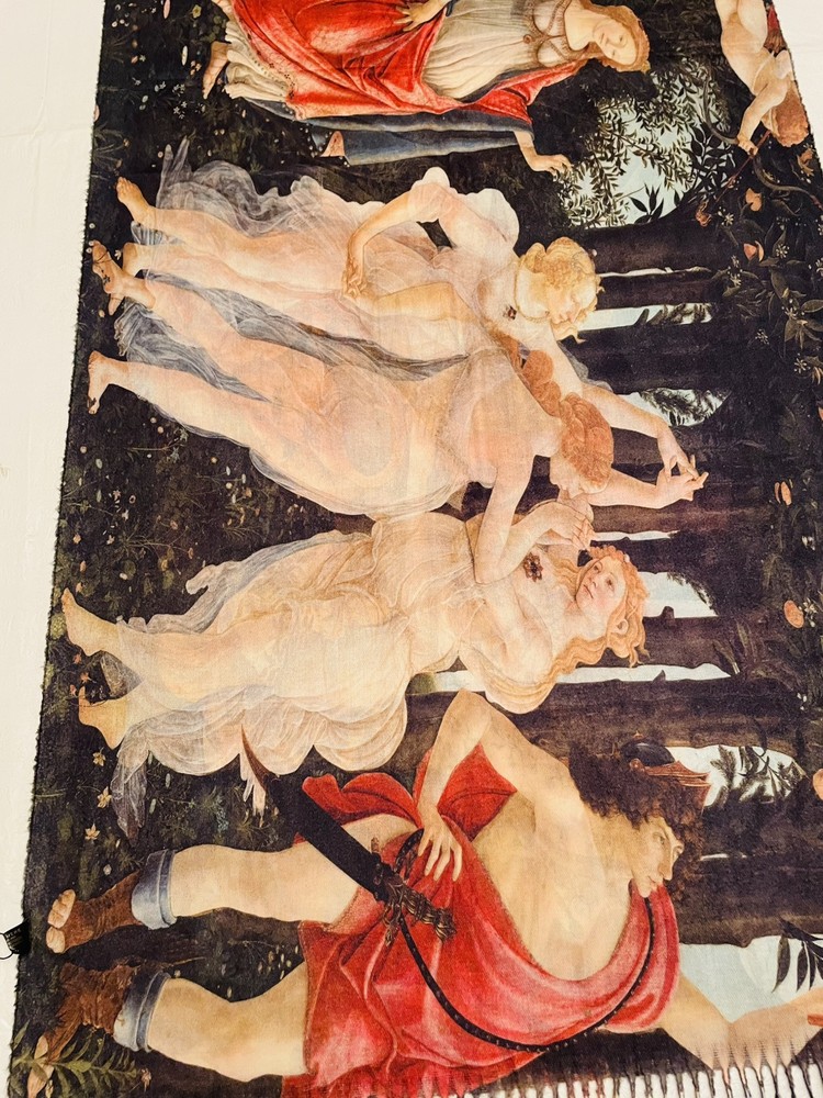 The scarf is reversible. On one side is the reproduction of Sandro Botticelli the famous painting "Primavera" and other side- ''The Birth of Venus'' Unique, luxurious, high-quality, soft, warm, durable, elegant and versatile Size: 72''x 28'' and 80'' x 28'' with fringe Viscose 50% and cashmere 50% Was purchased in Europe. New with tag. From clean, smoke-free environment. Please check my collection for more impressionist artist design scarves.
