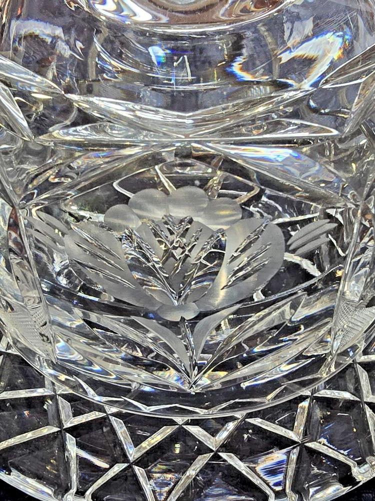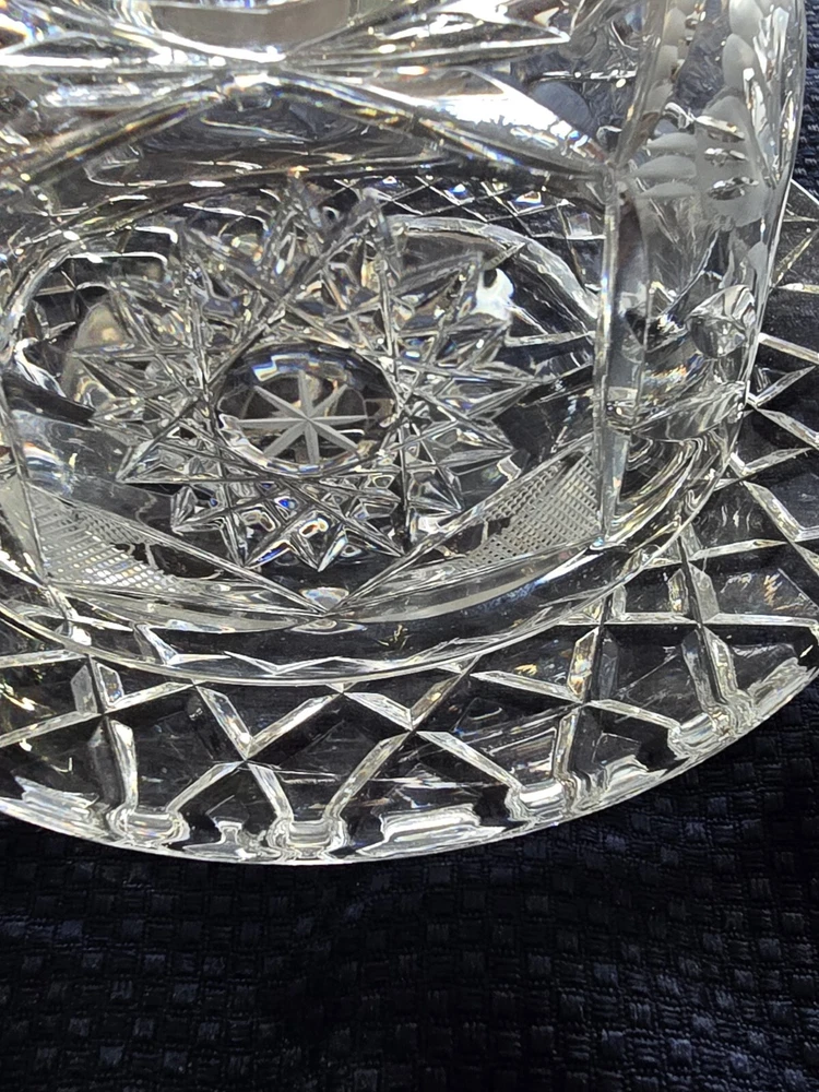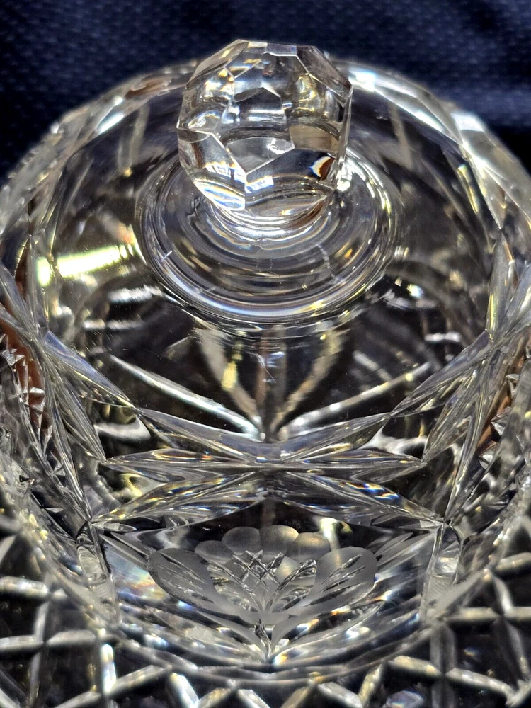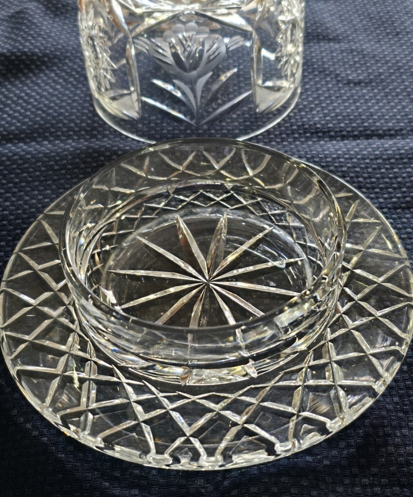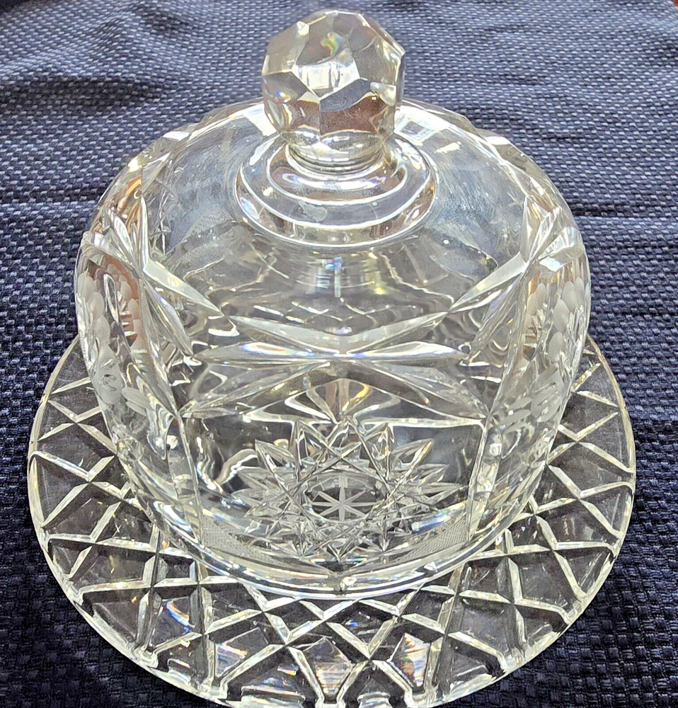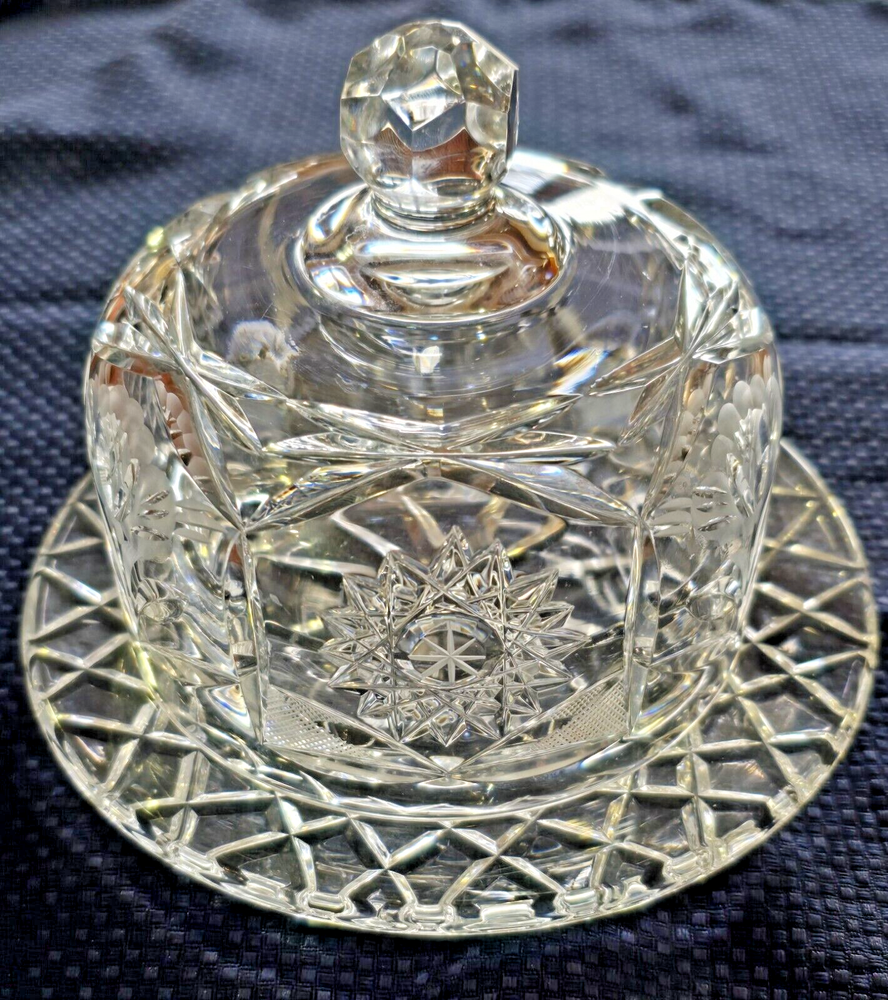 This is a beautiful yet useful heavy crystal cut glass covered cheese or butter dish. The plate with the attached bowl is 6 1/2" wide, the bowl itself is 4", the height from the bottom to the top of the knob is 5" and the weight is 2 lbs 12 oz. This would be a nice flourish to an elegant table setting!