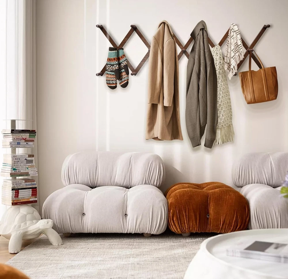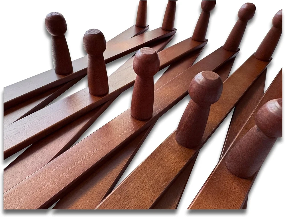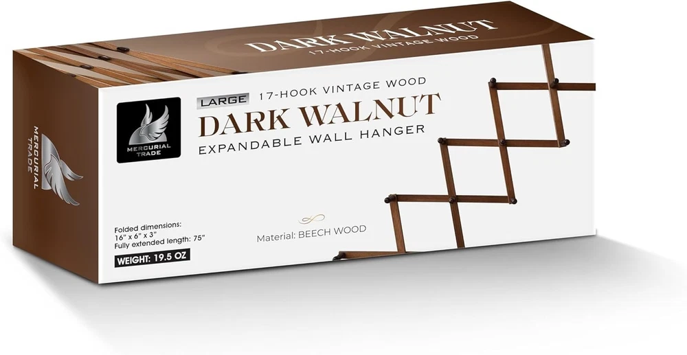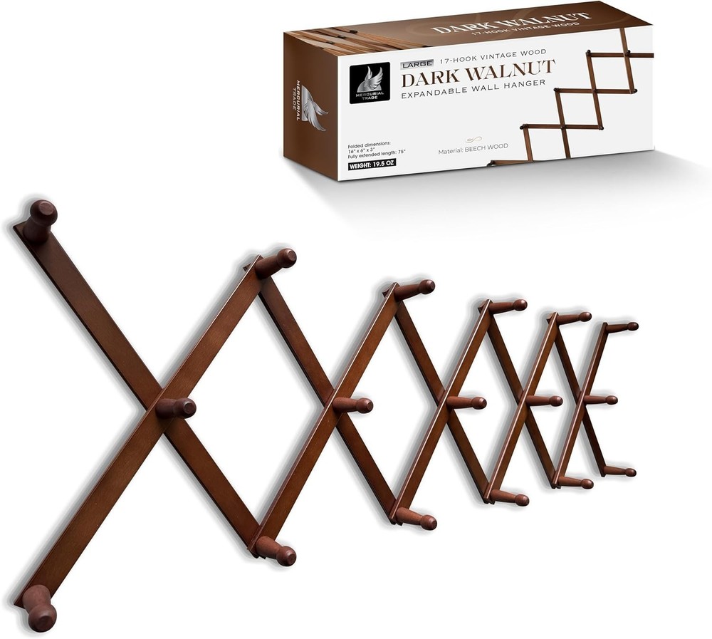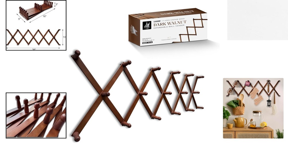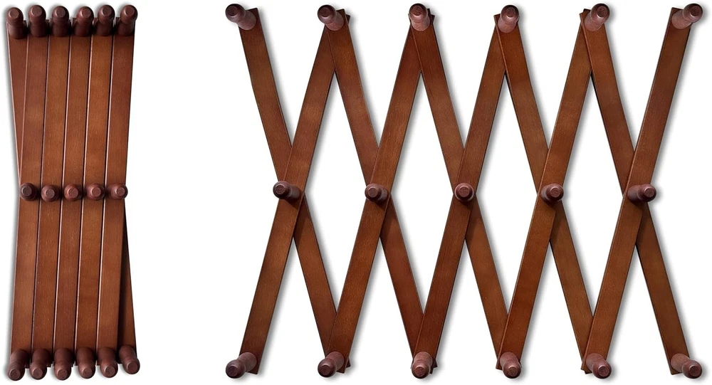 Elegant Dark Walnut Expandable Wooden Coat Rack with 17 Wall Mounted Hooks