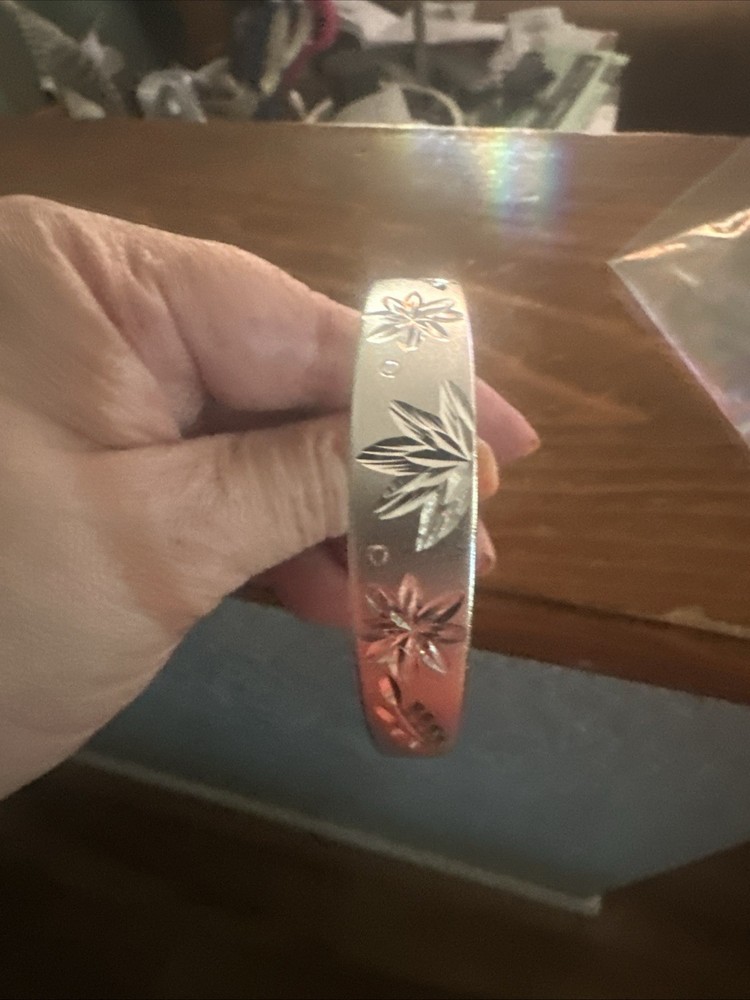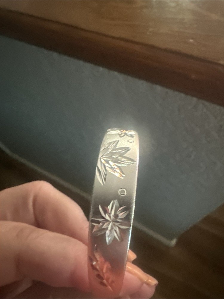 This bracelet is a beautifully crafted piece of 925 sterling silver, adorned with intricate engraved flowers. With a bangle style and a slide closure, it makes for a perfect gift for various occasions such as Mother's Day, Christmas, birthdays, anniversaries, and Valentine's Day. The vintage design of the bracelet adds a touch of elegance and love, making it a meaningful piece for your loved ones. Signed and crafted with quality in mind, this bracelet is a timeless and inspirational accessory for any jewelry collection.
