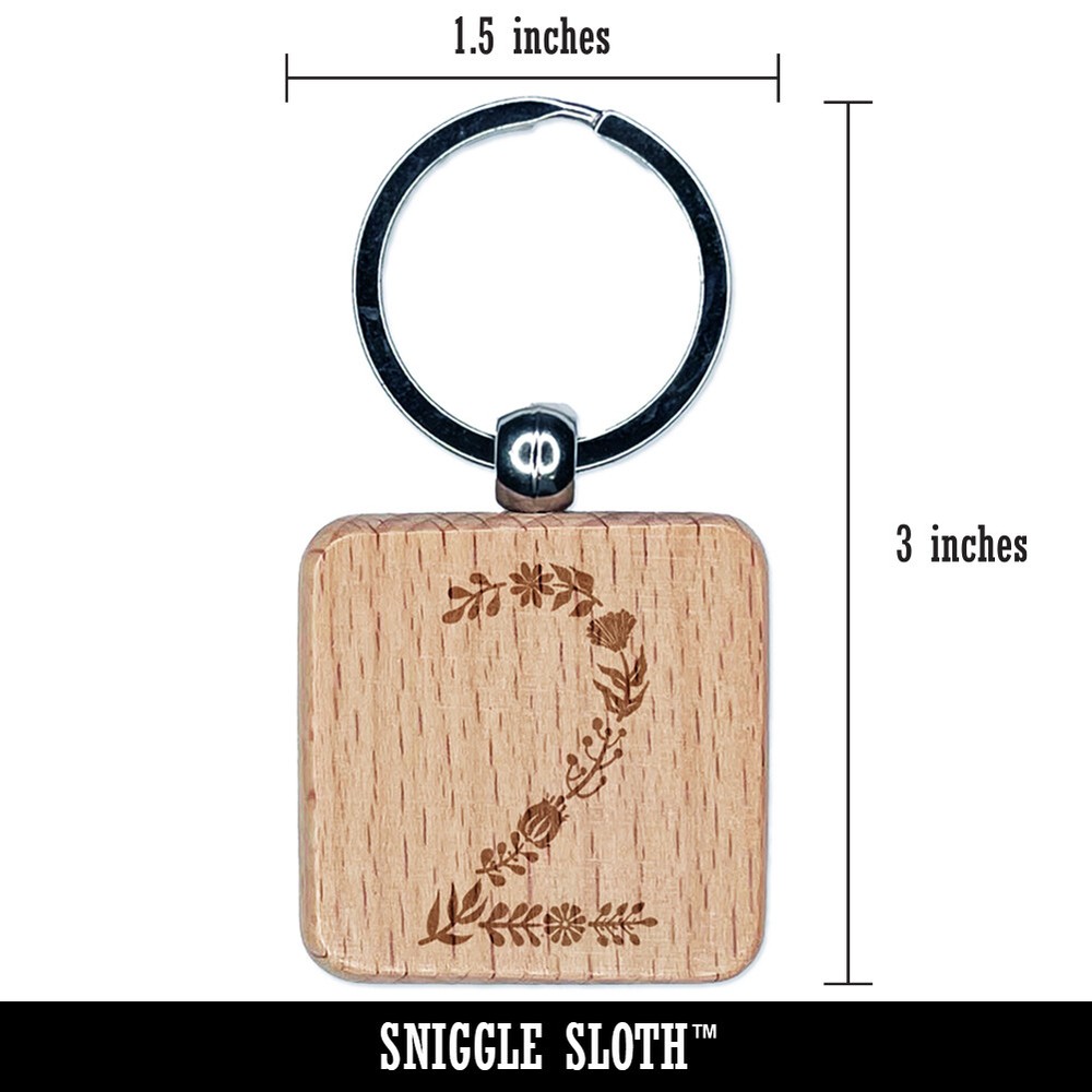 Elegant Botanical Floral Number 0 Engraved Wood Square Keychain Tag Charm