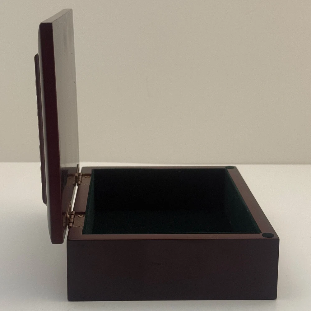 Wooden Jewelry Box with Floral Metal Inlay – 7.5 x 5.5 x 2 inches. Pre-owned item in good condition. The wooden box shows some scratches on the bottom from previous use, but the exterior and floral metal inlay are well-maintained. The velvet interior remains in good condition. Ideal for storing jewelry or trinkets, this box is both functional and stylish. Please refer to the photos for a closer look at its condition. The pictures are of the exact item you will receive. Please check the photos for more details. Please note that this item might have a slight smell of smoke due to storage and the cardboard box used for shipping. We take great care in cleaning and carefully packing the item to minimize any potential odors. Additionally, we prioritize fast shipping to ensure the item arrives quickly and in excellent condition. If you have any concerns, feel free to contact us before purchasing. Thank you for your understanding!