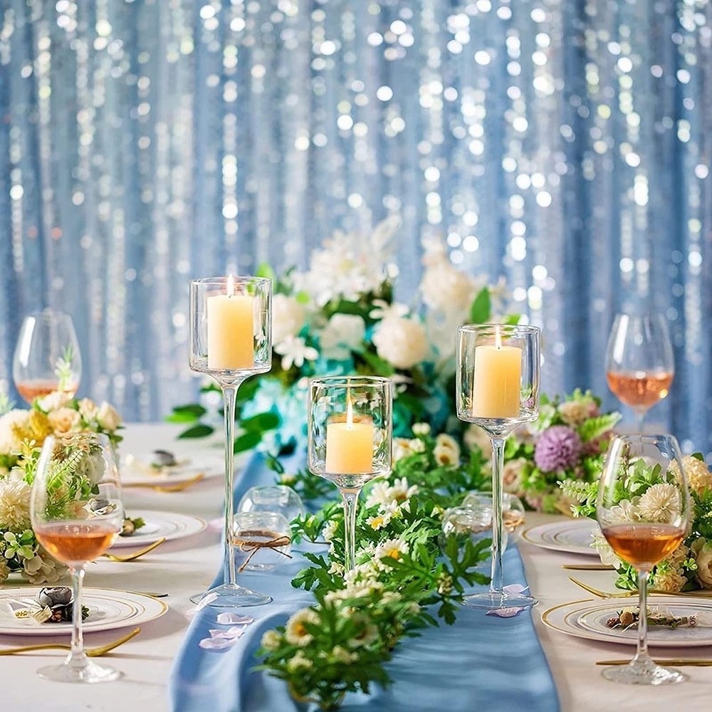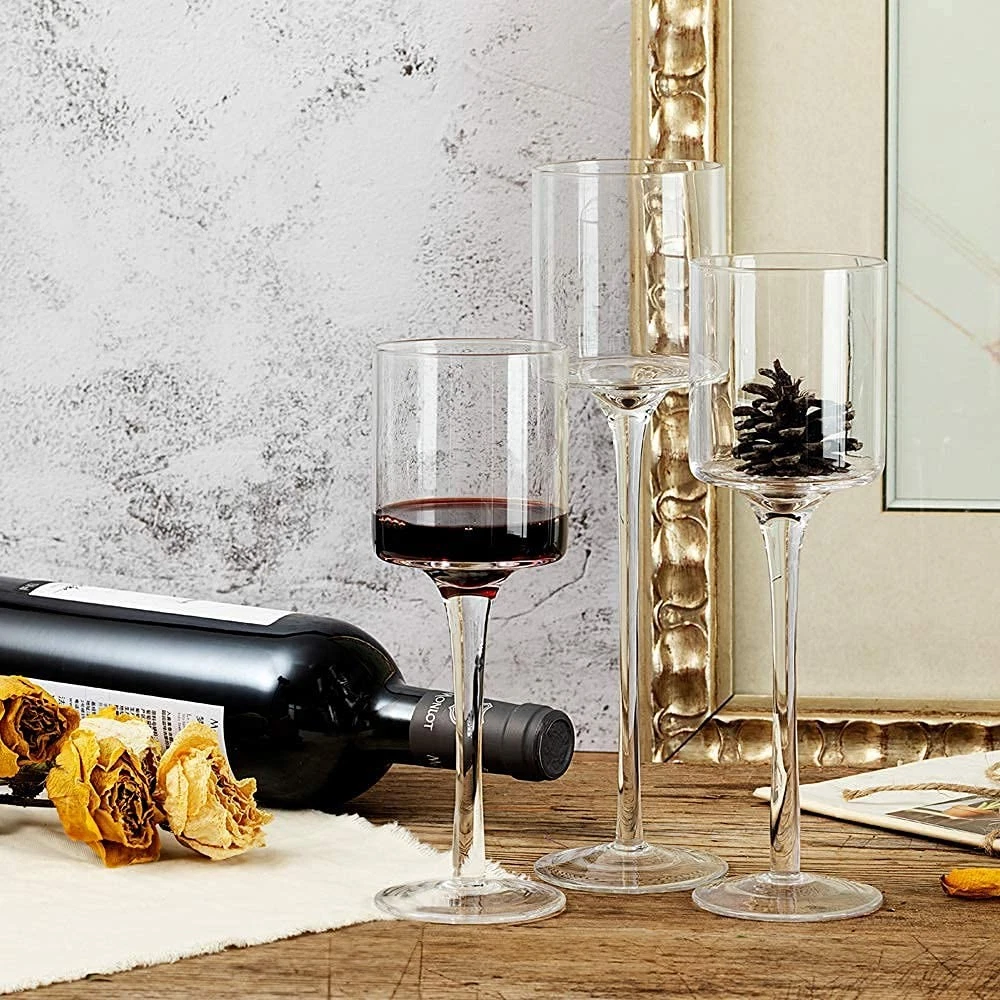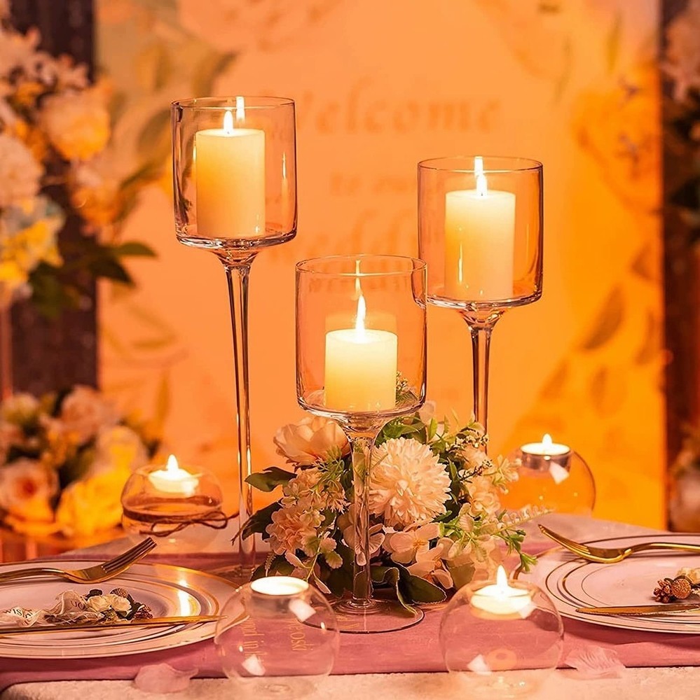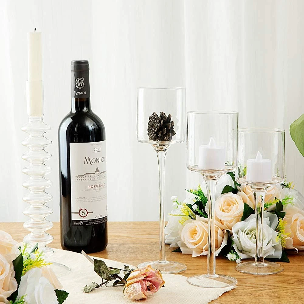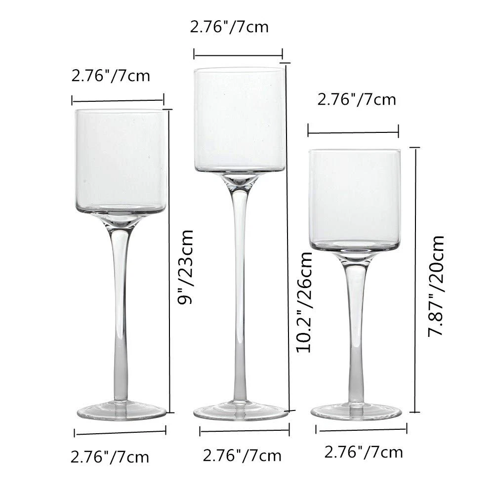 Package Include: 3 Pieces (S M L)tall glass candle holders. Holds three candles (not included). Material: Glass. Color: Clear. Size: High - small 20cm, medium 23cm, large 26cm; Diameter - 7.5cm. Package Dimensions: Boxed 23 x 33 x13cm. Suitable for use with real and LED candles. PACKAGE INCLUDES: 3pcs hurricane glass candle holder for table centerpiece (3 Heights: 7.87"/ 9"/ 10.2"). Candles for decoration in the pictures are not included. MULTI-PURPOSE: The floating candle holder can hold many different types of candles. Whether they are scented or unscented, candle holders, cylindrical candles, floating candles, LED candles or small tea wax, our long stem glass candle holders will make your candles look more beautiful. ELEGANT DESIGN: Each clear candle holder has a long stem and is very transparent, so you can see beautiful candles. These brackets are decorative and functional. This candle holder has many functions and can store candles or small desserts. APPLICATION: These modern and stylish candle holders add the perfect highlight to your home, garden or event decoration. It is a great decoration for weddings, birthdays, celebrations, parties and candlelight dinners. It can also be a creative gift for parents or friends. Exquisite gift box packaging. AFTER-SALES SERVICE GUARANTEE: Please feel free to contact us for any assistance or questions after receiving the glass candle holder. A satisfactory solution will be offered in 12 hours (usually much faster).